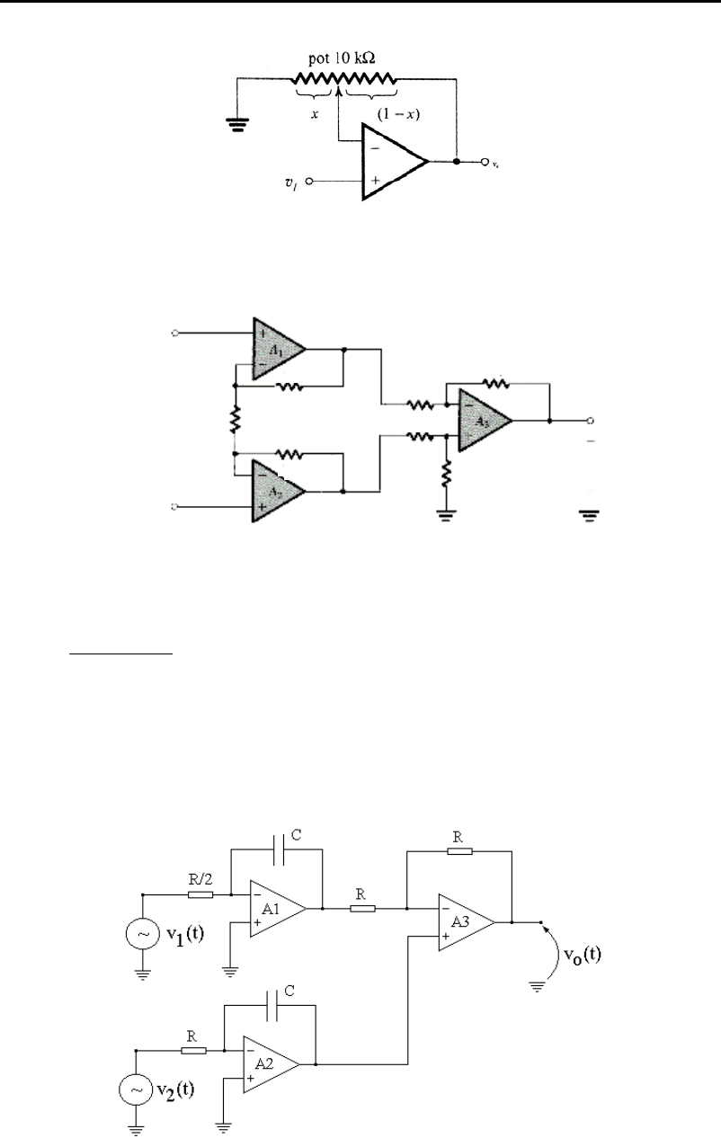 PSI3321 - ELETRÔNICA I – 1a LISTA ADICIONAL DE EXERCÍCIOS 1a (Prova REC 2007) Dado o circuito abaixo: (a) Deduza a expressão v0 em função de vI e x. (b) Qual a faixa de valores que pode ser obtida para o ganho com x variando de 0 à 1. (c) Mostre como a partir da colocação conveniente de um resistor (desenhe o novo circuito ) com valor fixo de modo que a faixa de valores para o ganho possa variar de 1 a 11. Qual o valor deste resistor? 2) (2a. prova 2002) Dado o circuito de um amplificador de instrumentação abaixo: V-ΔV/2 V+ΔV/2 vO R4-ΔR R4+ΔR R1 R3 R3 R2 R2 (a) Considerando-se todos os componentes ideais, e no caso de termos resistores precisos (ΔR = 0), deduza a expressão do ganho diferencial Ad = vO/ΔV. (b) Na condição do item (a), calcule Ad para R1 = 10 kΩ e R2 = R3 = R4 = 100 kΩ. (c) Considerando-se que os resistores R4 (ΔR ≠ 0) estejam desbalanceados, obtenha a expressão de vO do tipo: vO = Ad.ΔV + Ac.V. OBS.: Considerar R 3 + R 4 − ΔR ≅ 1 R 3 + R 4 + ΔR (d) Considerando-se os mesmos valores do item (b) e a variação em R4 de 1 % (ΔR = 1 kΩ), calcule o ganho diferencial (Ad), o ganho em modo comum (Ac) e a taxa de rejeição de modo comum (CMRR = 20log (Ad/Ac). (e) Qual a impedância de entrada do amplificador de instrumentação considerando que os amplificadores operacionais são ideais ? Justifique. 3) (1a. prova 1999) Dado o circuito eletrônico abaixo onde foram empregados amplificadores operacionais ideais (Ao →∞, Zin →∞ e Zout →0): (a) Determine a expressão de vo(t) como função dos sinais de entrada v1(t) e v2(t). (b) Redesenhe o circuito anterior com apenas um amplificador operacional e apenas dois capacitores. Não há limite quanto ao número de resistores a serem escolhidos. Por outro lado, o circuito redesenhado deve ter a mesma relação funcional entre o sinal de saída vo(t) e os sinais de entrada v1(t) e v2(t) do item (a). adm-sgsantos Note Unmarked set by adm-sgsantos adm-sgsantos Note Accepted set by adm-sgsantos adm-sgsantos Note Completed set by adm-sgsantos 20 kΩ + 20 V 20 kΩ + 30 V 10 kΩ + 10 V + 4 V + 2 V 5) (Prova-2012) Desenhe um circuito utilizando 3 amplificadores operacionais e outros componentes passivos necessários para realizar a função vo(t) abaixo tal que a resistência de entrada para os sinais v1(t), v2(t), v3(t) e v4(t) seja igual a 4kΩ. Qual deve ser o produto RC do circuito integrador e a carga inicial do capacitor ? ( )dt)t(v)t(v)t(v)t(v)t(v t o ∫ −+−= 0 43212 6) (Prova-2005) Considerando-se os diodos abaixo ideais, calcule os valores das tensões e das correntes indicadas em cada circuito. a) b) c) 1,0 1,2 7) (Prova-2005) - Dado o circuito abaixo, pede-se: a)Determinar o modelo de 2 segmentos do diodo abaixo, a partir da curva I-V fornecida. b)Determinar I(mA) e V(V) considerando para cada diodo o modelo acima determinado. OBS.: Considerar os 3 diodos com características elétricas idênticas. 8) (Prova-2014) - Dado o circuito abaixo, pede-se: Calcule a tensão Vo e a corrente I indicada utilizando o modelo exponencial para o diodo. Adotar Is=10-15A , n=1; 2,3nVT= 60 mV; R1= 4,28 kΩ e R2= 5 kΩ . São dadas as equações: ID = IS . e (v D/n.V T ) e VD= 2,3 n VT .log ( ID/Is ) Sugestão: Resolva de forma iterativa testando valores para I=ID. 9) (Prova 2000) - No circuito da figura abaixo, sabendo-se que a corrente contínua é de 2mA, pede-se: a)Determinar o valor de pico da componente alternada da tensão sobre o diodo (vd). b)Pode-se afirmar que a condição de pequeno sinal está garantida? Explique. Dados: rd = n.VT/ID ; VT = k.T/q = 25 mV; n = 2 12 V 4,7 KΩ I V 10) (Prova 2014) - Dado o circuito abaixo: Dados: • Para VZ = 6,2 V temos IZ = 100 mA • IZmax = 200 mA IZK = IZmin = 5 mA • rZ = 2 Ω Vzo= 6 V • V+ varia entre 11,26V e 13V VZ = VZ0 + rZ . IZ Considere que RL varia entre 60,1Ω e 320Ω. (a) Determine o valor mínimo de R para a pior situação onde a corrente IZ não deve ultrapassar o seu valor máximo. (b) Determine o valor máximo de R para a pior situação onde a corrente IZ não deve ultrapassar o seu valor máximo, ou seja manter a regulação. (c) Considerando R= 40 Ω e RL = 100 Ω, determine a faixa de operação de V+ para que Vo se mantenha regulada sem ultrapassar IZmax. Page1.pdf Page234.pdf