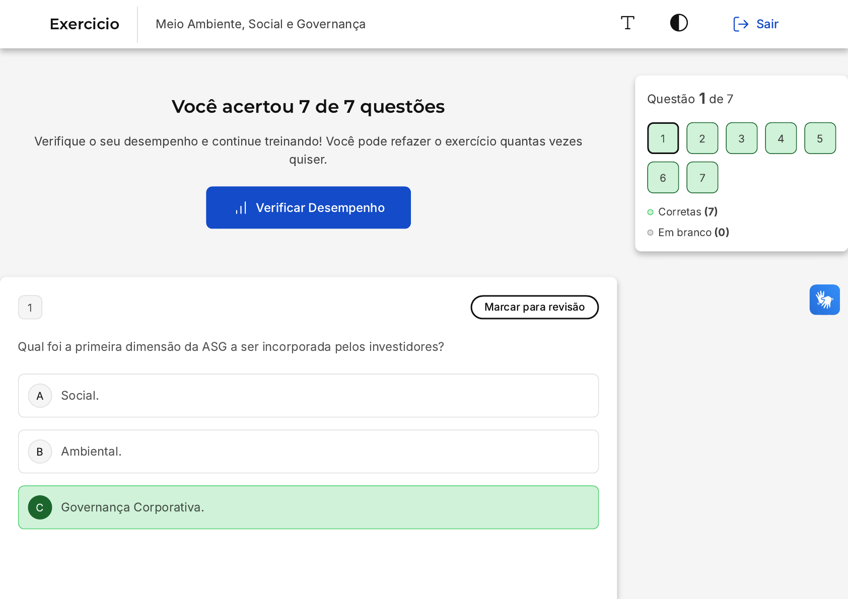 Você acertou 7 de 7 questões Verifique o seu desempenho e continue treinando! Você pode refazer o exercício quantas vezes quiser. Verificar Desempenho A B C 1 Marcar para revisão Qual foi a primeira dimensão da ASG a ser incorporada pelos investidores? Social. Ambiental. Governança Corporativa. Questão 1 de 7 Corretas �7� Em branco �0� 1 2 3 4 5 6 7 Exercicio Meio Ambiente, Social e Governança Sair D E Empresarial. Não-Governamental. Resposta correta Parabéns, você selecionou a alternativa correta. Confira o gabarito comentado! Gabarito Comentado As questões ASG se referem a critérios Ambientais, Sociais e de Governança Corporativa. Dentre essas três dimensões, a primeira a ser considerada pelos investidores foi a Governança Corporativa. Isso pode ser compreendido ao analisarmos que as práticas de governança são as que direcionam como os conselheiros, diretores e outros executivos guiam as decisões da empresa. Portanto, a alternativa correta é a que indica a Governança Corporativa como a primeira dimensão da ASG a ser incorporada pelos investidores. 2 Marcar para revisão Qual o índice brasileiro que avalia as empresas listadas no mercado local em diversos aspectos da sustentabilidade? A B C D E Índice de Sustentabilidade Dow Jones. Índice de Sustentabilidade Empresarial �ISE�. Índice Carbono Eficiente. IBOVESPA. Índice de Redução de Emissões. Resposta correta Parabéns, você selecionou a alternativa correta. Confira o gabarito comentado! Gabarito Comentado O Índice de Sustentabilidade Empresarial �ISE) é o índice brasileiro que avalia as empresas listadas no mercado local em diversos aspectos da sustentabilidade. Ele é uma ferramenta para análise comparativa da performance das empresas sob o aspecto da sustentabilidade corporativa, baseada em eficiência econômica, equilíbrio ambiental, justiça social e governança corporativa. Portanto, a alternativa correta é a B� Índice de Sustentabilidade Empresarial �ISE�. 3 Marcar para revisão A B C D E O conceito de desenvolvimento sustentável foi evoluindo ao longo do tempo. Como o conceito de desenvolvimento sustentável, de acordo com a definição das Nações Unidas, pode ser compreendido? Aquele que visa atender primordialmente às necessidades das empresas sem considerar o impacto ambiental. Aquele que busca maximizar os lucros das organizações a qualquer custo. Aquele que atende às necessidades do presente, sem comprometer a capacidade das gerações futuras de atender às suas necessidades. Aquele que prioriza as ações filantrópicas das empresas com a sociedade. Aquele que enfatiza o crescimento social em detrimento ao crescimento corporativo. Resposta correta Parabéns, você selecionou a alternativa correta. Confira o gabarito comentado! Gabarito Comentado Embora a sustentabilidade esteja só agora entrando nos debates financeiros, os conceitos ligados ao desenvolvimento sustentável não são exatamente novos. O conceito oficial de desenvolvimento sustentável foi definido em uma conferência das Nações Unidas, em 1987, e pode ser compreendido como: Aquele que atende às necessidades do presente, sem comprometer a capacidade das gerações A B C D E futuras de atender às suas necessidades. 4 Marcar para revisão O Financial Stability Board desenvolveu uma Força-Tarefa para Divulgações Financeiras Relacionadas às Mudanças Climáticas. Quais dos itens representam uma das dimensões elaboradas pela Força- Tarefa? I. Governança. II. Métricas e metas. III. Estratégia. IV. Riscos Climáticos. V. Índices. Apenas os itens I, II e IV estão corretos. Apenas os itens III e IV estão corretos. Apenas os itens I, III e V estão corretos. Apenas os itens II e V estão corretos. Apenas os itens I, II, III e IV estão corretos. Resposta correta Parabéns, você selecionou a alternativa correta. Confira o gabarito comentado! Gabarito Comentado A Força-Tarefa para Divulgações Financeiras Relacionadas às Mudanças Climáticas, também conhecida como Task-Force for Climate-related Financial Disclosures ou TCFD, tem um papel crucial no setor financeiro. Ela oferece um conjunto de recomendações que auxiliam as empresas a avaliarem sua exposição aos riscos climáticos e a identificarem oportunidades de negócios relacionadas ao tema. As recomendações da TCFD são organizadas em quatro dimensões: Governança, que se refere à forma como as lideranças estão abordando as questões climáticas; Estratégia, que considera como os impactos reais são levados em conta; Riscos Climáticos, que envolve os processos de análise e gestão desses riscos; e Métricas e Metas, que se refere às medidas e objetivos estabelecidos para a redução da exposição a esses riscos. Portanto, os itens I, II, III e IV estão corretos, enquanto o item V, Índices, não faz parte das dimensões elaboradas pela Força-Tarefa. 5 Marcar para revisão O PRI foi uma iniciativa lançada oficialmente em 2006, na Bolsa de Valores de Nova Iorque. Por que os Princípios para o Investimento Responsável �PRI) são tão relevantes? A B C D E Porque são capazes de coordenar esforços de governos acerca da sustentabilidade. Porque, além de ter sido um dos primeiros acordos voluntários voltados para o setor financeiro, seu alcance foi tal que estimulou investimentos em ASG rapidamente. Porque garantem a cooperação entre as empresas de ASG. Porque criaram um fundo que permite investir diretamente em empresas sustentáveis. Porque são centralizadas em um investidor influente. Resposta correta Parabéns, você selecionou a alternativa correta. Confira o gabarito comentado! Gabarito Comentado A alternativa correta é: "Porque, além de ter sido um dos primeiros acordos voluntários voltados para o setor financeiro, seu alcance foi tal que estimulou investimentos em ASG rapidamente". O PRI, lançado oficialmente em 2006 na Bolsa de Valores de Nova Iorque, foi uma iniciativa apoiada pelas Nações