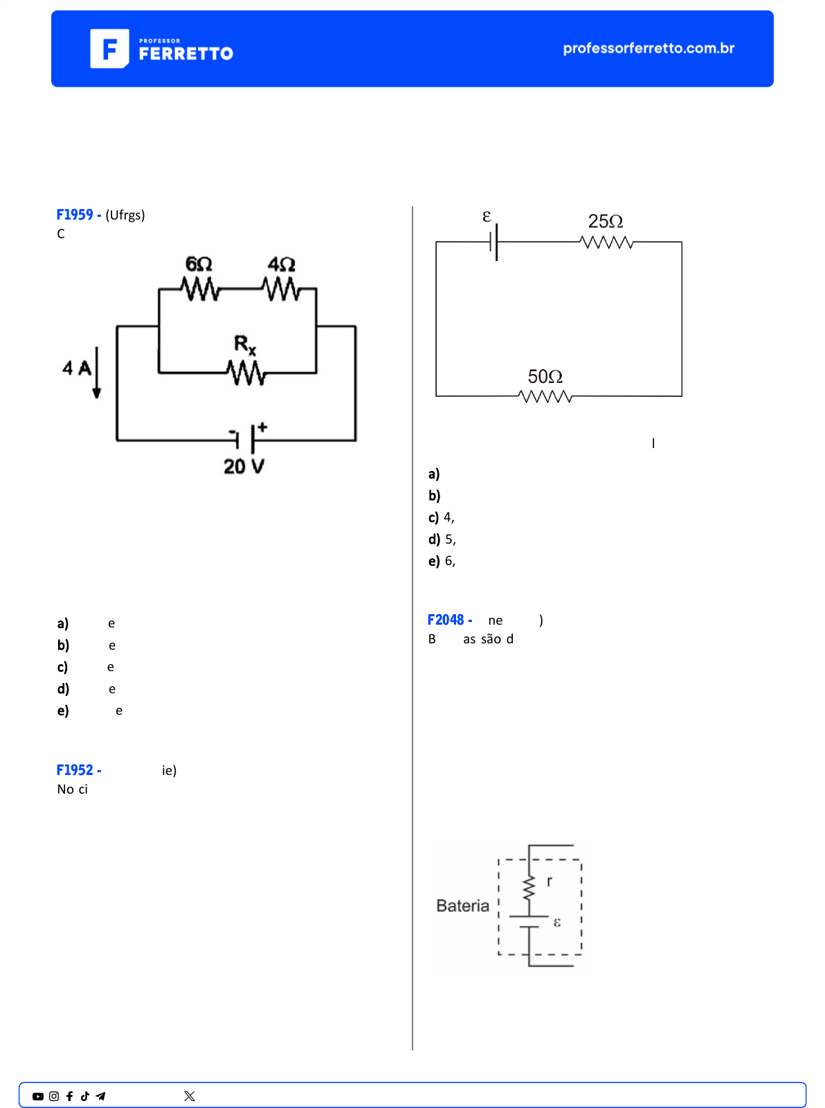 Eletrodinâmica Circuitos F1959 - (Ufrgs) Considere o circuito a seguir. No circuito, por onde passa uma corrente elétrica de 4 A, três resistores estão conectados a uma fonte ideal de força eletromotriz de 20 V. Os valores da resistência total deste circuito e da resistência RX são, respec�vamente, a) 0,8 Ω e 2,6 Ω. b) 0,8 Ω e 4,0 Ω. c) 5,0 Ω e 5,0 Ω. d) 5,0 Ω e 10,0 Ω. e) 10,0 Ω e 4,0 Ω. F1952 - (Mackenzie) No circuito desenhado abaixo, a intensidade de corrente elétrica con�nua que passa pelo resistor de 50 Ω é de 80 mA. A força eletromotriz 𝜀 do gerador ideal é igual a a) 1,5 V b) 3,0 V c) 4,5 V d) 5,0 V e) 6,0 V F2048 - (Enem PPL) Baterias são disposi�vos que acumulam energia e estão presentes em inúmeros aparelhos portáteis. Uma bateria ideal não possui resistência interna. Entretanto, baterias reais apresentam resistência interna disponibilizando uma tensão efe�va V inferior à sua tensão nominal ε, conforme a figura. Uma vez que se sabe o valor da tensão nominal da bateria, determina-se sua carga pelo conhecimento da corrente i enquanto está conectada a um circuito de resistência R, de tensão efe�va V, e da resistência interna r da bateria. 1@professorferretto @prof_ferretto De posse de um vol�metro V de um amperímetro A e de uma resistência-teste R, a configuração adequada para avaliar a carga da bateria é: a) b) c) d) e) F1179 - (Ufrrj) Na figura a seguir observa-se um circuito elétrico com dois geradores (E1 e E2) e alguns resistores. U�lizando a 1a lei de Kircchoff ou lei dos nós, pode-se afirmar que a) i1 = i2 – i3 b) i2 + i4 = i5 c) i4 + i7 = i6 d) i2 + i3 = i1. e) i1 + i4 + i6 = 0. F1962 - (Udesc) O valor da intensidade de correntes (em A) no circuito a seguir é: a) 1,50 b) 0,62 c) 1,03 d) 0,50 e) 0,30 F1953 - (U�f) Durante uma aula prá�ca de Física, o professor pediu que os alunos medissem a corrente elétrica total que atravessa o circuito mostrado na figura abaixo, em duas situações dis�ntas: a) com a chave S aberta e b) com a chave S fechada. Desprezando-se a resistência interna da bateria e sabendo-se que R1 = 8,0 Ω, R2 = 2,0 Ω e V = 32,0 V, CALCULE o valor da corrente elétrica total que atravessa o circuito com a chave S aberta e com a chave S fechada, respec�vamente. 2@professorferretto @prof_ferretto a) 16,0 A e 4,0 A b) 3,2 A e 4,0 A c) 4,0 A e 51,2 A d) 3,2 A e 20,0 A e) 4,0 A e 20,0 A F1951 - (Cps) Tendo em vista a grande dificuldade em armazenar energia elétrica, a invenção da pilha representou um marco histórico importante. Para demonstrar a versa�lidade da pilha em circuitos elétricos fechados, um professor elaborou uma experiência usando uma pilha, duas chaves, duas lâmpadas e alguns pedaços de fio, construindo um circuito elétrico capaz de atender, em momentos dis�ntos, as seguintes funções: I. acender as duas lâmpadas ao mesmo tempo; II. acender apenas uma lâmpada e manter, ao mesmo tempo, a outra apagada, podendo esta ação ser feita para ambas as lâmpadas; III. manter apagadas as duas lâmpadas. Sabendo que as tensões e correntes ob�das no circuito construído eram suficientes para que as lâmpadas se acendessem sem se queimarem, assinale a alterna�va que contenha o esquema que corresponde ao circuito construído pelo professor. a) b) c) d) e) F1947 - (Ufal) Considere os gráficos a seguir. Eles representam as curvas caracterís�cas de três elementos de um circuito elétrico, respec�vamente, 3@professorferretto @prof_ferretto a) gerador, receptor e resistor. b) gerador, resistor e receptor. c) receptor, gerador e resistor. d) receptor, resistor e gerador. e) resistor, receptor e gerador. F1299 - (Enem) É possível ligar aparelhos elétricos de baixa corrente u�lizando materiais comuns de laboratório no lugar das tradicionais pilhas. A ilustração apresenta uma montagem que faz funcionar um cronômetro digital. U�lizando a representação de projetos elétricos, o circuito equivalente a esse sistema é a) b) c) d) e) F1954 - (Ifmg) 4@professorferretto @prof_ferretto Analise o circuito abaixo. Sabendo-se que a corrente I é igual a 500mA, o valor da tensão fornecida pela bateria, em volts, é a) 10. b) 20. c) 30. d) 40. e) 50. F1958 - (Pucrs) Considere o texto e a figura para analisar as afirma�vas apresentadas na sequência. No circuito elétrico mostrado na figura a seguir, um resistor de 4,0 Ω e uma lâmpada, cuja resistência elétrica é 8,0 Ω, estão ligados a uma fonte de 24V. Nesse circuito são conectados disposi�vos de medida de corrente elétrica, os amperímetros A1 e A2, e de diferença de potencial elétrico, o vol�metro V. Assume-se que os amperímetros e o vol�metro podem ser considerados ideais, ou seja, que seu efeito no circuito pode ser desprezado na forma como estão ligados. A par�r da análise do circuito, afirma-se que: I. As leituras dos amperímetros A1 e A2 são, respec�vamente, 2,0A e 2,0A. II. A leitura do vol�metro V é 24V. III. As potências dissipadas no resistor e na lâmpada são, respec�vamente, 16W e 32W. Está(ão) correta(s) a(s) afirma�va(s) a) I, apenas. b) I e II, apenas. c) I e III, apenas. d) II e III, apenas. e) I, II e III. F1949 - (Ufrgs) O circuito a seguir representa três pilhas ideais de 1,5 V cada uma, um resistor R de resistência elétrica 1,0 Ωe um motor, todos ligados em série. (Considere desprezível a resistência elétrica dos fios de ligação do circuito.) A tensão entre os terminais A e B do motor é 4,0V. Qual é a potência elétrica consumida pelo motor? a) 0,5 W. b) 1,0 W. c) 1,5 W. d) 2,0 W. e) 2,5 W. F1180 - (Mackenzie) Em uma experiência no laboratório de Física, observa-se, no circuito a seguir, que, estando a chave ch na posição 1, a carga elétrica do capacitor é de 24 µC. Considerando que o gerador de tensão é ideal, ao se colocar a chave na posição 2, o amperímetro ideal medirá uma intensidade de corrente elétrica de 5@professorferr