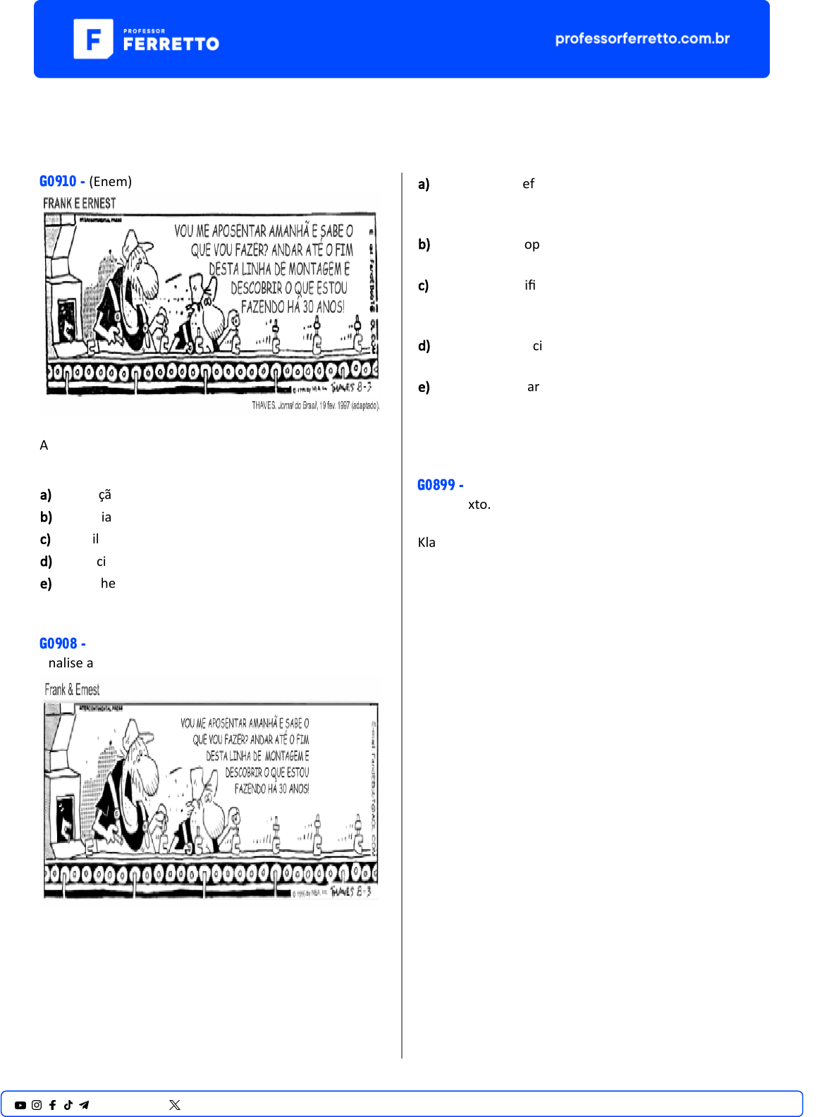 Indústria G0910 - (Enem) A forma de organização interna da indústria citada gera a seguinte consequência para a mão de obra nela inserida: a) Ampliação da jornada diária. b) Melhoria da qualidade do trabalho. c) Instabilidade nos cargos ocupados. d) Eficiência na prevenção de acidentes. e) Desconhecimento das etapas produ�vas. G0908 - (Fgvrj) Analise a �rinha a seguir. A par�r da �rinha, é correto afirmar que a linha de montagem fordista a) estabelece tarefas específicas para cada operário, o que restringe sua percepção sobre o bem final produzido. b) permite que o operário realize funções variadas, o que elimina o sobretrabalho e garante um salário justo. c) exige uma qualificação diversificada do operário, o que permite sua par�cipação nas várias etapas do processo produ�vo. d) aumenta a velocidade do processo produ�vo, o que es�mula a produ�vidade e a cogestão dos operários. e) intensifica a par�cipação do fator trabalho, o que garante a inclusão dos trabalhadores nas decisões do processo produ�vo. G0899 - (Fatec) Leia o texto. Klaus Schwab, fundador do Fórum Econômico Mundial (FEM), escreveu, em ar�go publicado na “Foreign Affairs”, que: A 1ª revolução industrial usou água e vapor para mecanizar a produção entre o meio do século XVIII e o meio do século XIX. A 2ª revolução industrial usou a eletricidade para criar produção em massa a par�r do meio do século XIX. A 3ª revolução industrial usou os eletrônicos e a tecnologia da informação para automa�zar a produção na segunda metade do século XX. Agora, no século XXI, a 4ª revolução industrial é caracterizada pela fusão de tecnologias entre as esferas �sica, digital e biológica. h�ps://�nyurl.com/y72sm8v5> Acesso em: 17.09.2018. Adaptado. De acordo com a tendência expressa no texto, a úl�ma revolução industrial citada pelo autor caracteriza-se por 1@professorferretto @prof_ferretto a) redes aéreas de comunicação e pela intensificação do uso do fordismo. b) viagens interespaciais e pelo grande emprego de carvão mineral. c) cabeamento telegráfico submarino e pela adoção do taylorismo. d) computadores a válvula e pela u�lização de linhas de produção. e) internet móvel e pela inteligência ar�ficial. G0903 - (Uerj) Ao longo de dois séculos de existência, as caracterís�cas estruturais do sistema capitalista permanecem inalteradas. Nele, contudo, houve importantes mudanças que redefiniram as formas de produção e consumo de bens. Essa é a razão pela qual os estudiosos reconhecem momentos dis�ntos do capitalismo, denominados como modelos produ�vos. As campanhas publicitárias guardam forte coerência com esses modelos. A imagem publicitária que expressa uma caracterís�ca do modelo produ�vo fordista é: a) b) 2@professorferretto @prof_ferretto c) d) G0915 - (Upe) Assinale a alterna�va que completa CORRETAMENTE a frase transcrita a seguir: “Durante muito tempo, o _____________________ predominou na produção. A inflexibilidade deste modelo, no qual cada operário deve entrar no ritmo repe��vo e na ro�na da esteira de montagem, acarretou problemas como defeitos em alguns produtos, obrigando a serem despendidas enormes somas com fiscalização e controle de qualidade.” a) Modelo de Capitais Voláteis b) Modelo Neoliberal c) Modelo Fordista d) Modelo Socialista e) Modelo do Estado Mínimo G0921 - (Upe) No ano de 1930, o Brasil evidenciava uma grande produção de café, e pra�camente o mundo mergulhava numa gravíssima crise econômica. Contudo, essa crise teve um “lado posi�vo” para o Brasil, o de a) aumentar consideravelmente a exportação de açúcar para os Estados Unidos. b) diminuir as tensões sociais e polí�cas internas com a adoção do Poder Sindical. c) incrementar o extra�vismo do ouro, especialmente na área de Serra Pelada. d) despertar a consciência sobre a necessidade de industrialização como forma de alterar o panorama existente. e) instalar no país um regime de caracterís�cas democrá�cas e socializantes dos meios de produção. G0946 - (Uepb) As proposições abaixo tratam de caracterís�cas da industrialização brasileira. Escreva F quando forem falsas e V quando forem verdadeiras. (__) Na segunda metade do século XX, o Brasil experimentou uma das mais rápidas transições urbanas da sua história. Transformou-se rapidamente de país rural e agrícola em um país urbano e industrializado, com grande parte da população passando a morar nas cidades. Com a crise 1929, o Brasil voltou-se para o desenvolvimento do mercado interno através de uma industrialização por subs�tuição de importações, o que demandou uma mão de obra numerosa. (__) No início do crescimento industrial, os inves�mentos em infraestrutura concentravam-se no Sudeste do país. Esse fenômeno reforçou a tendência à concentração industrial e acentuou as desigualdades regionais. (__) Apesar de vir perdendo indústrias nas úl�mas décadas, a Região Sudeste ainda mantém a liderança nacional tanto no que se refere ao valor da produção, quanto ao número de empregados no setor industrial. (__) Até a década de 1990, a metrópole de São Paulo concentrava a maior parte da produção nacional de veículos. Na úl�ma década do século XX, as transnacionais automobilís�cas optaram pela descentralização industrial, surgindo unidades produ�vas no Sul e no Nordeste. (__) A década de 1990 foi marcada pela globalização da economia e a consolidação do Brasil como grande e único exportador de tecnologia do mundo. A alterna�va que apresenta a sequência correta é: 3@professorferretto @prof_ferretto a) F – F – V – V – V b) F – F – F – F – V c) V – V – V – V – F d) V – F – V – F – V e) F – V – F – V – V G1439 - (Enem) No final do século XX e em razão dos avanços da ciência, produziu-se um sistema presidido pelas 