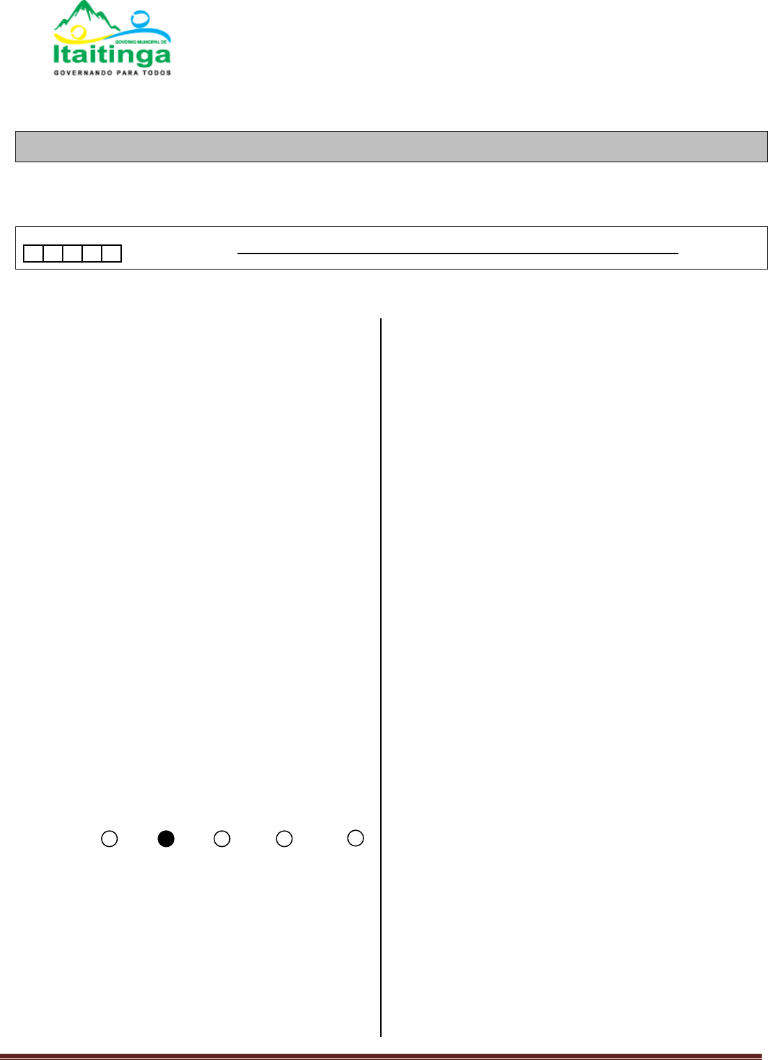 www.pciconcursos.com.br PREFEITURA MUNICIPAL DE ITAITINGA – CE PREFEITURA MUNICIPAL DE ITAITINGA – CE CONCURSO PÚBLICO EDITAL Nº 001/2015 PROFESSOR DE EDUCAÇÃO INFANTIL NOME DO CANDIDATO __________________________________________________________________________ RG: ______________________________ ÓRGÃO EXPEDIDOR: __________________________________________ Nº DE INSCRIÇÃO ASSINATURA: LEIA COM ATENÇÃO E SIGA RIGOROSAMENTE ESTAS INSTRUÇÕES 1. Este caderno está contendo 60 (sessenta) questões de múltipla escolha, numeradas de 01 a 60. 2. Cada uma das questões apresenta um enunciado seguido de 5 (cinco) alternativas, das quais somente uma é correta. Marque-a. 3. Examine se a prova está completa, com a sequência numérica das questões, se há falhas ou imperfeições gráficas que causem dúvidas. Qualquer reclamação deverá ser feita durante os 20 minutos iniciais. Após esse tempo, qualquer reclamação será desconsiderada. 4. Depois de decorrido 2 (duas) horas do início da prova, será distribuído o Cartão-Resposta, o qual será o único documento válido para a correção da prova. Ao recebê- lo, verifique se o seu nome e número de inscrição estão corretos. Reclame imediatamente se houver discrepância. 5. O cartão-resposta não pode ser dobrado, amassado, rasurado ou manchado. Exceto sua assinatura e inscrição, nada deve ser escrito ou registrado fora dos locais destinados às respostas. Tenha muita atenção ao marcar seu cartão-resposta, pois não haverá substituição por erro do candidato. Marque sua resposta pintando completamente o espaço correspondente à alternativa de sua opção. Ex.: A B C D E 6. A leitora de marcas não registrará as respostas em que houver falta de nitidez, uso de corretivo, marcação a lápis ou marcação de mais de uma letra. Não serão computadas questões não assinaladas. 7. Durante a prova, é proibido o intercâmbio e o empréstimo de material de qualquer natureza entre os candidatos. A tentativa de fraude, a indisciplina e o desrespeito às autoridades encarregadas dos trabalhos são faltas que implicarão na desclassificação do(a) candidato(a). 8. Qualquer forma de comunicação entre candidatos implicará na eliminação de ambos do certame. 9. Não será permitido ao candidato, durante a realização das provas, portar: armas; aparelhos eletrônicos de qualquer natureza; bolsas; livros; jornais ou impressos em geral; bonés, chapéus, lenço de cabelo, bandanas etc. 10. É vedado o uso de telefone celular ou de qualquer outro meio de comunicação. O candidato que for flagrado portando aparelho celular, durante o período de realização da prova, ou, ainda, aquele candidato cujo aparelho celular tocar será sumariamente eliminado do certame. 11. Em caso de dúvida, durante a prova, levante o braço para solicitar atendimento da fiscalização. Jamais pergunte em voz alta. 12. O Candidato que permanecer na sala de provas, por mais de 3h45min, poderá levar consigo a cópia do gabarito, em formulário específico, fornecido pela ORGANIZADORA. 13. Ao terminar a resolução da prova, entregue-a ao fiscal de sala juntamente com o Cartão-Resposta (devidamente assinado). Não esqueça, também de assinar a folha de frequência. 14. As provas terão duração de 4 horas. Turno da Manhã com início às 8h00 e término às 12h00 e Turno da Tarde com inicio as 14h00min e termino as 18h00min. Entretanto, o candidato só poderá ausentar-se da sala, depois de decorridas duas horas do início das provas. 15. Os Gabaritos Preliminares das Provas Objetivas serão divulgados 72 (setenta e duas) horas após a realização das mesmas. www.pciconcursos.com.br 2 PREFEITURA MUNICIPAL DE ITAITINGA – CE –PROFESSOR DE EDUCAÇÃO INFANTIL 01 - Assinale a opção na qual houve erro de grafia: A. Despercebido, interlúdio, intraduzível. B. Decalcomania, decrepitude, empolgamento. C. Clavícula, claudicante, radiojornalismo. D. Premeditação, radiatividade, pré-carnavalesco. E. Hexágono, interestelar, sopapear. Texto para a questão 2. Trecho do Poema “A flor e a naúsea” Carlos Drummond de Andrade Uma flor nasceu na rua! Passem de longe, bondes, ônibus, rios de aço do tráfego. Uma flor ainda desbotada Ilude a polícia, rompe o asfalto. Façam completo silêncio, paralisem os negócios, Garanto que uma flor nasceu. Sua cor não se percebe. Suas pétalas não se abrem. Seu nome não está nos livros. É feia. Mas é realmente uma flor. 02 - Assinale a opção incorreta em relação ao poema acima apresentado. A. O poema manifesta uma utilização especial da língua – o caráter literário. A característica rítmica, a distribuição das palavras e a natureza temática – presentes no texto – embasam essa conclusão. B. O texto estabelece um contraste entre uma utilização literária e outra não-literária da palavra “flor”. Podem ser detectadas essas duas utilizações no poema. C. O texto não remete a uma realidade da vida humana e do mundo de uma forma mais profunda, mas somente a uma realidade cotidiana e comum, conforme atesta a utilização de palavras normalmente usadas no cotidiano. D. O sentido literário que a palavra “flor” manifesta emana do próprio teor poético do texto; nasce do arranjo contextual e conjuntural no qual a palavra está imersa. E. A utilização literária da palavra “flor” simboliza valores subjetivos humanos: filosóficos, éticos e morais. A utilização não literária aponta para a existência de um organismo vegetal. 03 - Assinale a opção incorreta quanto ao estudo da Literatura: A. O uso literário da língua caracteriza-se pela combinação de seus elementos constituintes que, em conjunto e de forma sistêmica, evocam significados. A totalidade do texto literário é que direciona o sentido, e não as palavras individualmente. B. Conotação designa os diversos sentidos possíveis que uma palavra pode adquirir, dependendo do contexto no qual ela se enco