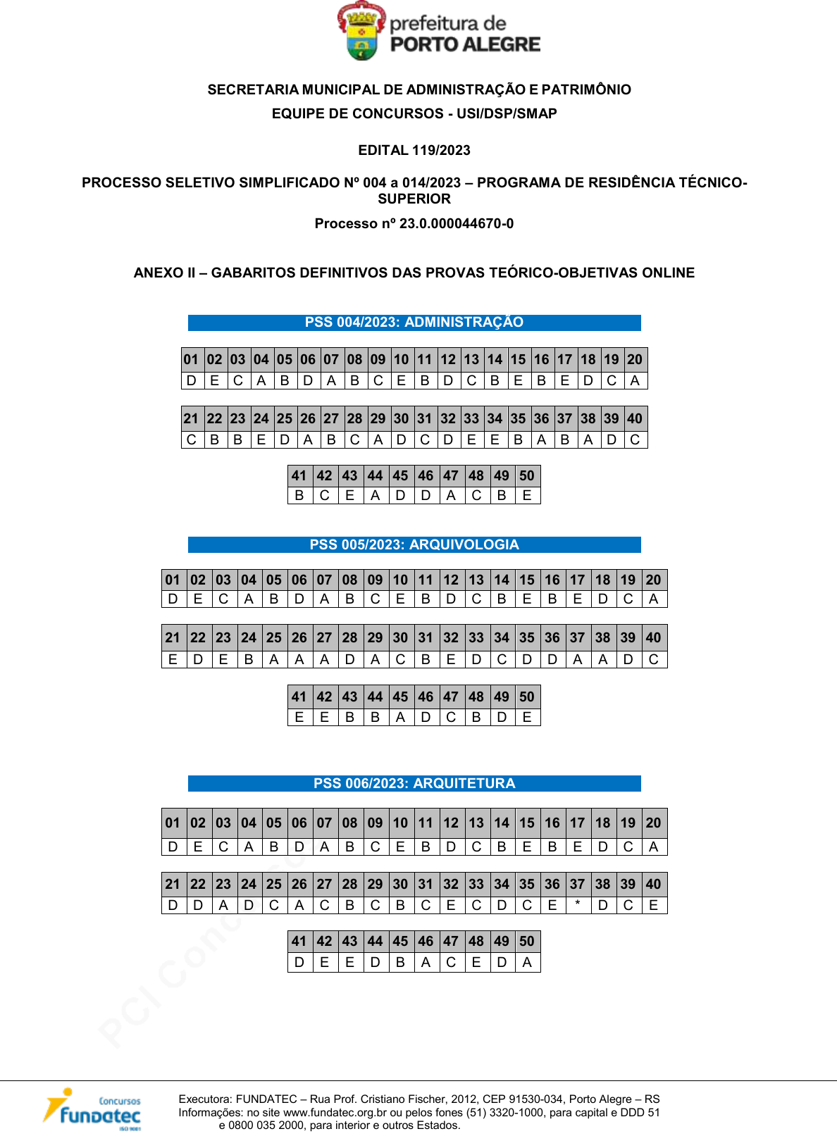 pcimarkpci MjgwNDowMjQ4OmZjYWU6MmMwMDoyNWQyOmJhNWI6N2E4MjowNzM0:RnJpLCAyNSBPY3QgMjAyNCAwOTo0OToxOSAtMDMwMA== www.pciconcursos.com.br SECRETARIA MUNICIPAL DE ADMINISTRAÇÃO E PATRIMÔNIO EQUIPE DE CONCURSOS - USI/DSP/SMAP Executora: FUNDATEC – Rua Prof. Cristiano Fischer, 2012, CEP 91530-034, Porto Alegre – RS Informações: no site www.fundatec.org.br ou pelos fones (51) 3320-1000, para capital e DDD 51 e 0800 035 2000, para interior e outros Estados. EDITAL 119/2023 PROCESSO SELETIVO SIMPLIFICADO Nº 004 a 014/2023 – PROGRAMA DE RESIDÊNCIA TÉCNICO- SUPERIOR Processo nº 23.0.000044670-0 ANEXO II – GABARITOS DEFINITIVOS DAS PROVAS TEÓRICO-OBJETIVAS ONLINE PSS 004/2023: ADMINISTRAÇÃO 01 02 03 04 05 06 07 08 09 10 11 12 13 14 15 16 17 18 19 20 D E C A B D A B C E B D C B E B E D C A 21 22 23 24 25 26 27 28 29 30 31 32 33 34 35 36 37 38 39 40 C B B E D A B C A D C D E E B A B A D C 41 42 43 44 45 46 47 48 49 50 B C E A D D A C B E PSS 005/2023: ARQUIVOLOGIA 01 02 03 04 05 06 07 08 09 10 11 12 13 14 15 16 17 18 19 20 D E C A B D A B C E B D C B E B E D C A 21 22 23 24 25 26 27 28 29 30 31 32 33 34 35 36 37 38 39 40 E D E B A A A D A C B E D C D D A A D C 41 42 43 44 45 46 47 48 49 50 E E B B A D C B D E PSS 006/2023: ARQUITETURA 01 02 03 04 05 06 07 08 09 10 11 12 13 14 15 16 17 18 19 20 D E C A B D A B C E B D C B E B E D C A 21 22 23 24 25 26 27 28 29 30 31 32 33 34 35 36 37 38 39 40 D D A D C A C B C B C E C D C E * D C E 41 42 43 44 45 46 47 48 49 50 D E E D B A C E D A pcimarkpci MjgwNDowMjQ4OmZjYWU6MmMwMDoyNWQyOmJhNWI6N2E4MjowNzM0:RnJpLCAyNSBPY3QgMjAyNCAwOTo0OToxOSAtMDMwMA== www.pciconcursos.com.br SECRETARIA MUNICIPAL DE ADMINISTRAÇÃO E PATRIMÔNIO EQUIPE DE CONCURSOS - USI/DSP/SMAP Executora: FUNDATEC – Rua Prof. Cristiano Fischer, 2012, CEP 91530-034, Porto Alegre – RS Informações: no site www.fundatec.org.br ou pelos fones (51) 3320-1000, para capital e DDD 51 e 0800 035 2000, para interior e outros Estados. PSS 007/2023: CONTABILIDADE 01 02 03 04 05 06 07 08 09 10 11 12 13 14 15 16 17 18 19 20 D E C A B D A B C E B D C B E B E D C A 21 22 23 24 25 26 27 28 29 30 31 32 33 34 35 36 37 38 39 40 B A B E D D B B A D A C C C B D C E C B 41 42 43 44 45 46 47 48 49 50 E A D C E E D B C D PSS 008/2023: ECONOMIA 01 02 03 04 05 06 07 08 09 10 11 12 13 14 15 16 17 18 19 20 D E C A B D A B C E B D C B E B E D C A 21 22 23 24 25 26 27 28 29 30 31 32 33 34 35 36 37 38 39 40 A C C E B A D E D B C E C A E C A A D B 41 42 43 44 45 46 47 48 49 50 C B D C A D D E C D PSS 009/2023: ENGENHARIA AGRÔNOMA 01 02 03 04 05 06 07 08 09 10 11 12 13 14 15 16 17 18 19 20 D E C A B D A B C E B D C B E B E D C A 21 22 23 24 25 26 27 28 29 30 31 32 33 34 35 36 37 38 39 40 D C D C D E D C A E A A E B C D B E A C 41 42 43 44 45 46 47 48 49 50 D B E E E E A B B A PSS 011/2023: ENGENHARIA CIVIL 01 02 03 04 05 06 07 08 09 10 11 12 13 14 15 16 17 18 19 20 D E C A B D A B C E B D C B E B E D C A 21 22 23 24 25 26 27 28 29 30 31 32 33 34 35 36 37 38 39 40 C * E B A C B E A * D C A D B D A D E B 41 42 43 44 45 46 47 48 49 50 C B D B D D C A E E pcimarkpci MjgwNDowMjQ4OmZjYWU6MmMwMDoyNWQyOmJhNWI6N2E4MjowNzM0:RnJpLCAyNSBPY3QgMjAyNCAwOTo0OToxOSAtMDMwMA== www.pciconcursos.com.br SECRETARIA MUNICIPAL DE ADMINISTRAÇÃO E PATRIMÔNIO EQUIPE DE CONCURSOS - USI/DSP/SMAP Executora: FUNDATEC – Rua Prof. Cristiano Fischer, 2012, CEP 91530-034, Porto Alegre – RS Informações: no site www.fundatec.org.br ou pelos fones (51) 3320-1000, para capital e DDD 51 e 0800 035 2000, para interior e outros Estados. PSS 012/2023: ENGENHARIA ELÉTRICA 01 02 03 04 05 06 07 08 09 10 11 12 13 14 15 16 17 18 19 20 D E C A B D A B C E B D C B E B E D C A 21 22 23 24 25 26 27 28 29 30 31 32 33 34 35 36 37 38 39 40 B C A C D B C E B C A E E E B D D A C A 41 42 43 44 45 46 47 48 49 50 E D D B A B D B A D PSS 013/2023: ENGENHARIA MECÂNICA 01 02 03 04 05 06 07 08 09 10 11 12 13 14 15 16 17 18 19 20 D E C A B D A B C E B D C B E B E D C A 21 22 23 24 25 26 27 28 29 30 31 32 33 34 35 36 37 38 39 40 C C B D C B B E E E E A D B B B E C D E 41 42 43 44 45 46 47 48 49 50 A A E A C A A D C D PSS 014/2023: TECNOLOGIA DA INFORMAÇÃO 01 02 03 04 05 06 07 08 09 10 11 12 13 14 15 16 17 18 19 20 D E C A B D A B C E B D C B E B E D C A 21 22 23 24 25 26 27 28 29 30 31 32 33 34 35 36 37 38 39 40 A E B C C D B A D B E E E A B B E D C A 41 42 43 44 45 46 47 48 49 50 E D A B B C D C A E