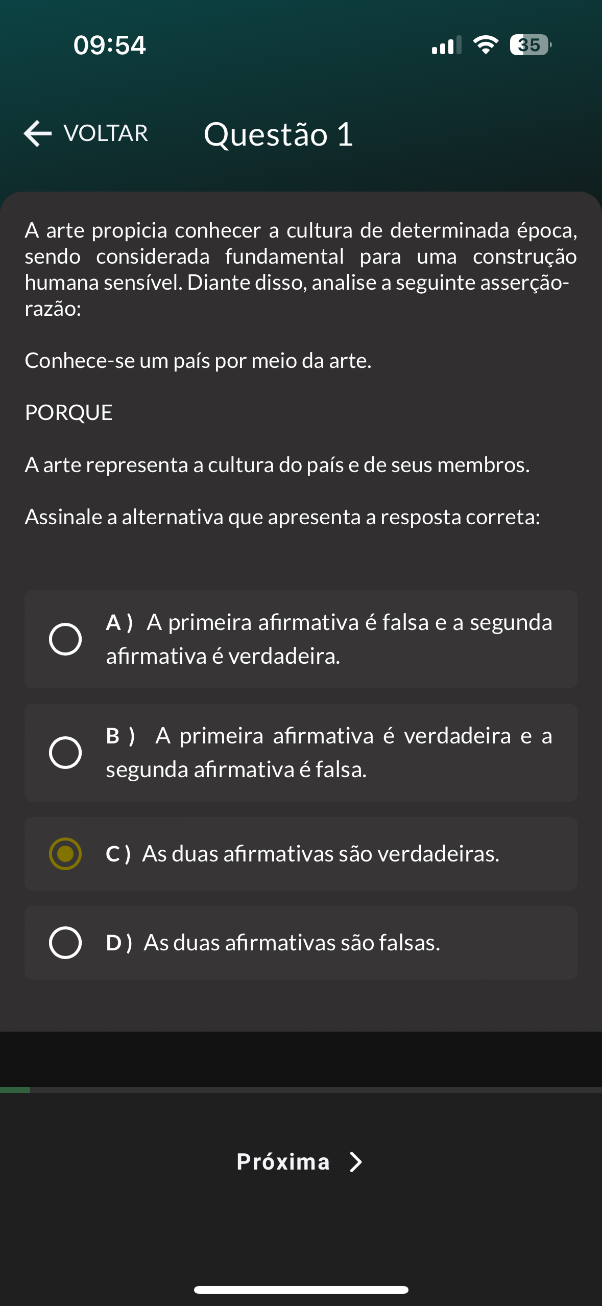 09:54 35 VOLTAR Questão 1 A arte propicia conhecer a cultura de determinada época, sendo considerada fundamental para uma construção humana sensível. Diante disso, analise a seguinte asserção- razão: Conhece-se um país por meio da arte. PORQUE A arte representa a cultura do país e de seus membros. Assinale a alternativa que apresenta a resposta correta: A) A primeira afirmativa é falsa e a segunda afirmativa é verdadeira. A primeira afirmativa é verdadeira e a segunda afirmativa é falsa. C) As duas afirmativas são verdadeiras. D) As duas afirmativas são falsas. Próxima >