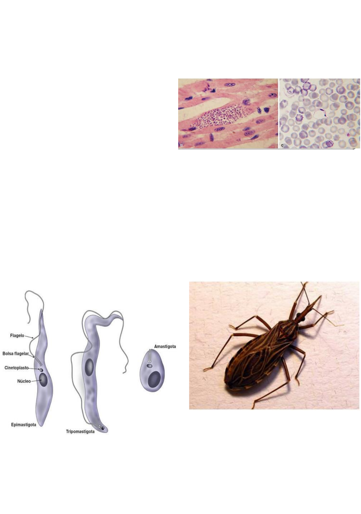 Hortência Quental Trypanosoma Cruzi Doença de Chagas • Doença do sistema cardiovascular; • Protozoário flagelado Dentro do homem vai aparecer nas formas Tripomastigota (forma que fica na corrente sanguínea - forma infectante do parasita – ajudam no diagnóstico da fase AGUDA) e amastigota (dentro da célula - Dentro da célula, o tripomastigota se transforma em amastigota, que é a forma replicativa do parasita) O barbeiro se infecta ao ingerir sangue contaminado com tripomastigotas, dentro do inseto vetor, conforme ele atravessa o epitélio digestório do inseto, vai mudar para as formas amastigota, e posteriormente em esferomastigota, que evoluem para epimastigota (se multiplicam ativamente no intestino médio), migram para o intestino posterior do barbeiro e se transformam em tripomastigota metacíclica (ele vai cobrar na prova) Quinetoplastideos são um grupo de protozoários parasitas caracterizados pela presença de uma organela celular única chamada cinetoplasto – Mitocôndria modificada A. Estágios evolutivos de Trypanosoma cruzi. B. Corte histológico que mostra ninho de amastigotas de T. cruzi na musculatura esquelética cardíaca. C. Tripomastigota em esfregaço sanguíneo. • Descoberto - Carlos Chagas em 1910; Doença transmitida pelo inseto populmanete conhecido como Barbeiro; • Choupanas com telhado de sapê; Tripanossomos - crescem no intestino do inseto; Transmitidos se ele defecar enquanto se alimenta – fezes contaminadas do inseto Subfamília Triatominae • Triatoma infestans; • Panstrongylus megistus; • Rhodnius prolixus Parasitologia Hortência Quental Trypanosoma cruzi • A doença ocorre na América Central e em regiões da América do Sul; • Onde infecta cronicamente um número estimado de 12 milhões; • Brasil - maior carga de adoecimento e morte entre todas as doenças negligenciadas; • Populações pobres • Doença que só tem tratamento na fase aguda, na fase crônica só trata os sintomas Hospedeiro vertebrado Morfologia • Intracelularmente - formas amastígotas; • Extracelularmente - tripomastígotas presentes no sangue; • Cinetoplasto, além do núcleo Hospedeiro invertebrado Morfologia • Esferomastígotas - estômago e intestino; • Epimastígotas - todo o intestino; • Tripomastígotas - reto; • Tripomastígota metacíclico – forma infectiva Ciclo de vida • Heteroxênico • Homem • Triatoma No ser humano (Hospedeiro vertebrado): 1. Forma tripomastigota (forma infectante): o O Trypanosoma cruzi entra no corpo humano pela pele ou mucosas quando as fezes do barbeiro (vetor) contaminadas com tripomastigotas metacíclicas entram em contato com o local da picada ou são esfregadas nos Hortência Quental olhos, boca, ou outros ferimentos. o As tripomastigotas metacíclicas são a forma infectante que circula na corrente sanguínea do hospedeiro humano. 2. Invasão celular e transformação em amastigota: o As tripomastigotas invadem as células de diversos tecidos (como células do coração, músculos, sistema nervoso, etc.). o Dentro das células, as tripomastigotas se transformam em amastigotas, a forma replicativa intracelular do parasita. 3. Multiplicação da forma amastigota: o As amastigotas se multiplicam ativamente dentro da célula hospedeira por fissão binária. o Após várias rodadas de multiplicação, as amastigotas se diferenciam de volta em tripomastigotas. 4. Liberação e disseminação: o As células hospedeiras eventualmente se rompem, liberando tripomastigotas no espaço extracelular e na corrente sanguínea. o As tripomastigotas podem infectar novas células ou ser ingeridas pelo vetor (barbeiro), dando continuidade ao ciclo. No barbeiro (Vetor invertebrado): 1. Infecção do barbeiro: o O barbeiro se infecta ao ingerir sangue de um hospedeiro vertebrado (humano ou outro mamífero) contaminado com tripomastigotas sanguíneas. 2. Transformação no intestino do barbeiro: o Dentro do trato digestivo do barbeiro, as tripomastigotas atravessam o epitélio intestinal do inseto e se transformam em amastigotas. 3. Forma esferomastigota e epimastigota: o As amastigotas se transformam em esferomastigotas (forma intermediária não replicativa). o As esferomastigotas rapidamente evoluem para epimastigotas, que são as formas que se multiplicam ativamente por fissão binária no intestino médio do barbeiro. 4. Migração e transformação em tripomastigotas metacíclicas: o Após a multiplicação, as epimastigotas migram para o intestino posterior do barbeiro (reto). o No intestino posterior, as epimastigotas se transformam em tripomastigotas metacíclicas, que são a forma infectante para o hospedeiro vertebrado. 5. Eliminação nas fezes: o As tripomastigotas metacíclicas são eliminadas nas fezes do barbeiro quando ele se alimenta de um novo hospedeiro vertebrado, iniciando um novo ciclo de infecção. Pontos adicionais: • Epimastigotas não são formas infectantes para o humano; elas se multiplicam no vetor. Hortência Quental • Tripomastigotas metacíclicas são a única forma infectante para o hospedeiro vertebrado. • As tripomastigotas no sangue do humano não se multiplicam. A multiplicação só ocorre na forma amastigota dentro das células do hospedeiro ou como epimastigota no intestino do barbeiro. Fase aguda - início da infecção do vertebrado - Ela se caracteriza por uma intensa replicação do T. cruzi e pela resposta imune do hospedeiro. Parasitemia mais elevada - morte do hospedeiro; • Principalmente em crianças; Resposta imune eficaz - diminui a parasitemia e a infecção tende a se cronificar; Fase crônica – pequeno número de parasitas na circulação; Evolução da doença de Chagas - lentamente; Após 10 a 15 anos de infecção Transmissão A principal forma de transmissão/contaminação é através das fezes contaminada do barbeiro com a forma tripomastigota metaciclica (se ele perguntar na prova tem que colocar essa forma) Vetorial; • Transfusão sangu
