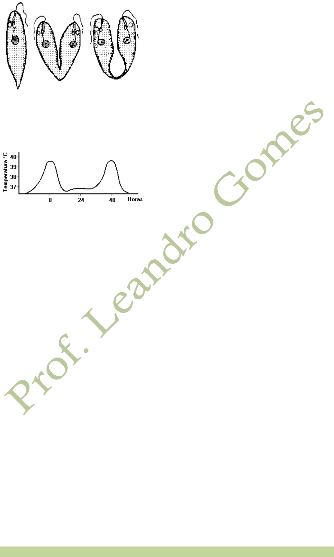 179 Não estude BIOLOGIA, desfrute-a!!! Prof. Leandro Gomes Essa reprodução é por a) divisão binária. b) divisão múltipla. c) esporogonia. d) conjugação. e) gamogonia. [A] 2072. O gráfico a seguir representa as curvas da temperatura de uma pessoa infectada por um parasita. O parasita que provoca elevações da temperatura a intervalos regulares pertence ao gênero a) 'Ascaris'. b) 'Plasmodium'. c) 'Entamoeba'. d) 'Schistosoma'. e) 'Trypanossoma'. [B] 2073. Conforme tem sido noticiado na imprensa mineira, a incidência de Calazar, Leishmaniose visceral, nos cães de áreas urbanas tem aumentado significativamente. Em relação a essa doença é INCORRETO afirmar-se que a) a mordida do cão pode transmitir a doença ao homem. b) a raposa também é reservatório da doença no meio rural. c) o agente patogênico é um protozoário flagelado. d) o vetor pertence à mesma classe do barbeiro. e) uma medida profilática é a eliminação de cães contaminados. [D] 2074. A leishmaniose afeta, atualmente, cerca de 400.000 pessoas em todo o mundo. A forma mais comum no Brasil, a leishmaniose tegumentar americana, vem aumentando em Minas Gerais. Esse crescimento se deve provavelmente a) à domiciliação do vetor em conseqüência do desmatamento. b) à eliminação dos cães infectados que proliferam na periferia das cidades. c) à falta de condições de higiene, o que permite o contágio com pessoas doentes. d) ao aumento da resistência do protozoário às vacinas existentes. e) ao uso comum de seringas por viciados em drogas, o que permite a transmissão do protozoário pelo sangue. [A] 2075. Estabeleça a correspondência entre as colunas. 1. 'Trypanosoma cruzi' 2. 'Endamoeba histolytica' 3. 'Triatoma infestans' ( ) existe nas formas trofozoítica e cística; ( ) protozoário flagelado; ( ) causa a doença de Chagas; ( ) inseto hematófago ( ) hospedeiro intermediário do causador da doença de Chagas. A seqüência correta é: a) 1, 2, 1, 3 e 2 b) 2, 1, 1, 3 e 3 c) 3, 1, 1, 2 e 3 d) 2, 1, 3, 1 e 1 e) 2, 3, 1, 3 e 3 [B] 2076. Devido ao surgimento, em vários Estados brasileiros, de surtos de doenças relacionadas ao acúmulo de água em pneus abandonados, depósitos de ferro velho e quintais, têm sido utilizada a televisão e vários outros meios de comunicação para alertar a população sobre os riscos dos objetos, vasos e plantas que possam servir de depósito de água, considerando ser esta condição propícia ao aparecimento de várias doenças. Indique a alternativa correta: a) Pneumonia, dengue, esquistossomose. b) Febre amarela, dengue e malária. c) Dengue, amebíase e esquistossomose. d) Febre amarela, giardíase e doença de Chagas. e) Febre amarela, giardíase e cryptosporidiose. [B] 2077. A Organização Mundial de Saúde (OMS) divulgou que, no Terceiro Mundo, quase meio bilhão de pessoas estão sofrendo de doenças tropicais. Uma dessas doenças é a malária. Para combatê-la, entre outras medidas profiláticas, pode-se: a) construir redes de esgotos. b) drenar regiões alagadas. c) substituir choupanas por casas de alvenaria. d) ter cuidados com higiene pessoal e alimentos. e) vacinar populações ribeirinhas. [B] 2078. A respeito dos protozoários, são feitas as afirmações a seguir: I - Todos eles apresentam vacúolos contráteis em sua célula. II - Todos eles são heterótrofos e de respiração aeróbia. III - Alguns podem se reproduzir sexuadamente. Assinale: a) se todas estiverem corretas. b) se todas estiverem erradas. c) se apenas I e II estiverem corretas. d) se apenas I e III estiverem corretas. e) se apenas III estiver correta. [E] 2079. A doença de Chagas é considerada uma grande endemia brasileira. Sua transmissão ocorre a) através da picada do inseto barbeiro. b) através das fezes do inseto barbeiro. c) através da picada do mosquito 'Culex'. d) através da picada do mosquito 'Aedes Aegypti'. e) através das fezes do mosquito 'Culex'. [B] 2080. O agente etiológico da malária ou maleita é a) o 'Plasmodium falciparum' um protozoário. b) o 'Schistosoma mansoni' um platielminto. c) um mosquito do gênero Aedes. d) a 'Wuchereria bancrofti', um nematódio. e) a 'Leishmania brasiliensis', um protozoário. [A] 2081. Segundo noticiário dos principais jornais da cidade de São Paulo, habitantes de regiões recentemente inundadas por chuvas torrenciais estão apresentando umas doença chamada leptospirose. Essa doença é causada por: a) bactérias que contaminaram a água potável. b) vírus, transmitidos pela urina de ratos. c) protozoários, transmitidos pela urina de ratos. d) vermes que são ingeridos pela água contaminada. e) picadas de insetos, que em épocas de chuvas se reproduzem muito. [C] 2082. Protozoários parasitas do tubo digestivo dos animais não conseguem sobreviver sob sua forma adulta, o trofozoíta, fora do corpo do seu hospedeiro. Assim, para resistir ao meio externo, bem diferente daquele no qual ele se encontra, eles se modificam, eliminando água, desintegrando organelas celulares, sintetizando substâncias de reserva, diminuindo seu metabolismo e secretando um envoltório de natureza quitinosa ao seu redor. A essa forma de resistência, denominamos: a) Soros. b) Hormogônios. c) Cistos. d) Merozofta. e) Gametócito. [C] 2083. A seguir são apresentados alguns procedimentos que podem ser adotados na prevenção de algumas doenças: - Lavar as mãos antes das refeições e após usar os sanitários. - Conservar sempre as unhas cortadas e limpas. - Manter as instalações sanitárias em boas condições de higiene. Das protozooses a seguir a única que pode ser evitada por esses procedimentos é a a) amebíase. b) doença de Chagas. c) leishmaniose. d) malária. [A] 2084. Considere os seguintes métodos preventivos e de tratamento de doenças parasitárias. I - Abstenção de contato com água possivelmente contaminada. II - Uso de medicamentos que combatem o parasito no homem.