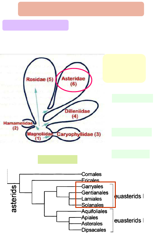 CLADO ASTERIDAE – Euasteridae I APG, 2003 Cronquist, 1988 •Corola gamopétala; •Número de estames no máximo igual aos lobos da corola e alternos a eles 11 ordens 49 famílias 60.000 spp. • Lamiales • Solanales • Asterales Lamiaceae Verbenaceae Bignoniaceae Solanaceae Asteraceae CLADO ASTERIDAE – Euasteridae I Há predominância de grupos consistentemente gamopétalos, flores com androceu isostêmone ou oligostêmone, gineceu sincárpico com poucos carpelos; Mecanismo de polinização especializados, disco nectarífero geralmente em torno do ovário; Quimicamente, há frequente ocorrência de iridóides, alcalóides, acetilenos e lactonas sesquiterpênicas, que são repelentes de herbívoros Família Bignoniaceae Compreende c.a de 120 gêneros e 800 spp. •Árvores, arbustos ou lianas, geralmente com gavinhas; •Folhas opostas, raro verticiladas ou alternas, em geral compostas; •Inflorescência cimosa ou racemosa, mais frequentemente paniculadas; Distribuição pantropical; Família Bignoniaceae •Flores vistosas, monoclinas, zigomorfas, diclamídeas; •Cálice pentâmero, gamossépalo; •Corola pentâmera, gamopétala, bilabiada; •Estames 4, didínamos, com estaminódio, epipétalos; •Anteras rimosas, disco nectarífero geralmente presente; Família Bignoniaceae •Ovário súpero, bicarpelar, bilocular ou raramente unilocular, em geral pluriovulado; •Fruto cápsula, raramente baga; •Sementes em geral aladas. Importância econômica Família Bignoniaceae •Spathodea campanulata – tulipa africana, mijão •Podranea ricasoliana – sete-léguas •Tabebuia spp. – ipê •Tecoma spp. – ipêzinho •Jacaranda mimosifolia – jacaraná-mimoso •Pyrostegia venusta – flor-de-são-joão Tabebuia spp. Jacaranda mimosifolia Pyrostegia venusta Família Solanaceae Compreende c.a de 150 gêneros e 3.000 spp. •Ervas, arbustos ou pequenas árvores, raramente lianas; •Folhas alternas, simples; •Inflorescência cimosa, as vezes reduzida a uma única flor; Distribuição cosmopolita; Família Solanaceae •Flores geralmente vistosas, monoclinas, actinomorfas, raro ligeiramente zigomorfas, diclamídeas; •Cálice pentâmero, gamossépalo; •Corola geralmente pentâmera, gamopétala, em geral plicada; •Estames 5, menos frequentemente 4 e didínamos, epipétalos; •Anteras rimosas ou poricidas; •Disco nectarífero geralmente presente; Família Solanaceae •Ovário súpero, bicarpelar, bilocular, raramente tetralocular, em geral pluriovulado; •Estilete terminal; • Carpelos orientados obliquamente em relação ao eixo da flor; •Fruto baga ou cápsula. Importância econômica Família Solanaceae •Solanum lycopersycum – tomate •Solanum tuberosum - batata •Solanum melogena – berinjela •Solanum gilo – jiló •Solanum americanum – maria-pretinha •Solanum paniculatum - jurubeba •Nicotiana tabacum - tabaco •Capsicum spp. – pimenta e pimentão •Brunfelsia uniflora – manacá-de-cheiro •Petunia hybrida – petúnia •Brugmansia spp. – trombeteira •Cestrum spp. – damas-da-noite Solanum lycopersycum Brugmansia sp. Brugmansia sp. Capsicum sp. Solanum tuberosum
