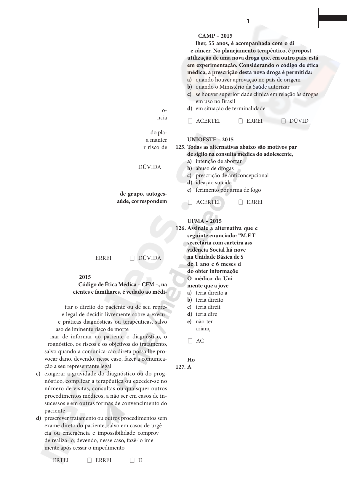 Hospital Albert Einstein – 2015 121. A Lei que regulamenta o Sistema Supletivo de Assis- tência Médica permite que as operadoras: a) enquadrem qualquer doença como pré-existente ou congênita e assim passível de exclusão na prestação de serviços b) excluam, em todas as modalidades de plano, o aten- dimento às situações de risco caracterizadas como urgência médica, desde que previamente contratado com o usuário c) ofereçam planos apenas por modalidades ambulato- rial, hospitalar e odontológica, ou os de referência (que incluem as três modalidades anteriores) d) promovam mudança sem limitação no preço do pla- no nas faixas etárias acima dos 60 anos para manter seu equilíbrio �nan-ceiro frente ao maior risco de adoecer deste segmento populacional ACERTEI ERREI DÚVIDA Hospital da Cruz Vermelha – 2015 122. Cooperativas médicas, medicina de grupo, autoges- tão, perante o Sistema Único de Saúde, correspondem ao setor: a) suplementar b) complementar c) �lantrópico d) sindical e) secundário ACERTEI ERREI DÚVIDA Santa Casa-BH – 2015 123. De acordo com o Código de Ética Médica – CFM –, na relação com pacientes e familiares, é vedado ao médi- co, EXCETO: a) desrespeitar o direito do paciente ou de seu repre- sentante legal de decidir livremente sobre a execu- ção de práticas diagnósticas ou terapêuticas, salvo em caso de iminente risco de morte b) deixar de informar ao paciente o diagnóstico, o prognóstico, os riscos e os objetivos do tratamento, salvo quando a comunica-ção direta possa lhe pro- vocar dano, devendo, nesse caso, fazer a comunica- ção a seu representante legal c) exagerar a gravidade do diagnóstico ou do prog- nóstico, complicar a terapêutica ou exceder-se no número de visitas, consultas ou quaisquer outros procedimentos médicos, a não ser em casos de in- sucessos e em outras formas de convencimento do paciente d) prescrever tratamento ou outros procedimentos sem exame direto do paciente, salvo em casos de urgên- cia ou emergência e impossibilidade comprovada de realizá-lo, devendo, nesse caso, fazê-lo imediata- mente após cessar o impedimento ACERTEI ERREI DÚVIDA UNICAMP – 2015 124. Mulher, 55 anos, é acompanhada com o diagnóstico de câncer. No planejamento terapêutico, é proposta a utilização de uma nova droga que, em outro país, está em experimentação. Considerando o código de ética médica, a prescrição desta nova droga é permitida: a) quando houver aprovação no país de origem b) quando o Ministério da Saúde autorizar c) se houver superioridade clinica em relação às drogas em uso no Brasil d) em situação de terminalidade ACERTEI ERREI DÚVIDA UNIOESTE – 2015 125. Todas as alternativas abaixo são motivos para quebra de sigilo na consulta médica do adolescente, EXCETO: a) intenção de abortar b) abuso de drogas c) prescrição de anticoncepcional d) ideação suicida e) ferimento por arma de fogo ACERTEI ERREI DÚVIDA UFMA – 2015 126. Assinale a alternativa que completa corretamente o seguinte enunciado: “M.F.T”, 34 anos, sexo feminino, secretária com carteira assinada, contribuinte da Pre- vidência Social há nove anos, procurou atendimento na Unidade Básica de Saúde para consulta da sua �lha de 1 ano e 6 meses de idade, recém-adotada, visan- do obter informações acerca do salário-maternidade. O médico da Unidade de Saúde informou correta- mente que a jovem mãe adotiva: a) teria direito a 30 dias de salário-maternidade b) teria direito a 60 dias de salário-maternidade c) teria direito a 120 dias de salário-maternidade d) teria direito a 90 dias de salário maternidade e) não teria direito à salário-maternidade, visto que a criança é adotada ACERTEI ERREI DÚVIDA Hospital Maternidade �erezinha de Jesus – 2015 127. A partir da Constituição Federal de 1988, a exe- cução das ações voltadas para Atenção à Saúde do Trabalhador passou a ser atribuição do SUS, regu- lamentada pala Lei Orgânica da Saúde. Para fins previdenciários a associação da doença com o tra- balho só existe a partir do enquadramento como tal pela perícia médica previdenciária. Uma das formas de embasar esse enquadramento é quando a empresa faz a comunicação de acidente de tra- balho ao INSS mediante o preenchimento da CAT (Comunicação de acidente de trabalho) Caso a em- presa se recuse a emitir a CAT a lei brasileira de- termina que quem pode emitir a CAT ao INSS é? Marque a resposta certa: 251 13 Medicina Preventiva SJT Residência Médica – 2016