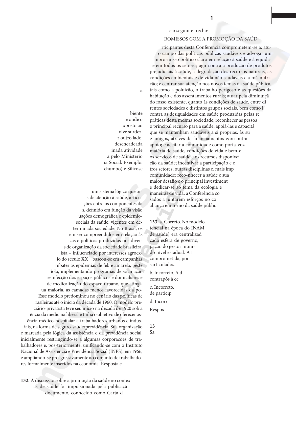 o Atestado Médico, por muitas vezes considerado um sim- ples ato corriqueiro pelo pro�ssional, é de suma importância para o requerente, devendo ser emitido de maneira adequada e correta, para que possa alcançar o seu �m social e evitar futuros transtornos de ordem ética e penal. Resposta c. 129. O objetivo do Departamento de Segurança e Saúde no Trabalho – DSST, dentre outros, é planejar e coordenar as ações de �scalização dos ambientes e condições de trabalho, prevenindo acidentes e doenças do trabalho, protegendo a vida e a saúde dos trabalhadores. Resposta b. 130. A doença do trabalho está mais ligada ao meio ambiente de trabalho, é aquela que tem ligação com o ambiente onde o trabalho é exercido. Ex: Um trabalhador que está exposto ao ruído excessivo, em um galpão de solda, e desenvolve surdez. Esse é um caso típico de doença do trabalho. Por outro lado, a doença pro�ssional é aquela produzida ou desencadeada pelo exercício do trabalho peculiar à determinada atividade e constante da respectiva relação elaborada pelo Ministério do Trabalho e Emprego e o da Previdência Social. Exemplo: Saturnismo (intoxicação provocada pelo chumbo) e Silicose (sílica). Resposta d. 131. O modelo de atenção à saúde é um sistema lógico que or- ganiza o funcionamento das redes de atenção à saúde, articu- lando, de forma singular, as relações entre os componentes da rede e as intervenções sanitárias, de�nido em função da visão prevalecente da saúde, das situações demográ�ca e epidemio- lógica e dos determinantes sociais da saúde, vigentes em de- terminado tempo e em determinada sociedade. No Brasil, os modelos de atenção podem ser compreendidos em relação às condições socioeconômicas e políticas produzidas nos diver- sos períodos históricos de organização da sociedade brasileira. O modelo campanhista – in�uenciado por interesses agroex- portadores no início do século XX baseou-se em campanhas sanitárias para combater as epidemias de febre amarela, peste bubônica e varíola, implementando programas de vacinação obrigatória, desinfecção dos espaços públicos e domiciliares e outras ações de medicalização do espaço urbano, que atingi- ram, em sua maioria, as camadas menos favorecidas da po- pulação. Esse modelo predominou no cenário das políticas de saúde brasileiras até o início da década de 1960. O modelo pre- -videnciário-privatista teve seu início na década de 1920 sob a in�uência da medicina liberal e tinha o objetivo de oferecer as- sistência médico-hospitalar a trabalhadores urbanos e indus- triais, na forma de seguro-saúde/previdência. Sua organização é marcada pela lógica da assistência e da previdência social, inicialmente restringindo-se a algumas corporações de tra- balhadores e, pos-teriormente, uni�cando-se com o Instituto Nacional de Assistência e Previdência Social (INPS), em 1966, e ampliando-se pro-gressivamente ao conjunto de trabalhado- res formalmente inseridos na economia. Resposta c. 132. A discussão sobre a promoção da saúde no contexto dos sistemas de saúde foi impulsionada pela publicação desse importante documento, conhecido como Carta de Ottawa. Destaca-se o seguinte trecho: COMPROMISSOS COM A PROMOÇÃO DA SAÚDE Os participantes desta Conferência comprometem-se a: atu- ar no campo das políticas públicas saudáveis e advogar um compro-misso político claro em relação à saúde e à equida- de em todos os setores; agir contra a produção de produtos prejudiciais à saúde, a degradação dos recursos naturais, as condições ambientais e de vida não saudáveis e a má-nutri- ção; e centrar sua atenção nos novos temas da saúde pública, tais como a poluição, o trabalho perigoso e as questões da habitação e dos assentamentos rurais; atuar pela diminuição do fosso existente, quanto às condições de saúde, entre dife- rentes sociedades e distintos grupos sociais, bem como lutar contra as desigualdades em saúde produzidas pelas regras e práticas desta mesma sociedade; reconhecer as pessoas como o principal recurso para a saúde; apoiá-las e capacitá-las para que se mantenham saudáveis a si próprias, às suas famílias e amigos, através de �nanciamentos e/ou outras formas de apoio; e aceitar a comunidade como porta-voz essencial em matéria de saúde, condições de vida e bem-estar; reorientar os serviços de saúde e os recursos disponíveis para a promo- ção da saúde; incentivar a participação e colaboração de ou- tros setores, outras disciplinas e, mais importante, da própria comunidade; reco-nhecer a saúde e sua manutenção como o maior desa�o e o principal investimento social dos governos; e dedicar-se ao tema da ecologia em geral e das diferentes maneiras de vida; a Conferência conclama a todos os interes- sados a juntarem esforços no com-promisso por uma forte aliança em torno da saúde pública. Resposta d. 133. a. Correto. No modelo médico-privatista (modelo assis- tencial na época do INAMPS), a gestão (direção da política de saúde) era centralizada, não favorecendo a gerência em cada esfera de governo, sobretudo, minimizando a partici- pação do gestor muni-cipal. Centrava-se na decisão federal e do nível estadual. A Integralidade era também grandemente comprometida, porque as ações e serviços de saúde eram de- sarticulados. b. Incorreto. A descentralização é o princípio (diretriz) que se contrapôs à centralização do nível federal c. Incorreto. O direito à informação se relaciona ao princípio de participação social d. Incorreto. Esses não são princípios que se opõem Resposta a. 134. Acessibilidade não é princípio do Sistema Único de Saúde. Mas trata-se de uma importante característica do sistema de saúde a ser monitorada. O princípio fundamen- tal que articula o conjunto de leis e normas que constituem a base jurídica da política de saúde e do