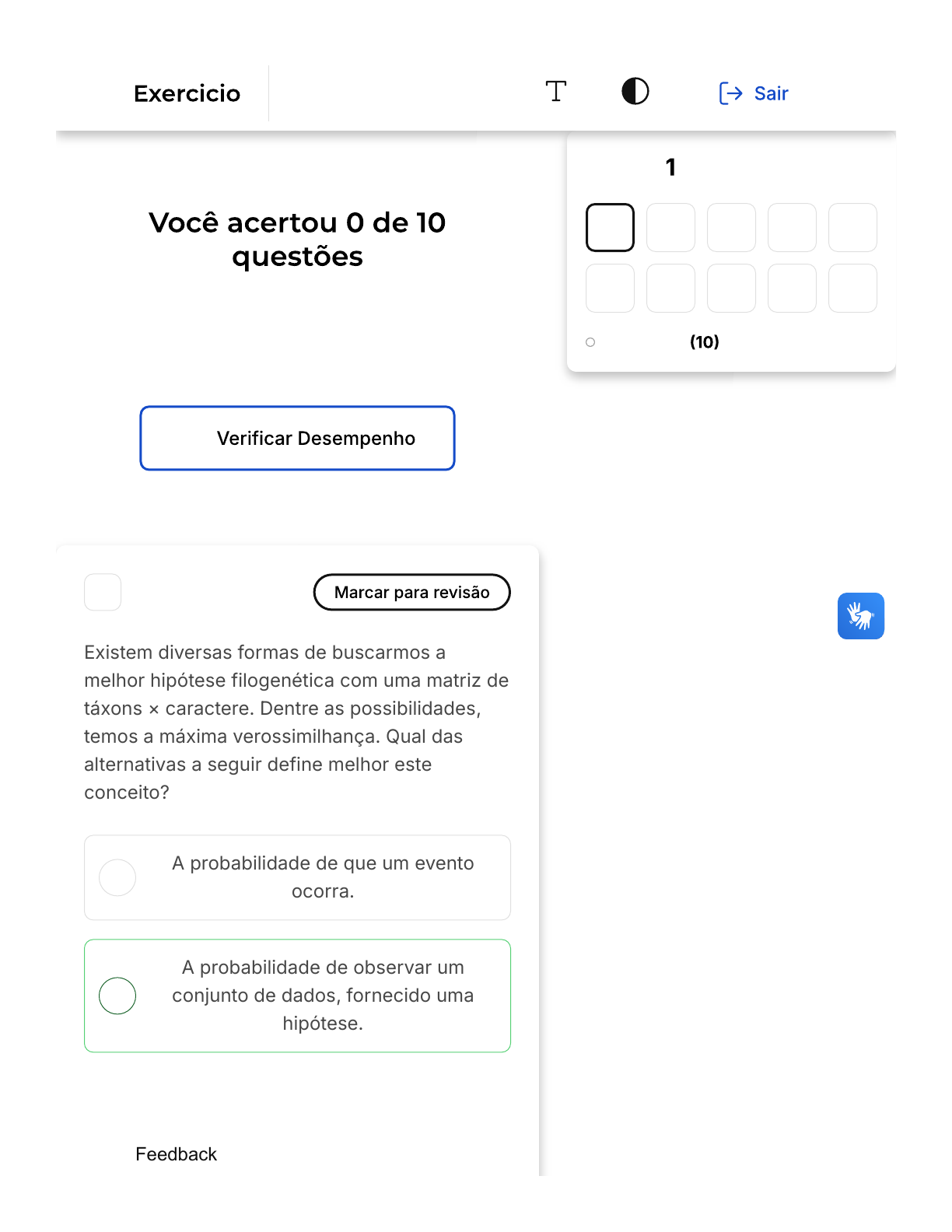 Verifique o seu desempenho e continue treinando! Você pode refazer o exercício quantas vezes quiser. A B 1 Existem diversas formas de buscarmos a melhor hipótese filogenética com uma matriz de táxons × caractere. Dentre as possibilidades, temos a máxima verossimilhança. Qual das alternativas a seguir define melhor este conceito? A probabilidade de que um evento ocorra. A probabilidade de observar um conjunto de dados, fornecido uma hipótese. Questão de 10 Em branco 1 2 3 4 5 6 7 8 9 10 Feedback Análise Filogenética Firefox https://estacio.saladeavaliacoes.com.br/exercicio/671a42eea029ad8caa... 1 of 21 24/10/2024, 09:52 C D E A probabilidade de que uma hipótese seja falsa através do método dos mínimos quadrados. A proporção das probabilidades de duas hipóteses alternativas. A melhor árvore calculada a partir da quantidade de passos, ou mudanças, nos ramos. Opa! A alternativa correta é a letra B. Confira o gabarito comentado! Feedback Firefox https://estacio.saladeavaliacoes.com.br/exercicio/671a42eea029ad8caa... 2 of 21 24/10/2024, 09:52 A A probabilidade de observar um conjunto de dados, fornecido uma hipótese. A máxima verossimilhança é um conceito que busca a probabilidade de observar um conjunto de dados, dada uma hipótese. Este método é diferente do teorema de Bayes, que calcula a probabilidade de um evento ocorrer entre outros. O método dos mínimos quadrados, por outro lado, é utilizado em métodos de distância e não em probabilidades. A quantidade de passos é um critério utilizado na parcimônia, e não na máxima verossimilhança. A inferência Bayesiana é um método que avalia a probabilidade posterior de uma árvore e incorpora informações prévias sobre a probabilidade de hipóteses alternativas. 2 Durante uma análise �MCMC�, o que determina quando uma cadeia se move da árvore atual para uma nova árvore? A cadeia sempre aceitará uma proposta que produza uma probabilidade posterior maior do que o estado atual. Feedback Firefox https://estacio.saladeavaliacoes.com.br/exercicio/671a42eea029ad8caa... 3 of 21 24/10/2024, 09:52 B C D E A cadeia Markoviana sempre aceitará uma proposta que seja consistente com a anterior. A cadeia Markoviana aceitará uma proposta com uma probabilidade que é fixada no início da pesquisa. A cadeia rejeitará uma proposta que produza uma probabilidade de log maior do que o estado atual. A probabilidade de aceitar uma proposta depende da razão entre as probabilidades posteriores entre o estado atual e proposto. Opa! A alternativa correta é a letra A. Confira o gabarito comentado! A cadeia sempre aceitará uma proposta que produza uma probabilidade posterior maior do que o estado atual. Na geração de uma cadeia Markoviana Monte Carlo �MCMC�, o novo estado é sempre aceito se a probabilidade posterior, ou log, for maior que a do estado atual. Isso significa que a cadeia MCMC está sempre buscando otimizar a probabilidade, movendo-se para estados com maior probabilidade. A probabilidade não é fixada no início e nem é calculada por Feedback Firefox https://estacio.saladeavaliacoes.com.br/exercicio/671a42eea029ad8caa... 4 of 21 24/10/2024, 09:52 A B C uma razão. Embora seja raro, a cadeia MCMC pode aceitar um ponto com probabilidade inferior ao anterior, mas isso ocorre apenas em circunstâncias específicas e não é a norma. 3 Observe o cladograma abaixo: Imagem Leandro Pederneiras A seguir são listadas alguns grupos de espécies. Analise as alternativas que, segundo o cladograma, se refere a um grupo parafilético. O conjunto de espécies G H I. O conjunto de espécies P Q R. O conjunto de espécies U V H. Feedback Firefox https://estacio.saladeavaliacoes.com.br/exercicio/671a42eea029ad8caa... 5 of 21 24/10/2024, 09:52 D E O conjunto de espécies A F. O conjunto de espécies J K L M. Opa! A alternativa correta é a letra E. Confira o gabarito comentado! O conjunto de espécies J K L M. Grupos parafiléticos são aqueles que faltam poucos descendentes, menos da metade, para se transformar em monofilético. Assim, na imagem da árvore filogenética, o grupo parafilético é o conjunto de espécies J K L M porque para ser monofilético só falta uma espécie I. O conjunto de espécies G, H, I; A e F; P, Q, R; U, V e H, precisariam incluir muito mais grupos para ser um grupo monofilético, pois alguns espécies do conjunto não apresentam um ancestral comum próximo, como é o exemplo do conjunto de espécies J K L M. Lembre-se que para descobrir o ancestral comum de dois táxons basta caminhar sempre para trás da filogenia iniciando do terminal (onde está o nome da espécie). 4 Para compreender o que diz uma árvoreFeedback Firefox https://estacio.saladeavaliacoes.com.br/exercicio/671a42eea029ad8caa... 6 of 21 24/10/2024, 09:52 A B C D E filogenética, diversas terminologias e conceitos são empregados. A seguir, são listados diferentes conceitos sobre a filogenia. Assinale a alternativa que retrata de forma correta um conceito das árvores filogenéticas: Terminal, num cladograma, significa um ramo com dois nós (duas divergências) nas extremidades. O ponto no qual o gráfico se inicia é denominado clado inferior, onde está a raiz da árvore. Quando queremos apontar um táxon duplicado dentro da árvore filogenética, dizemos que existe um grupo irmão. Podemos rodar os ramos em seu próprio eixo sem alterar as relações de parentesco, mas se cortarmos e colarmos um ramo em outra parte, dizemos que a topologia mudou. Topologia significa o táxon terminal, aqueles nomes que estão inseridos no topo da árvore filogenética. Opa! A alternativa correta é a letra D. Confira o gabarito comentado! Feedback Firefox https://estacio.saladeavaliacoes.com.br/exercicio/671a42eea029ad8caa... 7 of 21 24/10/2024, 09:52 A alternativa correta é a letra D. A explicação para isso é que, em uma árvore filogenética, é possível rodar os ramos em seu próprio eixo sem alterar as relações de parentesco