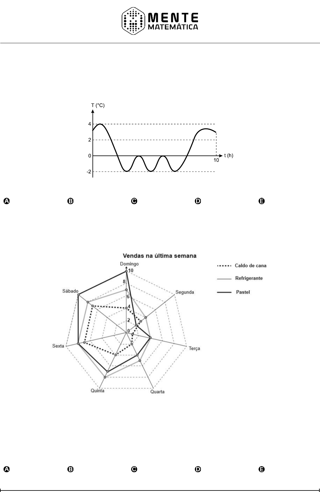 Competência 6 | Enem 495 – Versão Matemática P ág in a1 6 7 Questão 369 (H25 | ENEM 2022) Dificuldade 740,9 Uma máquina em operação tem sua temperatura T monitorada por meio de um registro gráfico, ao longo do tempo t. Essa máquina possui um pistão cuja velocidade V varia com a temperatura T da máquina, de acordo coma expressão 2V T 4.= − Após a máquina funcionar durante o intervalo de tempo de 10 horas, o seu operador analisa o registro gráfico, apresentado na figura, para avaliar a necessidade de eventuais ajustes, sabendo que a máquina apresenta falhas de funcionamento quando a velocidade do pistão se anula. Quantas vezes a velocidade do pistão se anulou durante as10 horas de funcionamento? 1 2 3 4 5 Questão 370 (H25 | ENEM 2019) Dificuldade 788,9 Um comerciante, que vende somente pastel, refrigerante em lata e caldo de cana em copos, fez um levantamento das vendas realizadas durante a semana. O resultado desse levantamento está apresentado no gráfico. Ele estima que venderá, em cada dia da próxima semana, uma quantidade de refrigerante em lata igual à soma das quantidades de refrigerante em lata e caldo de cana em copos vendidas no respectivo dia da última semana. Quanto aos pastéis, estima vender, a cada dia da próxima semana, uma quantidade igual à quantidade de refrigerante em lata que prevê vender em tal dia. Já para o número de caldo de cana em copos, estima que as vendas diárias serão iguais às da última semana. Segundo essas estimativas, a quantidade a mais de pastéis que esse comerciante deve vender na próxima semana é 20. 27. 44. 55. 71.