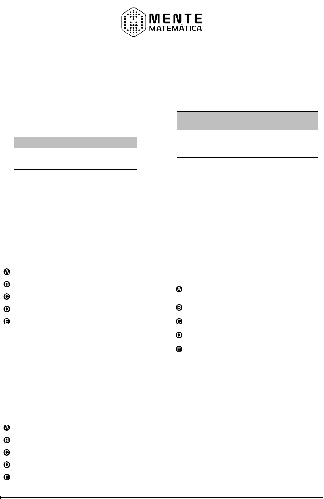 Competência 1 | Enem 495 – Versão Matemática P ág in a4 1 Questão 062 (H4 | ENEM 2018) Dificuldade 634,9 O colesterol total de uma pessoa é obtido pela soma da taxa do seu “colesterol bom” com a taxa do seu “colesterol ruim”. Os exames periódicos, realizados em um paciente adulto, apresentaram taxa normal de “colesterol bom”, porém, taxa do “colesterol ruim” (também chamado LDL) de 280 mg/dL. O quadro apresenta uma classificação de acordo com as taxas de LDL em adultos. Taxa de LDL (mg/dL) Ótima Menor do que 100 Próxima de ótima De 100 a 129 Limite De 130 a 159 Alta De 160 a 189 Muito alta 190 ou mais O paciente, seguindo as recomendações médicas sobre estilo de vida e alimentação, realizou o exame logo após o primeiro mês, e a taxa de LDL reduziu 25%. No mês seguinte, realizou novo exame e constatou uma redução de mais 20% na taxa de LDL. De acordo com o resultado do segundo exame, a classificação da taxa de LDL do paciente é ótima. próxima de ótima. limite. alta. muito alta. Questão 063 (H4 | ENEM 2021) Dificuldade 637,9 Um lava-rápido oferece dois tipos de lavagem de veículos: lavagem simples, ao preço de R$ 20,00, e lavagem completa, ao preço de R$ 35,00. Para cobrir as despesas com produtos e funcionários, e não ter prejuízos, o lava-rápido deve ter uma receita diária de, pelo menos, R$ 300,00. Para não ter prejuízo, o menor número de lavagens diárias que o lava-rápido deve efetuar é 6. 8. 9. 15. 20. Questão 064 (H4 | ENEM 2021) Dificuldade 649,9 Um ciclista amador de 61 anos de idade utilizou um monitor cardíaco para medir suas frequências cardíacas em quatro diferentes tipos de trechos do percurso. Os resultados das frequências cardíacas máximas alcançadas nesses trechos foram: Trechos do percurso Frequências cardíacas máximas (bpm) Leve no plano 90 Forte no plano 120 Subida moderada 130 Subida forte 140 Sabe-se que a faixa aeróbica ideal para o ganho de condicionamento físico é entre 65% e 85% da frequência cardíaca máxima (Fc máx.), que, por sua vez, é determinada pela fórmula: Fc máx. = 220 – idade, em que a idade é dada em ano e Fc máx. é dada em bpm (batimento por minuto). Os trechos do percurso nos quais esse ciclista se mantém dentro de sua faixa aeróbica ideal, para o ganho de condicionamento físico, são leve no plano, forte no plano, subida moderada e subida forte. leve no plano, forte no plano e subida moderada. forte no plano, subida moderada e subida forte. forte no plano e subida moderada. leve no plano e subida forte.