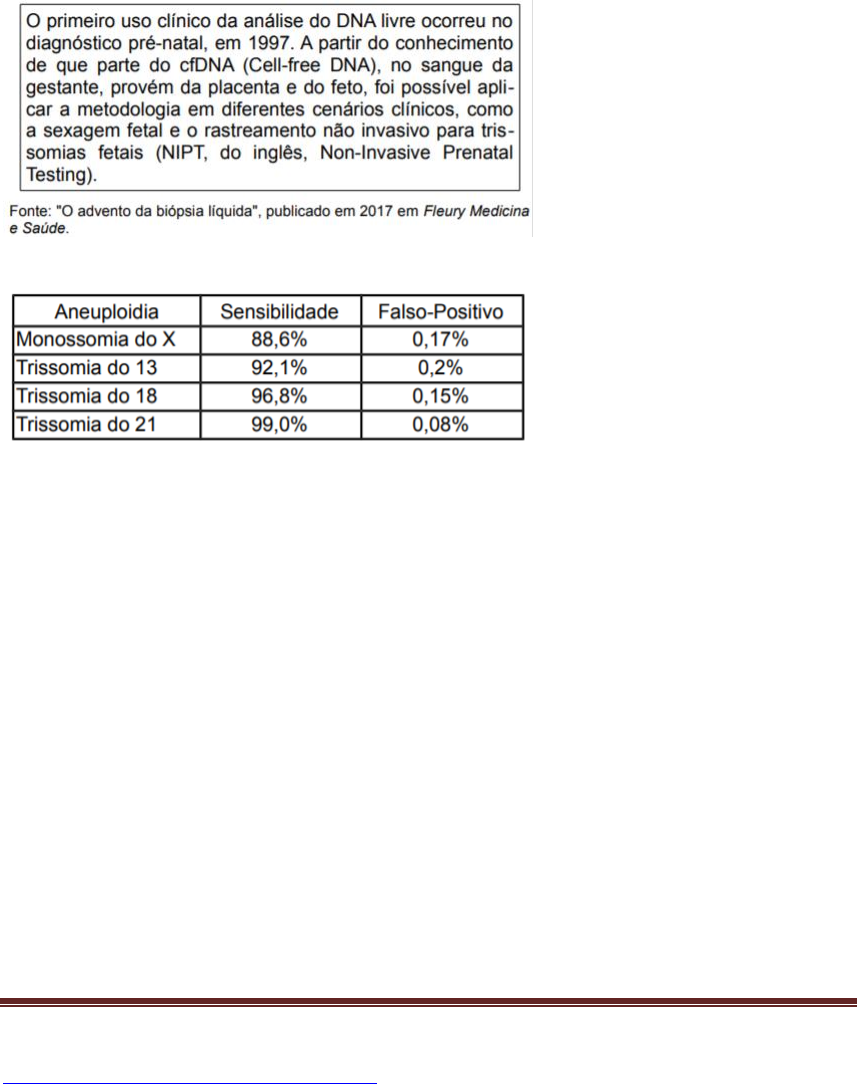 + DE 1000 QUESTÕES DE BIOMEDICINA PARA ESTUDO Profa. Dra. Débora Machado Barreto @biomedicina_ofuturo https://instabio.cc/biomedicinaofuturo Página 235 QUESTÃO 838 (CS-UFG) Um paciente de 63 anos, do sexo masculino, morador de Goiânia-GO, durante uma consulta, queixou-se de disúria intensa, urgência urinária associada a tenesmo e hematúria. Vários exames foram solicitados e o paciente foi diagnosticado com câncer de bexiga (estadiamento III). Foram solicitados exames genéticos e identificou-se um gene cuja principal função é estimular a ação de CKI, que é um tipo de A) oncogene. B) gene supressor de tumor. C) gene do mecanismo de reparo de DNA. D) gene de regulação de xenobióticos. QUESTÃO 839 (CS-UFG) Leia o trecho a seguir A tabela a seguir mostra o resultado de um rastreamento de aneuploidias fetais pelo NIPT. Considerando as informações apresentadas sobre a sensibilidade dessa metodologia, A) o teste mais sensível e com menor frequência de erro é aquele que diagnosticou as síndromes de Edwards. B) a síndrome de Turner apresenta a menor sensibilidade dentre as aneuploidias rastreadas e de maior taxa de falsos-positivos. C) a síndrome de Patau é aquela com a segunda menor sensibilidade e menor taxa de falsos-positivos. D) a síndrome de Down, dentre as aneuploidias rastreadas, é aquela em que o NIPT apresentou melhor desempenho. QUESTÃO 840 (CS-UFG) Em uma mesma semana, o laboratório de citogenética fez vários exames de cariótipo e alguns de FISH. Dentre os resultados alterados, percebeu- se: (1) 45,X; (2) 47,XX+21; e (3) 44,XY-5. Esses achados de aneuploidias correspondem, respectivamente, a A) monossomia sexual, trissomia autossômica e nulissomia autossômica. B) monossomia autossômica, trissomia sexual e monossomia autossômica. https://instabio.cc/biomedicinaofuturo