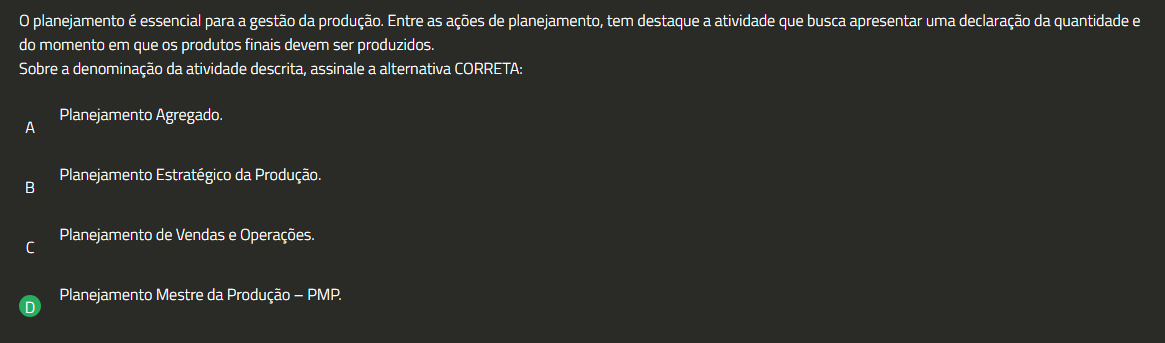 planejamento é essencial para a gestão da produção. Entre as ações de planejamento, tem destaque a atividade que busca apresentar uma declaração da quantidade e do momento em que os produtos finais devem ser produzidos. Sobre a denominação da atividade descrita, assinale a alternativa CORRETA: Planejamento Agregado. A Planejamento Estratégico da Produção. B Planejamento de Vendas e Operações. Planejamento Mestre da Produção - PMP. D