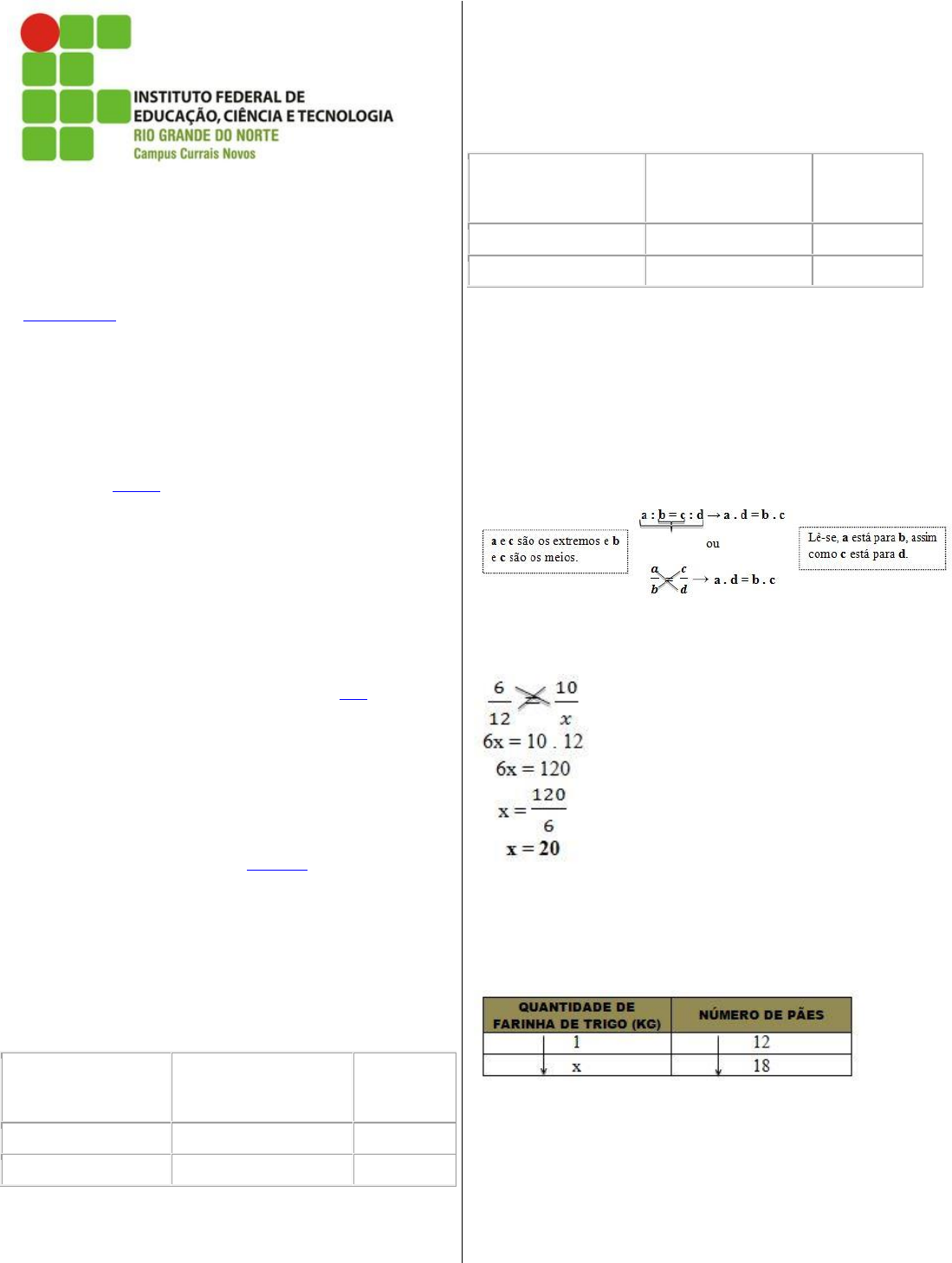 DISCIPLINA: MATEMÁTICA BÁSICA PROF. ELIONARDO ROCHELLY TEC. ALIMENTOS TEC. SISTEMAS INTERNET MATUTINO/VESPERTINO O conhecimento e a utilização de conceitos semelhantes à regra de três são muito antigos, tendo sua provável origem na China antiga, podendo ser observados em tempos muito distantes. Vários problemas envolvendo manipulações muito próximas do que hoje conhecemos como regra de três podem ser vistos no Papiro Rhind, documento confeccionado no Egito há cerca de 3000 anos. Mais recente que o Papiro Rhind, o livro Liber Abaci do matemático italiano Leonardo Fibonacci (1175-1250) revela vários problemas envolvendo a regra de três. Apesar de sua criação ser tão remota, as aplicações relativas à regra de três são as mais variadas. Tratando da matemática utilitária, podemos dizer que a regra de três é primordial a nossa vida, pois soluciona questões corriqueiras com muita simplicidade e economia de tempo. Vejam abaixo alguns problemas envolvendo regra de três simples e composta, direta e inversamente proporcionais. 1. Um quilo (usarei “quilo” simplificadamente para representar quilograma (Kg)) de farinha de trigo é suficiente para fazer 12 pães. De quanta farinha necessito para fazer 18 pães? 2. Quatro pedreiros constrói uma pequena casa em 90 dias. Dois pedreiros construirá a mesma casa em quanto tempo? 3. Se 8 homens levam 12 dias montando 16 máquinas, então, nas mesmas condições, 15 homens levarão quantos dias para montar 50 máquinas? 4. Trabalhando 6 dias, 5 operários produzem 400 peças. Quantas peças desse mesmo tipo serão produzidas por 7 operários em 9 dias de trabalho? Ainda neste artigo, em momento oportuno, solucionaremos os problemas propostos acima. Grandezas diretamente proporcionais Dizemos que duas grandezas são diretamente proporcionais quando o aumento de uma implica o aumento da outra. Ao dobrarmos uma grandeza, a outra também será dobrada, ao triplicarmos uma, a outra também será triplicada. Em outras palavras, grandezas diretamente proporcionais variam sempre na mesma razão. Vejam o exemplo NÚMERO DE PESSOAS DE CERTA FAMÍLIA DESPESA SEMANAL COM ALIMENTAÇÃO (R$) RAZÃO 4 200 1/50 5 250 1/50 Observação: A tabela acima é meramente ilustrativa e supõe que com o ingresso de mais um membro nesta família aumentará proporcionalmente sua despesa semanal. Grandezas inversamente proporcionais Duas grandezas são inversamente proporcionais quando o aumento de uma implica na redução da outra, ou seja, quando dobramos uma delas, a outra se reduz a metade; quando triplicamos uma delas, a outra fica reduzida a terça parte, etc. Os números racionais x, y e z são inversamente proporcionais aos números racionais a, b e c, respectivamente, quando se tem: x . a = y . b = z . c Veja o exemplo NÚMERO DE OPERÁRIOS DE CERTA OBRA DIAS GASTOS PARA CONCLUI-LA (DIAS) RELAÇÃO x.a = y.b 12 60 12 . 60 = 720 6 120 6 . 120 = 720 Razão: 12/6 = 2/1 60/120 = 1/2 Note que 12/6 e 60/120 possuem razões inversas, isto é, 2/1 é o inverso de 1/2. Regra de três simples Quando, em uma relação entre duas grandezas, conhecemos três valores de um problema e desconhecemos apenas um, poderemos chegar a sua solução utilizando os princípios da regra de três simples. Para isso, basta que multipliquemos os meios entre si e os extremos também entre si. Acompanhem: Exemplo: os números 6 e 10 são diretamente proporcionais a 12 e x respectivamente. Nessas condições, vamos encontrar o valor de x que torne essa afirmação verdadeira. Vamos à solução dos problemas (1) e (2) propostos no início deste trabalho. (1) Um quilo de farinha de trigo é suficiente para fazer 12 pães. De quanta farinha necessito para fazer 18 pães? ● Vamos chamar o valor desconhecido de x e montar uma tabela contendo os valores. Inicialmente teremos que analisar se as grandezas quantidade de farinha de trigo e número de pães são inversa ou diretamente proporcionais. Se duplicarmos a quantidade de farinha de trigo, a quantidade de pães também duplicará. Se triplicarmos a farinha, os pães também serão triplicados, e assim por diante. Sendo assim, somos levados a concluir que essas duas grandezas são diretamente proporcionais; http://www.infoescola.com/matematica/regra-de-tres-simples-e-composta/ http://www.infoescola.com/matematica/regra-de-tres-simples-e-composta/ http://www.infoescola.com/matematica/regra-de-tres-simples-e-composta/ http://www.infoescola.com/matematica/regra-de-tres-simples-e-composta/ http://www.infoescola.com/wp-content/uploads/2012/12/regra-de-tres1.jpg http://www.infoescola.com/wp-content/uploads/2012/12/regra-de-tres2.jpg http://www.infoescola.com/wp-content/uploads/2012/12/regra-de-tres3.jpg Sabendo dessa informação, basta escrevermos a proporção de acordo com o quadro acima e partir para sua solução; As flechas no mesmo sentido indicam que as grandezas são diretamente proporcionais. Conclusão: para fazer 18 pães precisaremos de 1,5 kg de farinha de trigo. (2) Quatro pedreiros constroem uma pequena casa em 90 dias. Dois pedreiros construirão a mesma casa em quanto tempo? ● Vamos chamar o valor desconhecido de x e montar uma tabela contendo os valores. Como no caso anterior, teremos que analisar se as grandezas quantidade de pedreiros e dias gastos na construção são inversa ou diretamente proporcionais. Se aumentarmos o número de pedreiros, a duração da obra será reduzida, portanto, essas grandezas são inversamente proporcionais; Sabendo dessa informação, basta escrevermos a proporção de acordo com o quadro acima e partir para sua solução; Como as grandezas são inversamente proporcionais, devemos inverter uma das frações; As setas contrárias indicam que as grandezas são inversamente proporcionais. Conclusão: se reduzirmos o número de pedreiro a dois, teremos a obra concluída em 180 dias. Regra de três composta Quando trabalhamos com três grandezas, direta ou inversamente proporcionais 