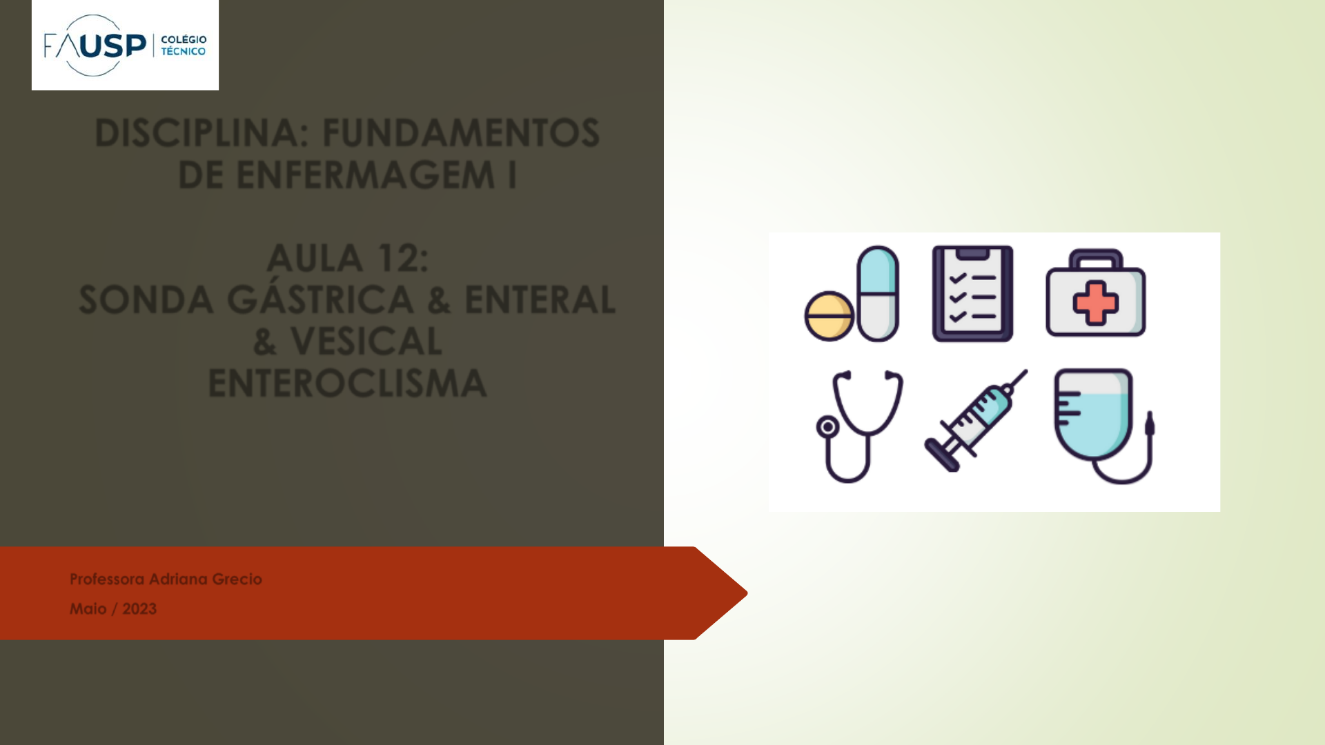 DISCIPLINA: FUNDAMENTOS DE ENFERMAGEM I AULA 12: SONDA GÁSTRICA & ENTERAL & VESICAL ENTEROCLISMA Professora Adriana Grecio Maio / 2023 CONCEITO DE SONDA Sondas ou catéteres são tubos inseridos no organismo para a infusão ou retirada de fluidos A sonda se caracteriza como qualquer tipo de tubo estéril (de plástico PVC, látex e silicone) sendo flexível ou rígido. A sonda é introduzida em um orifício com guia ou não. Serve para realizar algum tipo de investigação diagnóstica, administração de medicamentos, administração de alimentos ou eliminação. SONDA FOLEY SONDA LEVINE SONDA ENTERAL CONCEITO DE SNG X SNE X SVD ❑ Sonda Nasoenteral (SNE): utilizada para administrar medicamentos e alimentos quando o paciente perde a capacidade ingerir os mesmo, evitando a broncoaspiração. Depois de instalada é necessário saber se a sonda está posicionada corretamente, através de um Raio X. ❑ Sonda Nasogástrica (SNG): a mesma definição da sonda Nasoenteral, sendo que pode ser usada aberta para eliminação de líquidos e fechada para administrar medicamentos e alimentos. ❑ Sonda Vesical de Alívio ou Demora (SVD): é o cateterismo de alívio aquele realizado quando o paciente não consegue expelir naturalmente e totalmente a urina; e o cateterismo de demora ocorre quando o paciente também não consegue expelir a urina sozinho e tem a necessidade de ficar com o cateter por mais de vinte e quatro horas, evitando assim o risco de infecção maior. RESOLUÇÃO COFEN Nº 619/2019 Normatiza a atuação da Equipe de Enfermagem na Sondagem Oro/nasogástrica e Nasoentérica. DIFERENÇAS ENTRE SNG X SNE ACESSÓRIOS PARA SONDAS ENTERAIS & GÁSTRICAS SONDAGEM NASOGÁSTRICA ( SNG) Consiste na introdução de uma sonda de calibre variado, através do nariz ou boca até a cavidade gástrica. FINALIDADES: Favorecer a alimentação, drenagem, coleta de materiais para exame e administração de medicações Podemos manter a sonda: ABERTA: para drenar a secreção gástrica, controle de débito drenado FECHADA: para alimentação e medicações INDICAÇÕES DA SNG • Preparação pré-operatória para algumas cirurgias • Problemas gastrintestinais com dieta elementar • Terapia para o câncer • Cuidados na convalescença • Coma / Intubação • Cirurgia maxilofacial ou de cabeça e pescoço • Lavagem gástrica • Alívio das distensões gástricas • Coleta de materiais para exame do suco gástrico • Casos de hemorragias gástricas TIPOS DE SONDA GÁSTRICA Sonda de Levine: É uma das mais usadas, existindo no mercado tanto tubos de plástico como de borracha, com orifícios laterais próximos à ponta; são passadas normalmente pelas narinas. Apresenta uma única luz (números 14 a 18). Sonda gástrica simples (“Salem-VENTROL”): é uma sonda radiopaca, de plástico claro, dotada de duas luzes. É usada para descomprimir o estômago e mantê-lo vazio; Sonda Nutriflex: é uma sonda usada para nutrição. Possui 76 cm de comprimento e uma ponta pesada de mercúrio para facilitar sua inserção. É protegida por um lubrificante que é ativado quando é umidificado; Sonda de MOSS: é uma sonda de descompressão gástrica de 90 cm de comprimento, três luzes e somente um balão que serve para fixar a sonda ao estômago quando inflado. O cateter de descompressão serve para aspiração gástrica e esofagiana, como também para lavagem. A terceira luz é uma via para alimentação duodenal; Sonda S-B: é usada para tratar sangramento de varizes esofagianas. Tem 3 luzes e 2 balões; duas das luzes são utilizadas para inflar os balões, enquanto a terceira é usada para lavagem gástrica e para monitorizar o sangramento. SONDA LEVINE SONDA NUTRIFLEX SONDA S- B (Sengstaken-Blakemore) SONDA MOSS MATERIAIS NECESSÁRIOS ➢ Sonda nasogástrica (de acordo com a solicitação do Enfermeiro) ➢ Gel hidrossolúvel para lubrificar a sonda; ➢ Luvas de procedimentos; ➢ Tiras de teste de pH (para medir a acidez do aspirado gástrico); ➢ Abaixador de língua; ➢ Biombo; ➢ Gaze; ➢ Seringa com bulbo ou ponta-cateter (20 mL); ➢ Estetoscópio; ➢ Água filtrada; ➢ Fita hipoalérgica ou dispositivo de fixação comercial; ➢ Toalha de rosto; ➢ Copo de água com canudo. LAVAGEM GÁSTRICA É a introdução, através da SNG, de líquido na cavidade gástrica, seguida de sua remoção. Tem como objetivo, remover do estômago substâncias tóxicas ou irritantes, preparar para cirurgias do aparelho digestivo. Deve-se evitar a lavagem gástrica em casos de envenenamento por substâncias cáusticas, para não provocar perfuração do esôfago ou estômago, pela sonda. ASPIRAÇÃO GÁSTRICA Antes de administrar qualquer substância via sonda, é necessário aspirar o líquido que está dentro do estômago. Dobre a ponta da sonda e aperte, evitando a entrada de ar no tubo e, então, retire a tampa. Encaixe a seringa, desdobre o tubo e puxe o êmbolo, aspirando o conteúdo gástrico. Caso o volume aspirado corresponda a mais da metade da refeição anterior, é recomendado aguardar para alimentá-la mais tarde. O conteúdo aspirado deve sempre ser reposto. Ao término, dobre novamente a ponta da sonda, repetindo o procedimento para que não entre ar no tubo e retire a seringa, voltando a tampá-la. ASSISTÊNCIA DE ENFERMAGEM AO PACIENTE COM SNG ATENTAR para quando a sonda for aberta você deve dobrar sua extremidade para evitar a entrada de ar; Verificar se há presença de resíduos, aspirando o conteúdo gástrico, depois disso, pode administrar a alimentação ou medicamentos; Deve-se fechar a sonda 30 minutos antes da administração de dieta ou medicamentos; É preciso manter fechada a sonda 30 minutos depois da administração de dieta ou medicamentos; Lavar a sonda com mais ou menos 20 ml de água após administração de dieta ou medicamentos, ou seja, evitar a obstrução da sonda; Manter a fixação da sonda sempre íntegra; Realizar troca da fixação da sonda a cada 24 horas ou