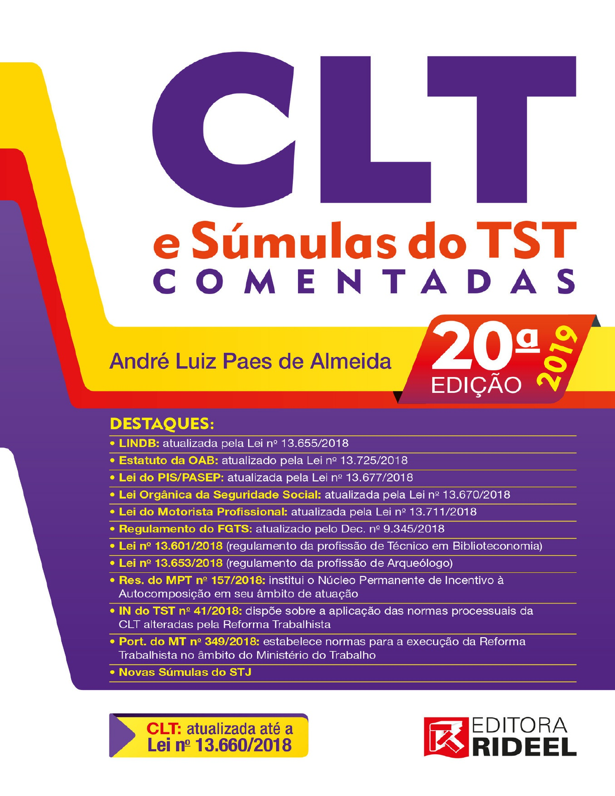 CDU-34:331(81)(094) Expediente Presidente e Editor Italo Amadio Diretora Editorial Katia F. Amadio Editoras Sue Ellen Gelli Revisão Equipe Rideel Projeto Gráfico Sergio A. Pereira Diagramação Sheila Fahl / Projeto e Imagem Dados Internacionais de Catalogação na Publicação (CIP) Angélica Ilacqua CRB-8/7057 Almeida, André Luiz Paes de CLT e Súmulas do TST Comentadas / André Luiz Paes de Almeida. – 20. ed. – São Paulo : Rideel, 2018. ISBN 978-85-339-5400-7 1. Súmulas jurisprudenciais 2. Trabalho – Leis e legislação – Brasil I. Título. II. Série. 18-1858 Índice para catálogo sistemático: 1. Brasil : Consolidação das Leis do Trabalho : Súmulas jurisprudenciais Edição Atualizada até 16-10-2018 © Copyright – Todos os direitos reservados à Av. Casa Verde, 455 – Casa Verde CEP 02519-000 – São Paulo – SP e‑mail: sac@rideel.com.br www.editorarideel.com.br Proibida a reprodução total ou parcial desta obra, por qualquer meio ou processo, especialmente gráfico, fotográfico, fonográfico, videográfico, internet. Essas proibições aplicam-se também às características de editoração da obra. A violação dos direitos autorais é punível como crime (art. 184 e parágrafos, do Código Penal), com pena de prisão e multa, conjuntamente com busca e apreensão e indenizações diversas (artigos 102, 103, parágrafo único, 104, 105, 106 e 107, incisos I, II e III, da Lei no 9.610, de 19/02/1998, Lei dos Direitos Autorais). 1 3 5 7 9 8 6 4 2 1 0 1 8 http://www.editorarideel.com.br À minha querida tia, MARIA JOSÉ DA COSTA PAES DE ALMEIDA, pelo inquestionável carinho e cumplicidade em toda minha jornada. (in memoriam) Um dos maiores prazeres que poderia ter está ocorrendo na presente obra. Ter AMADOR PAES DE ALMEIDA prefaciando minha CLT é a realização de um sonho, não só pelo que representa no mundo jurídico, mas, sobretudo, pelo que sempre representou na minha vida. Não só na minha formação profissional (a qual devo praticamente tudo a ele), mas principalmente pelo amor, carinho, crédito e confiança sempre despendidos ao longo da minha jornada, cujo agradecimento não se consubstancia somente com estas singelas linhas, mas, sobretudo, com o dever diário de engrandecer ainda mais seu nome. Obrigado Amador. PREFÁCIO André Luiz Paes de Almeida é, inquestionavelmente, uma dessas vocações predestinadas ao magistério. Eloquente, culto, didata por excelência, torna suas aulas momentos de agradável e proveitoso saber. Esse talento natural, que faz conceituado mestre do direito, nos cursos em que ministra e nas constantes palestras proferidas por todo o País, se volta agora e com pleno êxito para a elaboração de livros jurídicos, plenamente consagrados no mundo universitário, tais como Direito do trabalho (material, processual e legislação especial), Vademecum Trabalhista, ambos da editora Rideel, Direito e Processo do trabalho (coleção elementos do direito), Prática trabalhista, Exames da OAB (coautoria), Resumo de Bolso de Direito do Trabalho, Resumo de Bolso de Processo do Trabalho, Resumo de Bolso de Empregado Doméstico (todos de outras casas editoriais com sucessivas reedições). Desta feita, reunindo qualidade, competência e talento, brinda‑nos com a sua CLT e Súmulas do TST Comentadas, trazendo, numa linguagem clara e precisa, a interpretação mais correta da nossa complexa legislação trabalhista, livro que, escudado com mais de 40 anos de magistério universitário e 30 anos como magistrado do trabalho, recomendamos como orientador indispensável a advogados e universitários em geral. AMADOR PAES DE ALMEIDA Desembargador Federal aposentado do Tribunal Regional do Trabalho da 2a Região/SP. Professor Titular de Direito Comercial e Processo do Trabalho da Universidade Mackenzie. É Membro da Associação Latino Americana de Derecho Del Trabajo de Tucuman – Argentina. Mestre e Doutor em Direito, autor de várias obras relacionadas à esfera trabalhista e comercial com sucessivas reedições. HOMENAGEM ESPECIAL AOS ALUNOS Aos meus alunos, cujo carinho por este professor se demonstra em inúmeras manifestações, entre as quais destaco: Ilustríssimo Senhor Doutor Professor André Luiz Paes de Almeida Tullio Novello, brasileiro, casado, corintiano, por seus 15 alunos de Taubaté, vem, tempestivamente à presença de V. Sa. apresentar sua: DESPEDIDA Amanhã é o último dia de convívio com você e essa classe inteligente, No domingo, com o que aprendemos, certamente ficaremos contentes. Nesse mês, as pessoas legais de lugares distantes, que conhecemos, Que pena, cada um vai tocar a sua vida, e nunca mais as veremos. Correria, trabalho, estudo, filhos, não percebemos que passam os anos, E esquecemos de ver ou ligar para os amigos e parentes que amamos. Mas esta referida decisão não merece prosperar, pois é inteiramente divorciada dos preceitos legais. Senão vejamos: DO PROFESSOR Nos dias que ficamos com ele, cheguei não sabendo nada, Achei o professor prepotente, e que era a pessoa errada. O tempo foi passando e percebi que ele manjava muito da matéria, Que era versátil, dosava bem a aula e motivava a plateia. Que a provocação era técnica, pois essa não é uma ciência exata, Esta era a sua maneira de não deixar a aula chata. Repetia, repetia peças, não deixando que a peteca caísse, Em mês, eu não aguentava mais fazer peças, o que é uma chatice! DO SÃO PAULO Ele só tinha um problema, quando o São Paulo ganhava vinha todo prosa, E para nos provocar, vestia aquela camisa horrorosa! No final eu percebi que, apesar de são paulino, era um cara legal, Se ele nasceu assim, não teve culpa, o pai dele não fez por mal. DO CHATO Enchi o saco dele um mês inteiro com piadas sem graça, perturbei muito, Acho que exagerei, e até me desculpo agora, Pensei até que o Prima iria me mandar embora. Pra aguentar um cara chato como eu tem que ser bem preparado, Nunca me tratou mal, sempre foi muito presta