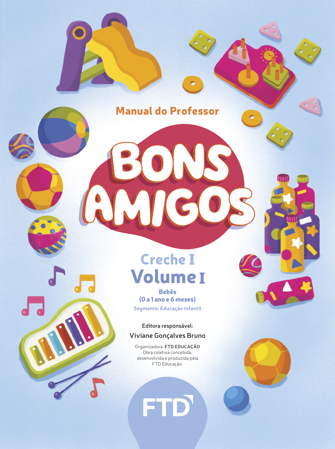 Segm ento: Educação Infantil Creche 9 7 8 6 5 5 7 4 2 0 1 2 6 ISBN 978-65-5742-012-6 M anual do P rofessor Editora responsável: Viviane Gonçalves Bruno Organizadora: FTD EDUCAÇÃO Obra coletiva concebida, desenvolvida e produzida pela FTD Educação. Segmento: Educação Infantil Bebês (0 a 1 ano e 6 meses) Creche Volume Manual do Professor D2-g22_ftd_capa_bons_amigos_creche_v1.indd All PagesD2-g22_ftd_capa_bons_amigos_creche_v1.indd All Pages 9/25/20 4:23 PM9/25/20 4:23 PM G U I A P N L D G U I A P N L D 1ª edição São Paulo, 2020 Licenciada em Pedagogia pela Universidade Estadual de Londrina (UEL-PR). Especialista em Psicopedagogia pela Universidade Estadual de Londrina (UEL-PR). Atualmente é editora de materiais didáticos. Editora responsável: Viviane Gonçalves Bruno Organizadora: FTD EDUCAÇÃO Obra coletiva concebida, desenvolvida e produzida pela FTD Educação. Segmento: Educação Infantil Bebês (0 a 1 ano e 6 meses) Creche Volume Manual do Professor g22_ftd_frontis_bons_amigos_creche_v1.indd 2g22_ftd_frontis_bons_amigos_creche_v1.indd 2 10/3/20 5:20 PM10/3/20 5:20 PM G U I A P N L D Bons amigos – Creche I (Educação Infantil – Volume I – Bebês – 0 a 1 ano e 6 meses) Copyright © FTD Educação, 2020 Dados Internacionais de Catalogação na Publicação (CIP) (Câmara Brasileira do Livro, SP, Brasil) Bons amigos - creche I - volume I - bebês - (0 a 1 ano e 6 meses) : segmento : educação infantil: manual do professor / organizadora FTD educação; obra coletiva concebida, desenvolvida e produzida pela FTD Educação; editora responsável: Viviane Gonçalves Bruno. -- 1. ed. -- São Paulo : Editora FTD, 2020. ISBN 978-65-5742-012-6 (professor) ISBN 978-65-5742-009-6 (material digital PDF) 1. Educação Infantil I. Bruno, Viviane Gonçalves. 20-42855 CDD-372.21 Índices para catálogo sistemático: 1. Educação infantil : Creches e pré-escolas : Pedagogia : Educação 372.21 Aline Graziele Benitez - Bibliotecária - CRB-1/3129 Impresso no Parque Gráfico da Editora FTD CNPJ 61.186.490/0016-33 Avenida Antonio Bardella, 300 Guarulhos-SP – CEP 07220-020 Tel. (11) 3545-8600 e Fax (11) 2412-5375 Reprodução proibida: Art. 184 do Código Penal e Lei 9.610 de 19 de fevereiro de 1998. Todos os direitos reservados à EDITORA FTD Rua Rui Barbosa, 156 – Bela Vista – São Paulo-SP CEP 01326-010 – Tel. 0800 772 2300 Caixa Postal 65149 – CEP da Caixa Postal 01390-970 www.ftd.com.br central.relacionamento@ftd.com.br ELABORADORES DE ORIGINAIS Alessandra Dedéco Furtado Rossetto Licenciada em Pedagogia pela Universidade Federal do Paraná (UFPR). Mestre em Ensino de Ciências Humanas, Sociais e da Natureza pela Universidade Tecnológica Federal do Paraná (UTFPR). Professora com experiência em Educação Infantil e nos Anos Iniciais do Ensino Fundamental. Emanuele Cristina Rodrigues Gonçalves Licenciada em Pedagogia pelo Centro Universitário de Belo Horizonte (UniBH-MG). Professora com experiência em Educação Infantil e nos Anos Iniciais do Ensino Fundamental. Atualmente é educadora social na Associação Mineira de Proteção à Criança. Gislaine Moreira Matos Graduada em Musicoterapia pela Faculdade de Artes do Paraná (FAP-PR). Especialista em Educação Infantil pela Universidade Positivo. Professora com experiência em Educação Infantil. Natasha Yukari Schiavinato Nakata Licenciada em Pedagogia pela Universidade Estadual de Londrina (UEL-PR). Mestre em Educação pela Universidade Estadual de Londrina (UEL-PR). Atualmente participa da produção de projetos didáticos de Educação Infantil e desenvolve pesquisas na área de Educação Infantil. Viviane Gonçalves Bruno Licenciada em Pedagogia pela Universidade Estadual de Londrina (UEL-PR). Especialista em Psicopedagogia pela Universidade Estadual de Londrina (UEL-PR). Atualmente é editora de materiais didáticos. Zuleika Camargo Leite de Toledo Licenciada em Pedagogia pela Universidade Bandeirante de São Paulo (Uniban-SP). Especialista em Educação Infantil pelo Centro de Estudos Superiores de Londrina (Cesulon-PR). Mestre em Educação pela Universidade Estadual de Londrina (UEL-PR). Professora com experiência em Educação Infantil e nos Anos Iniciais do Ensino Fundamental, também atuou na formação profissional de professores da rede pública. Atualmente é professora em cursos de Pós-graduação na área de formação profissional de professores. Direção geral Ricardo Tavares de Oliveira Direção editorial adjunta Luiz Tonolli Gerência editorial Natalia Taccetti Edição Luciana Leopoldino (coord.) Preparação e revisão de textos Viviam Moreira (sup.) Gerência de produção e arte Ricardo Borges Design Daniela Máximo (coord.) Arte e produção Rodrigo Carraro Moutinho (sup.) Coordenação de imagens e textos Elaine Bueno Koga Projeto e produção editorial Scriba Soluções Editoriais Edição Alessandra R. Avanso, Denise A. dos Santos Oliveira, Juliana Santo Sosso, Mariana Cavalcante Diamante, Viviane Gonçalves Bruno Assistência editorial Isabela Ventura Silvério Biz, Taciane Marcelle Marques Colaboração técnico-pedagógica Eliana Justino Carolli Preparação e revisão Joyce Graciele Freitas, Moisés Manzano da Silva Supervisão de produção editorial Priscilla de Freitas Cornelsen Rosa Assistência de produção editorial Lorena França Fernandes Pelisson Coordenação de produção de arte Tamires Rose Azevedo Edição de arte Camila Ferreira Projeto gráfico e design Marcela Pialarissi Projeto de capa Marcela Pialarissi Fotografia de capa Marko Geber/DigitalVision/Getty Images Diagramação Dayane Aparecida Barbieri Ferreira, Laís Cristina Caldonazzo Garbelini, Leticia Nakadomari Licenciamento de recursos Erick Lopes de Almeida (coord.), Eduardo Souza Ponce Pesquisa iconográfica André Silva Rodrigues, Alessandra Roberta Arias Tratamento de imagens Johannes de Paulo g22_ftd_mp_1cbsn_p002_expediente.indd 2g22_ftd_mp_1cbsn_p002_expediente.indd 2 10/3/20 5:18 PM10