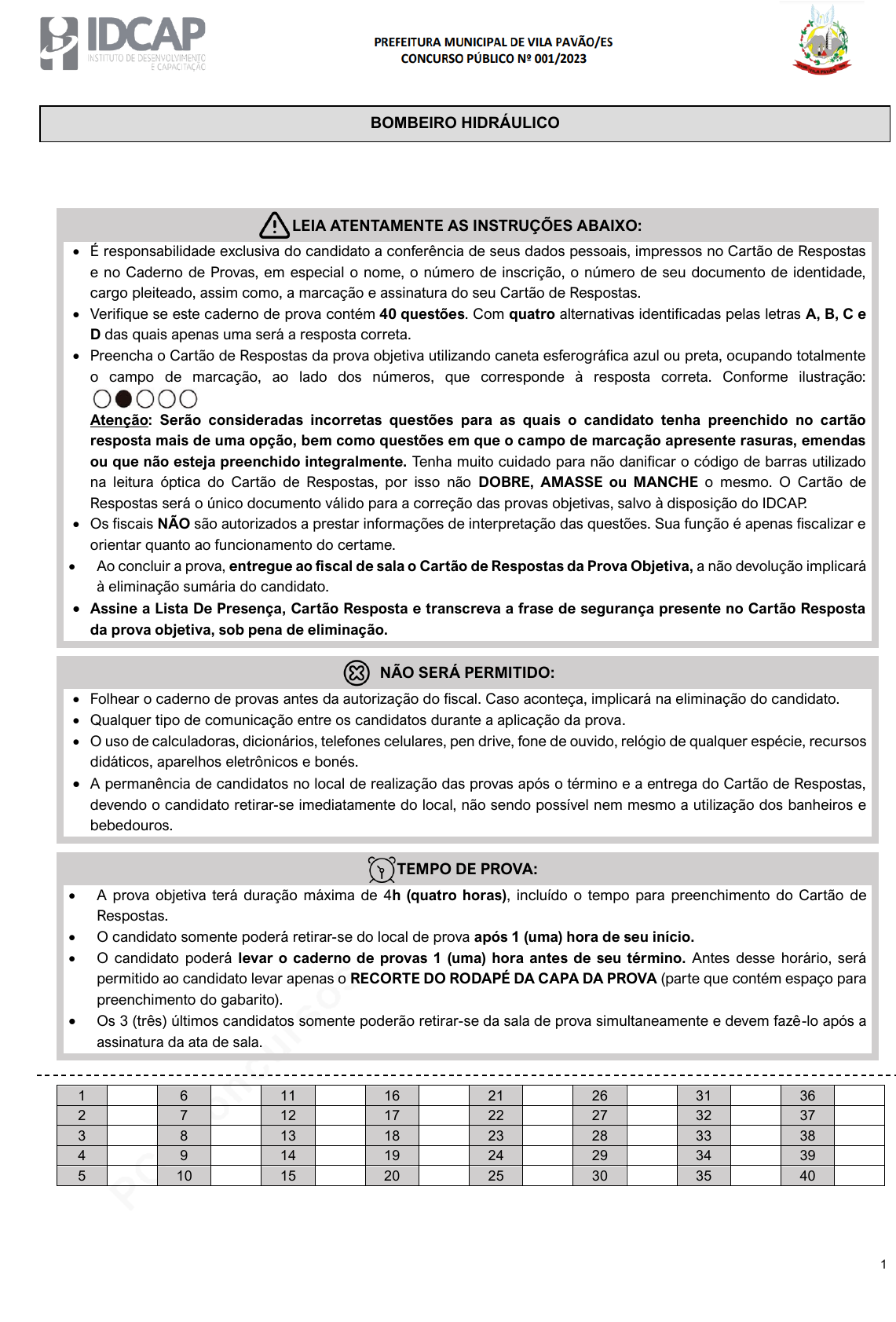pcimarkpci MjgwNDowMTRkOjQ0ODg6MGI5ZjoyNjI5OmQ2N2Q6OGJjODpiNDEy:U2F0LCAyNiBPY3QgMjAyNCAxMToyODo0MyAtMDMwMA== www.pciconcursos.com.br LEIA ATENTAMENTE AS INSTRUÇÕES ABAIXO: • É responsabilidade exclusiva do candidato a conferência de seus dados pessoais, impressos no Cartão de Respostas e no Caderno de Provas, em especial o nome, o número de inscrição, o número de seu documento de identidade, cargo pleiteado, assim como, a marcação e assinatura do seu Cartão de Respostas. • Verifique se este caderno de prova contém 40 questões. Com quatro alternativas identificadas pelas letras A, B, C e D das quais apenas uma será a resposta correta. • Preencha o Cartão de Respostas da prova objetiva utilizando caneta esferográfica azul ou preta, ocupando totalmente o campo de marcação, ao lado dos números, que corresponde à resposta correta. Conforme ilustração: Atenção: Serão consideradas incorretas questões para as quais o candidato tenha preenchido no cartão resposta mais de uma opção, bem como questões em que o campo de marcação apresente rasuras, emendas ou que não esteja preenchido integralmente. Tenha muito cuidado para não danificar o código de barras utilizado na leitura óptica do Cartão de Respostas, por isso não DOBRE, AMASSE ou MANCHE o mesmo. O Cartão de Respostas será o único documento válido para a correção das provas objetivas, salvo à disposição do IDCAP. • Os fiscais NÃO são autorizados a prestar informações de interpretação das questões. Sua função é apenas fiscalizar e orientar quanto ao funcionamento do certame. • Ao concluir a prova, entregue ao fiscal de sala o Cartão de Respostas da Prova Objetiva, a não devolução implicará à eliminação sumária do candidato. • Assine a Lista De Presença, Cartão Resposta e transcreva a frase de segurança presente no Cartão Resposta da prova objetiva, sob pena de eliminação. NÃO SERÁ PERMITIDO: • Folhear o caderno de provas antes da autorização do fiscal. Caso aconteça, implicará na eliminação do candidato. • Qualquer tipo de comunicação entre os candidatos durante a aplicação da prova. • O uso de calculadoras, dicionários, telefones celulares, pen drive, fone de ouvido, relógio de qualquer espécie, recursos didáticos, aparelhos eletrônicos e bonés. • A permanência de candidatos no local de realização das provas após o término e a entrega do Cartão de Respostas, devendo o candidato retirar-se imediatamente do local, não sendo possível nem mesmo a utilização dos banheiros e bebedouros. TEMPO DE PROVA: • A prova objetiva terá duração máxima de 4h (quatro horas), incluído o tempo para preenchimento do Cartão de Respostas. • O candidato somente poderá́ retirar-se do local de prova após 1 (uma) hora de seu início. • O candidato poderá́ levar o caderno de provas 1 (uma) hora antes de seu término. Antes desse horário, será permitido ao candidato levar apenas o RECORTE DO RODAPÉ DA CAPA DA PROVA (parte que contém espaço para preenchimento do gabarito). • Os 3 (três) últimos candidatos somente poderão retirar-se da sala de prova simultaneamente e devem fazê-lo após a assinatura da ata de sala. 1 6 11 16 21 26 31 36 2 7 12 17 22 27 32 37 3 8 13 18 23 28 33 38 4 9 14 19 24 29 34 39 5 10 15 20 25 30 35 40 BOMBEIRO HIDRÁULICO 1 pcimarkpci MjgwNDowMTRkOjQ0ODg6MGI5ZjoyNjI5OmQ2N2Q6OGJjODpiNDEy:U2F0LCAyNiBPY3QgMjAyNCAxMToyODo0MyAtMDMwMA== www.pciconcursos.com.br RASCUNHO 2 pcimarkpci MjgwNDowMTRkOjQ0ODg6MGI5ZjoyNjI5OmQ2N2Q6OGJjODpiNDEy:U2F0LCAyNiBPY3QgMjAyNCAxMToyODo0MyAtMDMwMA== www.pciconcursos.com.br Língua Portuguesa O texto seguinte servirá de base para responder às questões de 1 a 3. Quer ter sucesso? Primeiro, aprenda a falhar, diz professora de Harvard Quando Sara Blakely, fundadora da marca de roupas modeladoras Spanx, era criança, seu pai fazia uma pergunta incomum a ela e ao irmão durante o jantar: "Como você falhou esta semana?", questionava ele. "Ele nos incentivava a falhar e não ter medo disso", diz ela. "Se não tivéssemos algo para contar a ele naquela semana, ele ficaria desapontado." Mas a maioria de nós tenta evitar o fracasso e se envergonha quando as coisas dão errado, afirma Amy Edmondson, professora de liderança na Harvard Business School e autora de "Right Kind of Wrong: The Science of Failing Well" (O tipo certo de errado: a ciência de fracassar bem, em tradução livre). Ela descreveu maneiras de processar nossos erros e aprender com eles. COLOQUE SEU FRACASSO EM CONTEXTO Quando falhamos, nossos cérebros tendem a "catastrofizar" e "acabamos com a resposta fisiológica e emocional do medo real", diz Edmondson. Mas é possível reenquadrar seus fracassos como experiências de vida necessárias. Pergunte a si mesmo: "O que eu pretendia fazer? O que realmente aconteceu?"−essas perguntas não se tratam de focar em como você "estragou tudo", diz ela. É sobre examinar os fatos de forma imparcial. É possível se redimir ou corrigir o curso? Explorar essas questões pode evitar que você entre em pânico ou exagere o tamanho da sua falha, afirma. APRENDA A MUDAR DE DIREÇÃO Em vez de se lamentar depois de um revés, concentre-se no que você pode fazer para seguir em frente ou mudar de direção. Reconheça as maneiras pelas quais você pode conseguir se adaptar, sugere Edmondson. Se, por exemplo, um relacionamento fracassou, você pode experimentar um novo aplicativo de namoro, fazer uma festa de divórcio ou dar um tempo de namorar e se reagrupar. Meça seu sucesso pelo progresso e aprendizado. "Um fracasso é um fim, mas uma mudança de direção olha para frente,em vez de para trás", diz ela. COMPARTILHE DE FRACASSOS Humildade e honestidade são dois ingredientes essenciais da mentalidade de "fracassar bem", pontua Edmondson. E compartilhar nossos fracassos com os outros, indica , minimiza a vergonha, incentiva a sinceridade e oferece às pessoas a chance de aprender com o