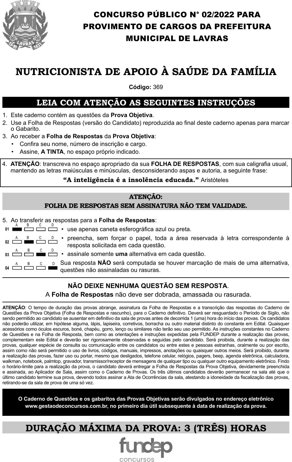 CONCURSO PÚBLICO N° 02/2022 PARA PROVIMENTO DE CARGOS DA PREFEITURA MUNICIPAL DE LAVRAS NUTRICIONISTA DE APOIO À SAÚDE DA FAMÍLIA Código: 369 LEIA COM ATENÇÃO AS SEGUINTES INSTRUÇÕES 1. Este caderno contém as questões da Prova Objetiva. 2. Use a Folha de Respostas (versão do Candidato) reproduzida ao final deste caderno apenas para marcar o Gabarito. 3. Ao receber a Folha de Respostas da Prova Objetiva: • Confira seu nome, número de inscrição e cargo. • Assine, A TINTA, no espaço próprio indicado. 4. ATENÇÃO: transcreva no espaço apropriado da sua FOLHA DE RESPOSTAS, com sua caligrafia usual, mantendo as letras maiúsculas e minúsculas, desconsiderando aspas e autoria, a seguinte frase: “A inteligência é a insolência educada.” Aristóteles ATENÇÃO: FOLHA DE RESPOSTAS SEM ASSINATURA NÃO TEM VALIDADE. 5. Ao transferir as respostas para a Folha de Respostas: • use apenas caneta esferográfica azul ou preta. • preencha, sem forçar o papel, toda a área reservada à letra correspondente à resposta solicitada em cada questão. • assinale somente uma alternativa em cada questão. Sua resposta NÃO será computada se houver marcação de mais de uma alternativa, questões não assinaladas ou rasuras. NÃO DEIXE NENHUMA QUESTÃO SEM RESPOSTA. A Folha de Respostas não deve ser dobrada, amassada ou rasurada. ATENÇÃO: O tempo de duração das provas abrange, assinatura da Folha de Respostas e a transcrição das respostas do Caderno de Questões da Prova Objetiva (Folha de Respostas e rascunho), para o Caderno definitivo. Deverá ser resguardado o Período de Sigilo, não sendo permitido ao candidato se ausentar em definitivo da sala de provas antes de decorrida 1 (uma) hora do início das provas. Os candidatos não poderão utilizar, em hipótese alguma, lápis, lapiseira, corretivos, borracha ou outro material distinto do constante em Edital. Quaisquer acessórios como óculos escuros, boné, chapéu, gorro, lenço ou similares não terão seu uso permitido. As instruções constantes no Caderno de Questões e na Folha de Resposta, bem como as orientações e instruções expedidas pela FUNDEP durante a realização das provas, complementam este Edital e deverão ser rigorosamente observadas e seguidas pelo candidato. Será proibida, durante a realização das provas, qualquer espécie de consulta ou comunicação entre os candidatos ou entre estes e pessoas estranhas, oralmente ou por escrito, assim como não será permitido o uso de livros, códigos, manuais, impressos, anotações ou quaisquer outros meios. Será proibido, durante a realização das provas, fazer uso ou portar, mesmo que desligados, telefone celular, relógios, pagers, beep, agenda eletrônica, calculadora, walkman, notebook, palmtop, gravador, transmissor/receptor de mensagens de qualquer tipo ou qualquer outro equipamento eletrônico. Findo o horário-limite para a realização da prova, o candidato deverá entregar a Folha de Respostas da Prova Objetiva, devidamente preenchida e assinada, ao Aplicador de Sala, assim como o Caderno de Provas. Os três últimos candidatos deverão permanecer na sala até que o último candidato termine sua prova, devendo todos assinar a Ata de Ocorrências da sala, atestando a idoneidade da fiscalização das provas, retirando-se da sala de prova de uma só vez. O Caderno de Questões e os gabaritos das Provas Objetivas serão divulgados no endereço eletrônico www.gestaodeconcursos.com.br, no primeiro dia útil subsequente à data de realização da prova.O Caderno de Questões e os gabaritos das Provas Objetivas serão divulgados no endereço eletrônico www.gestaodeconcursos.com.br, no primeiro dia útil subsequente à data de realização da prova. DURAÇÃO MÁXIMA DA PROVA: 3 (TRÊS) HORAS
