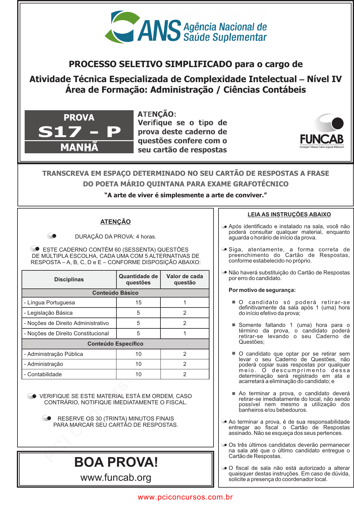 pcimarkpci MDAwMDowMDAwOjAwMDA6MDAwMDowMDAwOmZmZmY6OTU0ZTpiYjQ2:U3VuLCAyNyBPY3QgMjAyNCAwMjo0OTowNSAtMDMwMA== www.pciconcursos.com.br PROVA S17 - P MANHÃ Verifique se o tipo de prova deste caderno de questões confere com o seu cartão de respostas TRANSCREVA EM ESPAÇO DETERMINADO NO SEU CARTÃO DE RESPOSTAS A FRASE DO POETA MÁRIO QUINTANA PARA EXAME GRAFOTÉCNICO “A arte de viver é simplesmente a arte de conviver.” BOA PROVA! www.funcab.org LEIA AS INSTRUÇÕES ABAIXO Após identificado e instalado na sala, você não poderá consultar qualquer material, enquanto aguarda o horário de início da prova. Siga, atentamente, a forma correta de preenchimento do Cartão de Respostas, conforme estabelecido no próprio. Não haverá substituição do Cartão de Respostas por erro do candidato. O cand idato só poderá re t i ra r -se definitivamente da sala após 1 (uma) hora do início efetivo da prova; Somente faltando 1 (uma) hora para o término da prova, o candidato poderá retirar-se levando o seu Caderno de Questões; O candidato que optar por se retirar sem levar o seu Caderno de Questões, não poderá copiar suas respostas por qualquer m e i o . O d e s c u m p r i m e n t o d e s s a determinação será registrado em ata e acarretará a eliminação do candidato; e Ao terminar a prova, o candidato deverá retirar-se imediatamente do local, não sendo possível nem mesmo a utilização dos banheiros e/ou bebedouros. Ao terminar a prova, é de sua responsabilidade entregar ao fiscal o Cartão de Respostas assinado. Não se esqueça dos seus pertences. Os três últimos candidatos deverão permanecer na sala até que o último candidato entregue o Cartão de Respostas. O fiscal de sala não está autorizado a alterar quaisquer destas instruções. Em caso de dúvida, solicite a presença do coordenador local. Por motivo de segurança: VERIFIQUE SE ESTE MATERIAL ESTÁ EM ORDEM, CASO CONTRÁRIO, NOTIFIQUE IMEDIATAMENTE O FISCAL. RESERVE OS 30 (TRINTA) MINUTOS FINAIS PARA MARCAR SEU CARTÃO DE RESPOSTAS. ATENÇÃO: ATENÇÃO DURAÇÃO DA PROVA: 4 horas. ESTE CADERNO CONTÉM 60 (SESSENTA) QUESTÕES DE MÚLTIPLA ESCOLHA, CADA UMA COM 5 ALTERNATIVAS DE RESPOSTA – A, B, C, D e E – CONFORME DISPOSIÇÃO ABAIXO: Disciplinas Quantidade de questões Valor de cada questão Conteúdo Básico - Língua Portuguesa 15 1 - Legislação Básica 5 2 - Noções de Direito Administrativo 5 2 - Noções de Direito Constitucional 5 1 Conteúdo Específico - Administração Pública 10 2 - Administração 10 2 - Contabilidade 10 2 Atividade Técnica Especializada de Complexidade Intelectual Nível IV Área de Formação: Administração / Ciências Contábeis – PROCESSO SELETIVO SIMPLIFICADO para o cargo de www.pciconcursos.com.br pcimarkpci MDAwMDowMDAwOjAwMDA6MDAwMDowMDAwOmZmZmY6OTU0ZTpiYjQ2:U3VuLCAyNyBPY3QgMjAyNCAwMjo0OTowNSAtMDMwMA== www.pciconcursos.com.br 02 LÍNGUA PORTUGUESA FUNCAB - Fundação Professor Carlos Augusto Bittencourt Leia o texto abaixo e responda às questões propostas. Temos, sem dúvida, sérios problemas de discriminação e exclusão na sociedade brasileira, que se refletem também nas universidades. Mas frequentemente parece que eles são abordados de forma desfocada. A composição racial da sociedade brasileira tem forte presença de negros, pardos e minorias. Diz-se que esse perfil não se repete na universidade. Mas porque razão a composição geral da sociedade deve se repetir em seus contextos e recortes específicos? Ela se repete em times de futebol ou na seleção brasileira? Se acreditarmos que o perfil étnico ou econômico do conjunto da população seja, ou deva ser, uma “invariante social”, repetindo-se em qualquer recorte ou subgrupo, a consequência óbvia disso é a generalização da prática de cotas. Além de cotas no vestibular, em breve teremos propostas de cotas de formatura, para compensar injustiças e discriminações ocorridas ao longo do curso. Em seguida, cotas para times de futebol, cotas para funcionários das empresas, cotas para sócios de clubes, cotas para academias de ginástica, cotas para fieis de cada religião e culto e por aí vai. A grande injustiça é ver a quantidade de pessoas, especialmente os jovens inteligentes e esforçados, sendo impedidas de se desenvolver. Não é dada a elas a oportunidade de aprender a crescer, por causa de uma educação pública básica e média medíocres. Esse é o problema real. O contrário do racismo e da discriminação social não é uma “discriminação positiva”, mas sim a ausência dessas classificações. Qualquer solução que envolva critérios de raça ou pobreza não contribui para eliminar a discriminação. Pelo contrário, reafirma, reforça e pereniza esses conceitos básicos dos mecanismos de exclusão. N e s s e c e n á r i o d e s e q u e s t r o d e oportunidades, há um grupo de jovens mais velhos que já foi prejudicado pelas péssimas escolas públicas. E há outro grupo, bem maior, das crianças que ainda enfrentarão o problema. Para as pessoas já prejudicadas, as cotas são um mecanismo compensatório, que pode reduzir, mas não eliminar, o prejuízo. Se houver uma proposta cujo cerne seja a melhoria efetiva do atual ensino público de primeiro e segundo grau, com parâmetros objetivos e seguindo modelos que comprovadamente já deram excelentes resultados em várias partes do mundo, e que parte dessa proposta seja um sistema de cotas, emergencial e provisório (com prazo limitado), visando apenas aquela população que já foi prejudicada, essa proposta merece não apenas a nossa aprovação, mas também o nosso aplauso. Já uma proposta que contemple apenas a questão das cotas de forma isolada ou é ingênua ou é demagógica.Anestesia as consciências, acomoda as queixas, reduz as pressões – é a solução mais fácil e barata para os governantes. Mas mantém a condenação de milhões de crianças a precisar de cotas no futuro, sempre em ciclos sem 