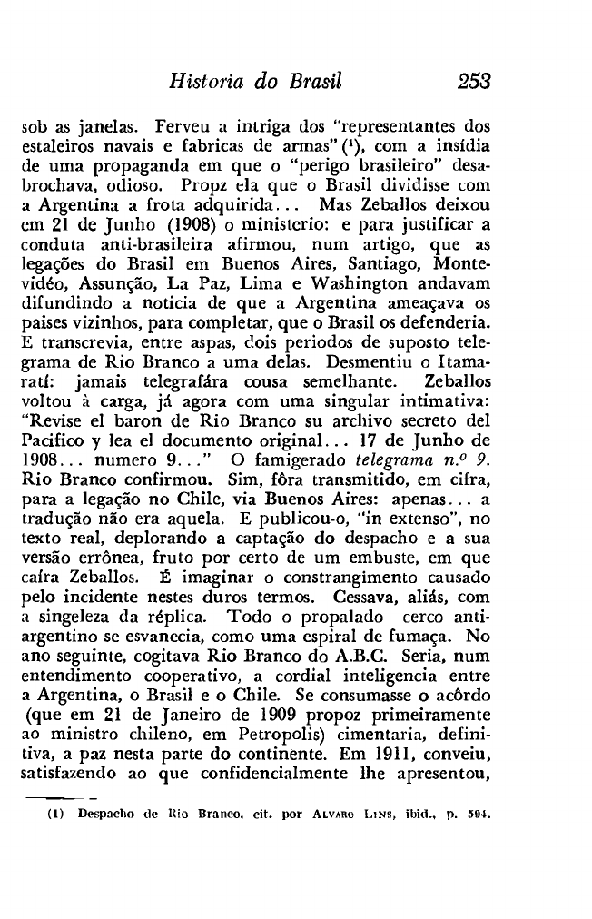 Historia do Brasil 253 sob as janelas. Ferveu a intriga dos "representantes dos estaleiros navais e fabricas de armas" (1), com a insidia de uma propaganda em que o "perigo brasileiro" desa brochava, odioso. Propz ela que o Brasil dividisse com a Argentina a frota adquirida. . . Mas Zeballos deixou cm 21 de Junho (1908) o ministcrio: e para justificar a conduta anti-brasileira afirmou, num artigo, que as legações do Brasil em Buenos Aires, Santiago, Monte vidéo, Assunção, La Paz, Lima e Washington andavam difundindo a noticia de que a Argentina ameaçava os países vizinhos, para completar, que o Brasil os defenderia. E transcrevia, entre aspas, dois periodos de suposto tele grama de Rio Branco a uma delas. Desmentiu o Itama ratí: jamais telegrafára cousa semelhante. Zeballos voltou à carga, já agora com uma singular intimativa: "Revise el baron de Rio Branco su archivo secreto dei Pacifico y lea el documento original. . . 17 de Junho de 1908 .. . numero 9 . . . " O famigerado telegrama n.0 9. Rio Branco confirmou. Sim, fôra transmitido, em cifra, para a legação no Chile, via Buenos Aires: apenas. . . a tradução não era aquela. E publicou-o, "in extenso", no texto real, deplorando a captação do despacho e a sua versão errônea, fruto por certo de um embuste, em que caíra Zeballos. É imaginar o constrangimento causado pelo incidente nestes duros termos. Cessava, aliás, com a singeleza da réplica. Todo o propalado cerco anti argentino se esvanecia, como uma espiral de fumaça. No ano seguinte, cogitava Rio Branco do A.B.C. Seria, num entendimento cooperativo, a cordial inteligencia entre a Argentina, o Brasil e o Chile. Se consumasse o acôrdo (que em 21 de Janeiro de 1909 propoz primeiramente ao ministro chileno, em Petropolis) cimentaria, defini tiva, a paz nesta parte do continente. Em 19ll, conveio, satisfazendo ao que confidencialmente lhe apresentou, (1) Despacho de Hio Branco, cit. por ALVARo L1Ns, ibid ., p. 504. 254 Pedro Calmon em nome de Saenz Pefia, Ramon J. Cárcano, em desistir do terceiro "dreadnought". Faria o mesmo a Argentina. Com estas intenções conciliatórias podia encerrar a grande carreira pública, angustiada, no final, pelas decep ções letais da política. Não resistiu o barão às emoções de um período atroz da vida nacional - ao começar, sob o signo da desordem armada, o ano infeliz de 1912. Pa trioticamente humilhado pelo bombardeio da Bahia, demitir-se-ia, se o governo não repuzesse a autoridade criminosamente deposta. O marechal atendeu. - Se o sr. saír, eu tambem renuncio - disse-lhe, aterrado pela perspectiva da segunda catastrofe, qual a retirada do homem glorioso (1). Mas lhe fraquejou o organismo. Morreu no seu gabinete do Itamaratí, onde dormia, junto da vasta mesa de trabalho, a 10 de Fevereiro. (1) ALBERTO DE FARIA, conf. na Acad. Bras., 80 de Agosto de 1930. XXV A CAMPANHA CIVILISTA Historia repetida. Quem fazia politica, era ele. . . Com esta frase auto ritária marcou Afonso Pena a linha pessoal do sistêma, extremada- como acontecera com Rodrigues Alves - na escôlha do sucessor. Não seria problema, se vivesse João Pinheiro. O presidente mineiro sobrepujára o panorama dos partidos com a sua individualidade iman tada de ação e idealismo: poucos homens na vida repu blicana se impuzeram tão depressa ao entusiasmo dos correligionários e à confiança do país. A sua fisionomia lembrava a de Castilhos; o positivismo progressista e a energia de comando faziam dele literalmente um chefe; mas vestia a firmeza dessas qualidades com as maneiras suaves de sua gente, de quem tinha a astúcia, a obstina ção e a modéstia. Ele proprio, numa imagem rústica, traçou o paralelo de gaúchos e mineiros, comparando a impaciencia do cavalo e a perseverança do burro ... (1) Sem afoiteza, sem ênfase, sem provocação, seguia pachor rentamente o seu rumo. Do palacio da Liberdade ao do Catete (2) parecia curto atalho, na crista calva das "alterosas" montanhas natais. . . Vitima de molestia que não perdôa, morreu a 25 de Outubro de 1908. Deixou desorientada a política, até aí em torno dele - contra Pinheiro Machado. Carlos Peixoto e o seu grupo, mo mentaneamente ao desabrigo, socorreram-se de David (1) PEDRO RACHE, Homens de Minas, ps., 86-7, (2) PAULO TAMM, João Pinheiro, p. 198, Belo Horizonte 1947, 256 Pedro Calmon Campista. O presidente Pena por ele se declarou em Dezembro. O ministro da fazenda seria o candidato. Cometia a mesma imprudencia do antecessor, com Bernar dino de Campos. De mais não precisava o adversario para o abater, dissolvendo, no fragôr dessa liquidação, o "jardim da infancia". Romperia Ruy Barbosa por conta propria o combate: negava ao presidente o direito de apresentar sucessor. Lembrou Rio Branco. Hàbilmente, Pinheiro parecia concordar com Campista. De fato, tudo faria para arre batar a Carlos Peixoto a chefía petulante da politica nacional: e o venceu com a candidatura do ministro da guerra. Antes o marechal Hermes! O fulgôr da espada. No ambiente pairava, significativamente, a mística militarista. Bastára um ano, entre 1907 e 1908, para se modificar na opinião geral a crença da dôce paz (1). As palavras de Ruy na Haia pertenciam a um período findo. O Brasil devia armar-se, como as demais potencias, em franco desafio estatístico; e o marechal, operoso e edu cativo, personificava o exercito. Abraçava-se a Rio Branco e Alexandrino nesse pensamento de ressurreição do po derío militar. Depois do episodio da Panther, o governo alemão queria reconquistar a simpatía brasileira: convidou-o para assistir, ao lado do Kaiser, às grandes manobras. Rio Branco deu à viagem a ressonancia espe rada; e a sua volta - o reformador do exercito do Brasil homenageado pelo primeiro exercito do mundo! - foi festejada com estrondo. Ali estava, de plumas e bordados, (1) Narra MEDEIROS E ALBUQUERQUE aspectos curiosos da excitação que em 1008, começava a Invadir o exercito, levando a lguns grupos a a