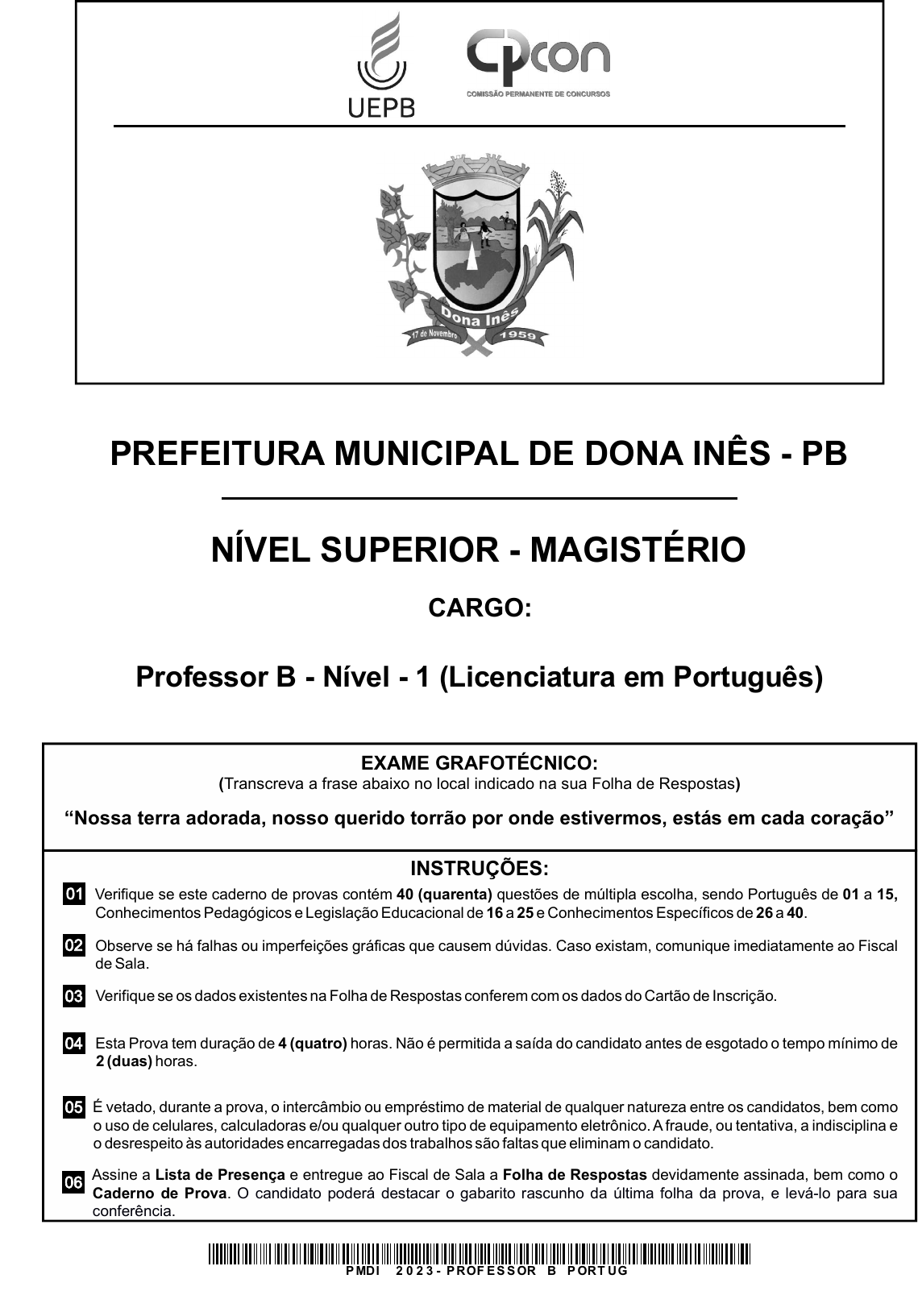 pcimarkpci MDAwMDowMDAwOjAwMDA6MDAwMDowMDAwOmZmZmY6MmRlOToyN2U1:U3VuLCAyNyBPY3QgMjAyNCAwNDoxMDoxNyAtMDMwMA== www.pciconcursos.com.br P MDI 2 0 2 3 - PROF ES S OR B P ORT UG Professor B - Nível - 1 (Licenciatura em Português) NÍVEL SUPERIOR - MAGISTÉRIO CARGO: EXAME GRAFOTÉCNICO: ( )Transcreva a frase abaixo no local indicado na sua Folha de Respostas INSTRUÇÕES: Observe se há falhas ou imperfeições gráficas que causem dúvidas. Caso existam, comunique imediatamente ao Fiscal de Sala. Verifique se os dados existentes na Folha de Respostas conferem com os dados do Cartão de Inscrição. Esta Prova tem duração de horas. Não é permitida a saída do candidato antes de esgotado o tempo mínimo de 4 (quatro) 2 (duas) horas. É vetado, durante a prova, o intercâmbio ou empréstimo de material de qualquer natureza entre os candidatos, bem como o uso de celulares, calculadoras e/ou qualquer outro tipo de equipamento eletrônico. A fraude, ou tentativa, a indisciplina e o desrespeito às autoridades encarregadas dos trabalhos são faltas que eliminam o candidato. Lista de Presença Folha de RespostasAssine a e entregue ao Fiscal de Sala a devidamente assinada, bem como o Caderno de Prova. O candidato poderá destacar o gabarito rascunho da última folha da prova, e levá-lo para sua conferência. Verifique se este caderno de provas contém questões de múltipla escolha, sendo Português de a 40 (quarenta) 01 15, Conhecimentos Pedagógicos e Legislação Educacional de a e Conhecimentos Específicos de a .16 25 26 40 “Nossa terra adorada, nosso querido torrão por onde estivermos, estás em cada coração” PREFEITURA MUNICIPAL DE DONA INÊS - PB pcimarkpci MDAwMDowMDAwOjAwMDA6MDAwMDowMDAwOmZmZmY6MmRlOToyN2U1:U3VuLCAyNyBPY3QgMjAyNCAwNDoxMDoxNyAtMDMwMA== www.pciconcursos.com.br pcimarkpci MDAwMDowMDAwOjAwMDA6MDAwMDowMDAwOmZmZmY6MmRlOToyN2U1:U3VuLCAyNyBPY3QgMjAyNCAwNDoxMDoxNyAtMDMwMA== www.pciconcursos.com.br PÁGINA 03 PORTUGUÊS O artigo a seguir serve de base para as questões de 01 a 04: TEXTO I “Deus está triste”: bebês gerados por IA viram febre e piada nas redes sociais Simulações são feitas pelo aplicativo Remini; “Deus está triste com tanto bebê de IA” e “cafona demais”, criticam perfis (sic.) ( )Nayani Real SÃO PAULO (SP) Nesta semana, imagens de crianças geradas por Inteligência Artificial dominaram as redes sociais de famosos e anônimos. Personalidades como Gil do Vigor, Pequena Lô, Viih Tube e Virgínia compartilharam versões de crianças similares a elas, geradas pelo aplicativo Remini. Com características similares às suas, os bebês aparecem em seus colos, em imagens que simulam retratos de família. "Deus está triste com tanto bebê de IA", diz um meme sobre a onda de publicações. Outros comparam imagens geradas à personagem Renesmée, filha dos protagonistas Edward Cullen e Bella Swan no filme "Amanhecer - parte 2", da saga Crepúsculo. Lançado em 2012, o longa foi alvo de críticas pela baixa qualidade dos efeitos especiais. Perfis também apontam falhas na geração de imagens, como a multiplicação de braços dos bebês. Alguns dizem que a tendência é "cafona". Além das críticas à qualidade das imagens geradas, o compartilhamento de dados também voltou ao debate no Twitter. Perfis alertam para perigos da cessão de dados ao aplicativo de IA, enquanto outros dizem não aguentar mais esse discurso. Na plataforma, um perfil cita o caso da utilização da imagem gerada por IA da cantora Elis Regina, morta em 1982, pela Volkswagen. No último dia 4 de julho, uma campanha comemorativa de 70 anos da marca no Brasil reuniu Elis e sua filha, a cantora Maria Rita, e dividiu opiniões nas redes. Entre publicações descontraídas e sérias, alguns perfis se mostram avessos à moda. "Nem filho virtual eu quero", diz um usuário. Outro compartilha imagem gerada por Inteligência Artificial que, ao invés de uma criança, mostra um gato. Disponível em: . Acesso em: 13 jul. 2023. 1ª QUESTÃO A respeito do Texto I, é CORRETO afirmar: a) O aplicativo Remini sempre obtém sucesso na geração das fotos que simulam fotos de família. b) De acordo com o texto, a cantora Maria Rita mostrou-se favorável à simulação de IA de sua mãe. c) A onda de publicações de bebês virtuais feitos através do aplicativo Remini não foi forte o bastante para dividir opiniões na internet. d) Os usuários do Twitter não demonstram um consenso sobre os bebês criados por inteligência artificial. e) De acordo com alguns perfis do Twitter cujos usuários se pronunciaram acerca da tendência discutida no texto, é completamente seguro ceder seus dados ao aplicativo Remini. 2ª QUESTÃO Com relação ao período do texto “Na plataforma, um perfil cita o caso da utilização da imagem gerada por IA da cantora Elis Regina, morta em 1982, pela Volkswagen”, pode-se afirmar CORRETAMENTE que a) . no período em questão, em “um perfil”, a palavra “um” atua invariavelmente como numeral b) o período em questão apresenta desvios com relação à pontuação. c) a palavra “plataforma” faz menção ao aplicativo Remini. d) Volkswagen cafonaas palavras e pertencem à mesma classe de palavras. e) a vírgula localizada após “1982” inviabiliza a criação de uma ambiguidade que prejudicaria o entendimento do texto. 3ª QUESTÃO Em relação ao Texto I, considere as assertivas a seguir como (V) verdadeiras ou (F) falsas ( ) A palavra “geração” é formada por derivação sufixal. ( ) suas seusNo período “Com características similares às , os bebês aparecem em colos, em imagens que simulam retratos de família”, os pronomes em destaque fazem uma retomada catafórica de um mesmo referente. ( ) Sigla é o processo de formação da palavra IA. ( ) A palavra “cafona” é um neologismo. ( ) avessosNo período “alguns perfis se mostram à moda”, o termo em destaque estabelece uma relação de sinonímia com o termo “contrários”.