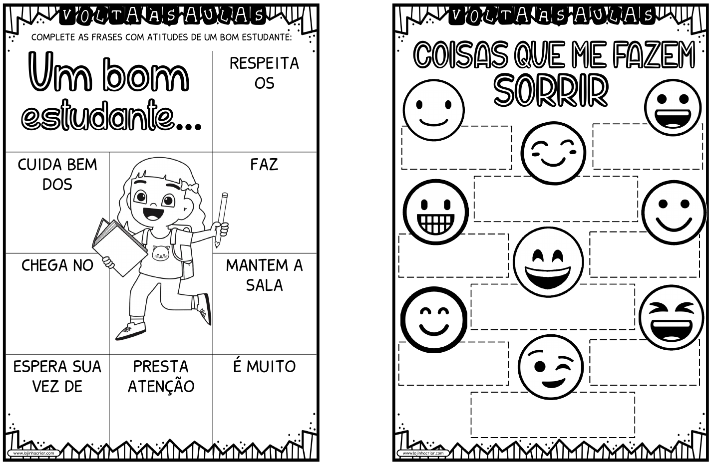 RESPEITA OS CUIDA BEM DOS FAZ CHEGA NO MANTEM A SALA ESPERA SUA VEZ DE PRESTA ATENÇÃO É MUITO estudante... Um bom COMPLETE AS FRASES COM ATITUDES DE UM BOM ESTUDANTE: VOLTAÀSAULAS www.lojinhacriar.com SORRIR COISAS QUE ME FAZEM VOLTAÀSAULAS www.lojinhacriar.com FAÇAUMABOAESCOLHA PINTE APENAS AS BOAS ATITUDES VOLTAÀSAULAS RESPEITAR OS PROFESSORES GRITAR PARA CONSEGUIR ALGO AJUDAR OS COLEGAS FALAR PALAVRÕES FAZER COM CAPRICHO AS ATIVIDADES AGREDIR O COLEGA ESPERAR A VEZ DE FALAR PRESTAR ATENÇÃO MANTER A SALA LIMPA BRINCAR NA HORA DA ATIVIDADE ORGANIZAR A FILA COM CALMA FAZER BULLYING #%&$ www.lojinhacriar.com MOCHILA: ORGANIZE AS LETRAS E DESCUBRA OS OBJETOS QUE GABRIEL LEVA NA VOLTAÀSAULAS A C O L A P I L A CN ES T A R V O L R B R SEO T AT O E AR G É I A ACH U S U R OJ O www.lojinhacriar.com ESCOLA: PINTE AS PEÇAS DO QUEBRA-CABEÇA QUE CONTÉM AS COISAS QUE VOCÊ MAIS GOSTA NA VOLTAÀSAULAS RECREIO EDUCAÇÃO FÍSICA PROFESSORES ARTE AULA DE PORTUGUÊS AULA DE MATEMÁTICA APRENDER PROVA DEVER DE CASA HORA DA HISTÓRIA PINTAR ATIVIDADES DE RECORTARSENTAR EM DUPLA DIAS DE FESTA FÉRIAS www.lojinhacriar.com EU SOU... FAÇA O SEU DESENHO E ESCREVA ALGUMAS DAS CARACTERÍSTICAS E QUALIDADES: VOLTAÀSAULAS www.lojinhacriar.com PREFIRO:O QUE EU VOLTAÀSAULAS www.lojinhacriar.com PRIMEIRO DIA: USE AS CARINHAS PARA MOSTRAR O QUE VOCÊ ACHOU DO SEU VOLTAÀSAULAS 10:00 MINHA SALA PROFESSOR(A) COLEGAS ESCOLA CHEGADA RECREIO ATIVIDADES MEUS MATERIAIS SAÍDA www.lojinhacriar.com MEUSNUMEROS QUE TAL, CONHECER UM POUCO MAIS SOBRE VOCÊ ATRAVÉS DOS NÚMEROS DA SUA VIDA? IDADE DATA DE NASCIMENTO VOLTAÀSAULAS NA MINHA CASA MORAM PESSOAS MEU SAPATO É MINHA TURMA É ANO NÚMERO DA MINHA CASA MEU PESO MINHA ALTURA www.lojinhacriar.com MEUTOP ESCREVA AS SUAS COISAS FAVORITAS VOLTAÀSAULAS www.lojinhacriar.com FAÇA UMA LISTA DO QUE TEM NA ESCOLA: VOLTAÀSAULAS T EM NA ESCOLA . www.lojinhacriar.com USE A LEGENDA PARA PREENCHER AS INFORMAÇÕES SOBRE A SUA PRIMEIRA SEMANA DE AULA. VOLTAÀSAULAS CHECKLIST DA1ºSEMANADEAULA VERMELHO NÃO VERDE SIMAMARELO MAIS OU MENOS 1. GOSTEI DA MINHA SALA: 2. JÁ SEI O NOME DOS MEUS PROFESSORES: 3. JÁ SEI O NOME DE TODOS OS COLEGAS: 4. FIZ TODAS AS ATIVIDADES: 5. PRESTEI ATENÇÃO NA AULA: 6. BRINQUEI NO RECREIO: 7. GOSTEI DA MINHA PROFESSORA: 8. JÁ TENHO TODOS MEUS MATERIAIS: 9. CHEGUEI NO HORÁRIO CERTO: 10. GOSTEI DA MINHA PRIMEIRA SEMANA: www.lojinhacriar.com MEU NOME VOLTAÀSAULAS ESCREVA SEU NOME NOS QUADRADINHOS: MEU NOME COMEÇA COM A LETRA: MEU NOME TEM LETRAS MEU NOME COMEÇA COM: VOGAL CONSOANTE COLEGAS QUE COMEÇAM COM A MESMA LETRA QUE EU: UM COLEGA QUE TEM MAIS LETRAS QUE EU: UM COLEGA QUE TEM MENOS LETRAS QUE EU: UM COLEGA QUE TEM A MESMA QUANTIDADE LETRAS QUE EU: www.lojinhacriar.com VOLTAÀSAULAS DENT RO DO MEU C RAÇÃO ____________________________ ____________________________ __________________________ _____________________ ________________ ____________________________ ____________________________ __________________________ _____________________ ________________ ____________________________ ____________________________ __________________________ _____________________ ________________ ____________________________ ____________________________ __________________________ _____________________ ________________ ____________________________ ____________________________ __________________________ _____________________ ________________ ____________________________ ____________________________ __________________________ _____________________ ________________ www.lojinhacriar.com VOLTAÀSAULAS MINHA ESCOLA COMPLETE O ACRÓSTICO COM CARACTERÍSTICAS DA SUA ESCOLA: E S C O L A www.lojinhacriar.com