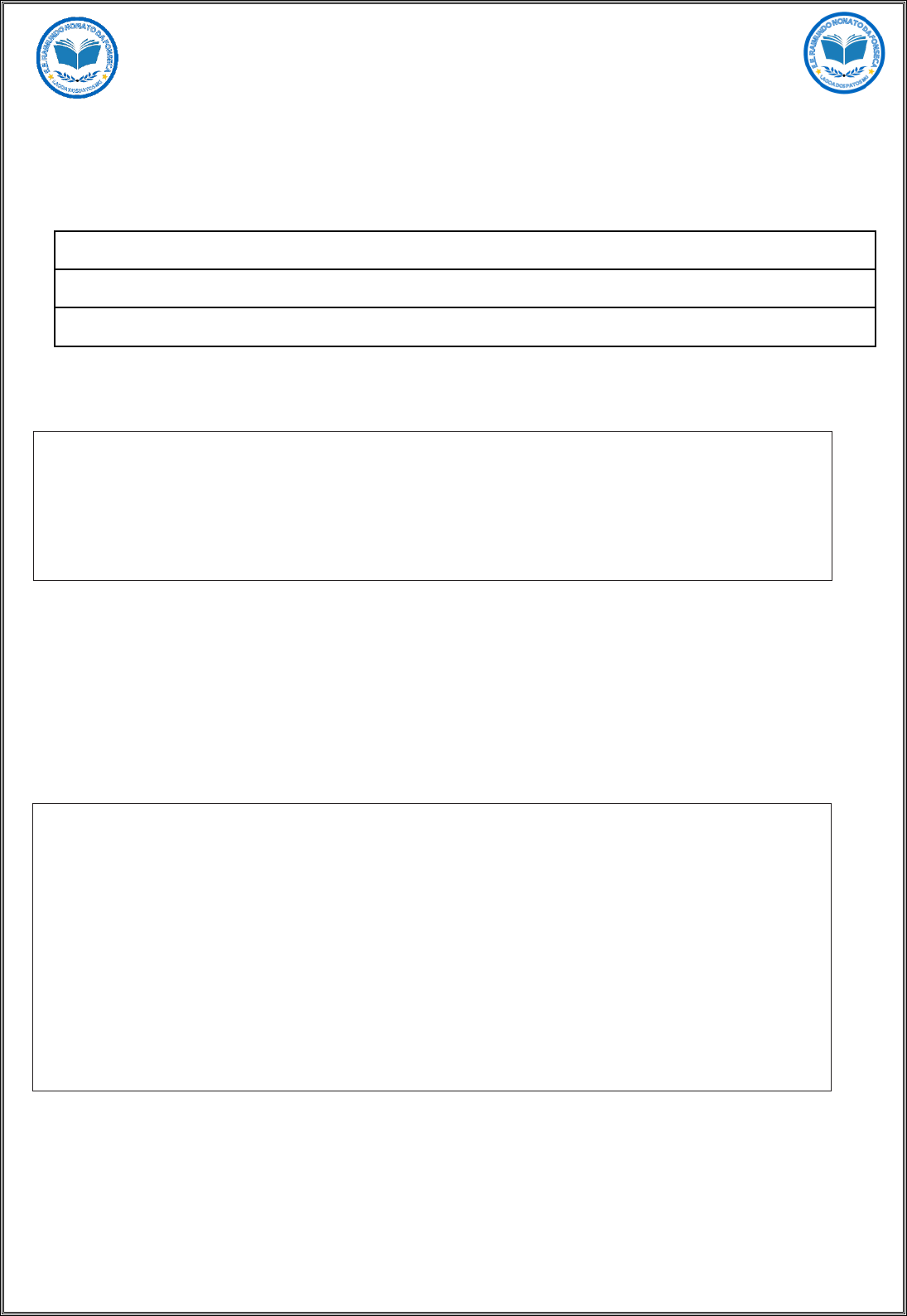 ESCOLA ESTADUAL RAIMUNDO NONATO DA FONSECA ENSINO FUNDAMENTAL E MÉDIO DECRETO DE CRIAÇÃO 7822 DE 21/8/1964, DECRETO 20382 DE 9/1/1980, LEI 8934 DE 27/9/1985 E PORTARIA 281 DE 18/2/1997 LAGOA DOS PATOS - MG. Avaliação Bimestral de Língua Portuguesa – 1º Bimestre Leia o texto abaixo. 01) O humor desse texto está no fato de: A) a mosca conversar com a outra mosca. B) a mosca passear coma colega. C) a mosca perceber a agitação da outra. D) a mosca ser vítima de outra mosca. Leia o texto abaixo. CANELA, no Rio Grande do Sul, ganhará roda-gigante de 60 metros de altura. UOL.27.jan.2022.Disponível em: https://bit.ly/3tvGUFD. Acesso em: 22fev.2022. Adaptado para fins didáticos. Fragmento. (P051878I7_SUP) 02) O assunto desse texto é: A) a inauguração de uma roda-gigante. B) as atrações turísticas das grandes cidades. C) O avanço da tecnologia no mundo atual. D) Os espetáculos de luz de uma roda-gigante. PROFESSOR (A): Verimar Medeiros Ramos TURMA: 8º ano Reg 1 DATA: / / VALOR: 10 PONTOS NOTA: ALUNO(a): Canela, no Rio Grande do Sul, ganhará roda-gigante de 60 metros de altura Mais uma cidade brasileira ganhará uma roda-gigante de observação como atração turística: depois de Rio, São Paulo, Foz do Iguaçu, entre outras, agora será a vez de Canela (RS) receber o brinquedo. “A roda-gigante terá um design único e elegante e contará com 32 cabines panorâmicas climatizadas de alta tecnologia e conforto.Todas serão tematizadas e o passeio poderá ser feito tanto de dia quanto à noite, pois ela terá uma iluminação [...] capaz de reproduzir espetáculos de luz”, revelou [...] Mauro Fantin, [...] responsável pela instalação [...]. Com todas as cabines adaptadas [...], a roda-gigante de Canela deverá levar 25 minutos para completar o seu trajeto. A expectativa é que a atração seja aberta ao público ainda em 2022 [...]. Mosca no olho Duas moscas estão passeando em uma moto. Ao ver a agitação da colega, a outra mosca pergunta: – O que aconteceu? – Nada, mas parece que uma mosca entrou no meu olho. https://bit.ly/3tvGUFD.%20Acesso%20em:%2022fev.2022 Leia o texto abaixo. ZIRALDO.[Semtítulo].In:BlogdoXandro.25jul.2018.Disponívelem:https://meulink.fit/OAtFRKtZVVtXeTO .Acessoem:1fev. 2022.(P060848I7_SUP) 03) Esse texto é: A) um cartaz. B) um manual. C) uma notícia. D) uma tirinha. Leia o texto abaixo. SOARES,Vanderlei.[Semtítulo].In:Lápis&ArtesEstúdio.27fev.2010.Disponívelem:https://meulink.fit/PCFIGROHrJHKgWR.Acesso em: 19jul.2023.(P018247_SUP) 04) Nesse texto, no trecho “Essa chuva não vai parar tão cedo!”, a expressão em destaque foi utilizada para: A) demonstrar que o personagem estava com medo da chuva. B) expor que o personagem estava atrasado para um compromisso. C) indicar que a chuva demoraria para terminar. D) mostrar que estava chovendo pela manhã. 05) Esse texto é engraçado porque Maluquinho: A) conversou com sua mãe ao chegar em casa após a chuva. B) escapou dos pingos de chuva para se molhar no banho. C) falou com seu amigo sobre os pingos de chuva. D) ficou escondido próximo a um vendedor de sorvete. 06) Localize e retire do trecho abaixo, palavras que pertençam as seguintes classes gramaticais: “No caminho da vida, nem tudo será fácil, seja humilde pois até o sol com toda a sua grandeza se põe para que alua possa brilhar”. (A) Substantivos: ________________________ _______________________ ___________________ (B) Pronomes: ________________________ _______________________ _____________________ (C) Verbos: ________________________ _______________________ _____________________ ___________________________ (D) Adjetivo: _____________________________ ______________________________ . 08) Escreva o título do livro literário que você leu e qual a parte que mais gostou?