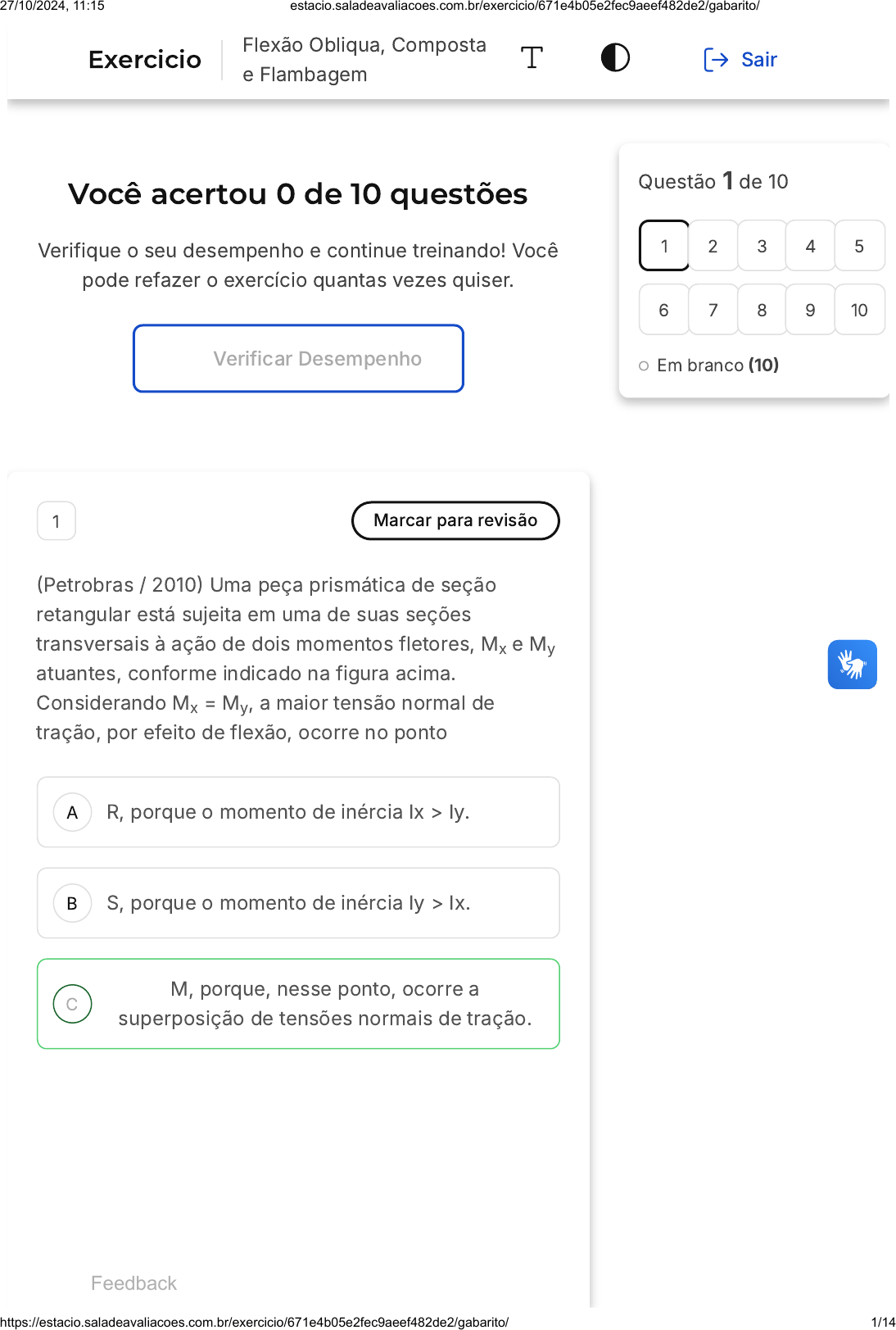 Você acertou 0 de 10 questões Verifique o seu desempenho e continue treinando! Você pode refazer o exercício quantas vezes quiser. Verificar Desempenho A B C 1 Marcar para revisão �Petrobras / 2010� Uma peça prismática de seção retangular está sujeita em uma de suas seções transversais à ação de dois momentos fletores, M e M atuantes, conforme indicado na figura acima. Considerando M = M , a maior tensão normal de tração, por efeito de flexão, ocorre no ponto x y x y R, porque o momento de inércia Ix > Iy. S, porque o momento de inércia Iy > Ix. M, porque, nesse ponto, ocorre a superposição de tensões normais de tração. Questão 1 de 10 Em branco �10� 1 2 3 4 5 6 7 8 9 10 Exercicio Flexão Obliqua, Composta e Flambagem Sair Feedback 27/10/2024, 11:15 estacio.saladeavaliacoes.com.br/exercicio/671e4b05e2fec9aeef482de2/gabarito/ https://estacio.saladeavaliacoes.com.br/exercicio/671e4b05e2fec9aeef482de2/gabarito/ 1/14 D E P, porque, nesse ponto, a tensão normal de tração é maior que a tensão normal de compressão. N, porque, nesse ponto, ocorre a superposição de tensões normais de tração. Questão não respondida Opa! A alternativa correta é a letra C. Confira o gabarito comentado! Gabarito Comentado A resposta correta é a alternativa M, pois é neste ponto que ocorre a superposição de tensões normais de tração. Isso se dá porque o momento M traciona o ponto M, assim como M . De acordo com o teorema da superposição, a flexão normal trativa é máxima em M. Portanto, a maior tensão normal de tração, por efeito de flexão, ocorre no ponto M. y x 2 Marcar para revisão �CESGRANRIO / 2012� Em um projeto de um pilar cilíndrico sob compressão, com as extremidades engastadas, verificou-se a necessidade de multiplicar por quatro sua altura. Para ser mantido o valor da carga crítica de flambagem do pilar, seu diâmetro deve ser multiplicado por: 27/10/2024, 11:15 estacio.saladeavaliacoes.com.br/exercicio/671e4b05e2fec9aeef482de2/gabarito/ https://estacio.saladeavaliacoes.com.br/exercicio/671e4b05e2fec9aeef482de2/gabarito/ 2/14 A B C D E 0,5 1,41 2 4 8 Questão não respondida Opa! A alternativa correta é a letra C. Confira o gabarito comentado! Gabarito Comentado Gabarito: 2 Justificativa Assim: Pcr = eI = =π2.E.I L2 e p.R4 4 p.D4 64 Pcr = = π2.E. p.D4 64 L2 e π3.E.D4 64.L2 e =π3.E.D4 64.L2 e π3.E.D′4 64.(4.Le)2 D′ = 2.D 3 Marcar para revisão Um bloco retangular de 200mm de base e 800mm de altura tem uma força compressiva F � 40kN aplicada no eixo simétrico �800mm�, distante x do centroide, 27/10/2024, 11:15 estacio.saladeavaliacoes.com.br/exercicio/671e4b05e2fec9aeef482de2/gabarito/ https://estacio.saladeavaliacoes.com.br/exercicio/671e4b05e2fec9aeef482de2/gabarito/ 3/14 A B C D E conforme figura. Qual o valor máximo da distância x para que na seção retangular não atuem tensões compressivas superiores a 0,4MPa. Fonte: Autor. 80mm 70mm 60mm 50mm 20mm Questão não respondida Opa! A alternativa correta é a letra A. Confira o gabarito comentado! Gabarito Comentado Gabarito: 80mm Justificativa: Cálculo das tensões compressivas: Mas, Mas, e a tensão compressiva máxima é 0,4MPa. Logo: σ = = = −0, 25 (MPa)F A −40.000 (0,2).(0,8) M = F . x σ = − = = −1, 875.x (MPa)Mc I (40.000x).(0,4) (0,2).(0.8)3 12 M = F . x 27/10/2024, 11:15 estacio.saladeavaliacoes.com.br/exercicio/671e4b05e2fec9aeef482de2/gabarito/ https://estacio.saladeavaliacoes.com.br/exercicio/671e4b05e2fec9aeef482de2/gabarito/ 4/14 −0, 25MPa − 1, 875.x = −0, 4 x = 0, 08m = 80mm 4 Marcar para revisão No dimensionamento de estruturas mecânicas, vários são os fenômenos considerados: flexão, cisalhamento, torção etc. Uma viga utilizada em uma estrutura mecânica, mostrada na figura, está submetida a um carregamento tal que a torção seja nula. Fonte: https://pixabay.com/pt/ A respeito da situação descrita são feitas as seguintes afirmativas: I � A fim de que o efeito de torção na viga não ocorra, a força atua no centro de cisalhamento; II � Considerando uma viga com seção U e paredes finas, o centro de cisalhamento é determinado pela expressão ; III � Quaisquer que sejam as seções consideradas, o centro de cisalhamento sempre será um ponto fora da peça. São corretas: e = 3.b2 h+6.b 27/10/2024, 11:15 estacio.saladeavaliacoes.com.br/exercicio/671e4b05e2fec9aeef482de2/gabarito/ https://estacio.saladeavaliacoes.com.br/exercicio/671e4b05e2fec9aeef482de2/gabarito/ 5/14 A B C D E Apenas a afirmativa I. Apenas a afirmativa II. Apenas as afirmativas I e II. Apenas as afirmativas I e III. Apenas as afirmativas II e III. Questão não respondida Opa! A alternativa correta é a letra C. Confira o gabarito comentado! Gabarito Comentado Gabarito: Apenas as afirmativas I e II. Justificativa: O centro de cisalhamento é o ponto em que a força deve ser aplicada para que a torção no elemento estrutural seja nula. Para uma viga de seção U em que as paredes têm dimensões desprezíveis em relação as demais dimensões, a distância do centro de cisalhamento à alma da viga independe da espessura e pode ser determinada pela expressão . Dependendo da seção reta da viga, o centro de cisalhamento pertence à peça, como uma cantoneira. e = 3.b2 h+6.b 5 Marcar para revisão �Prefeitura de Santo André / 2012 - adaptada). Considere a disciplina que estuda o assunto: Flexão Composta onde a distribuição de tensões em regime 27/10/2024, 11:15 estacio.saladeavaliacoes.com.br/exercicio/671e4b05e2fec9aeef482de2/gabarito/ https://estacio.saladeavaliacoes.com.br/exercicio/671e4b05e2fec9aeef482de2/gabarito/ 6/14 A B C D E elástico em vigas que estão sujeitas somente ao momento fletor. Para o caso de a seção em estudo estar submetida a esforços de flexão e esforços normais, a tensão normal será obtida pela superposição dos efeitos, através da equação da figura abaixo. Nesta equação, é correto afirmar que: σx = 
