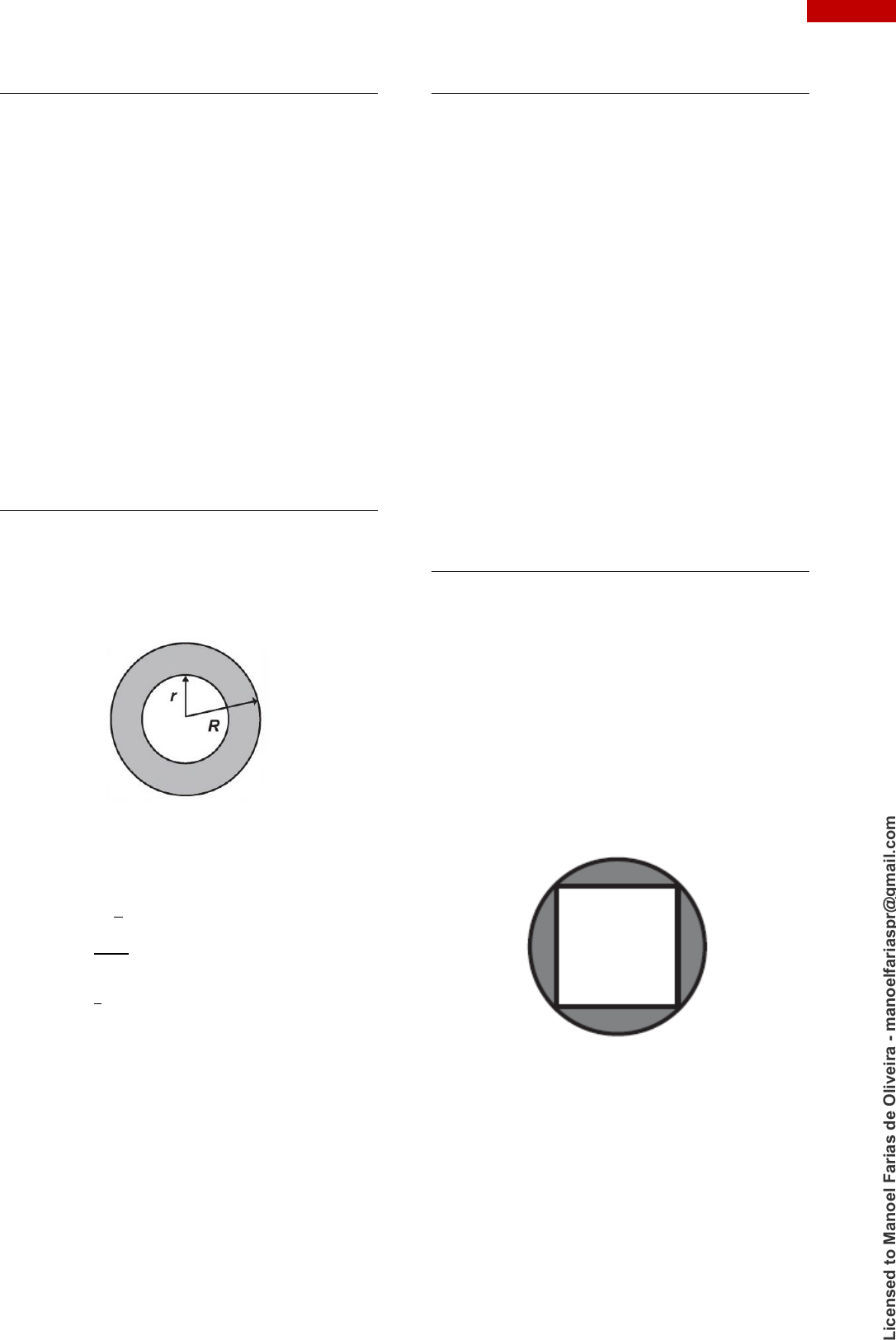 215 GEOMETRIA PLANA 3 – CÍRCULOS QUESTÃO 12 (ENEM 2016 PPL) Um ciclista A usou uma bicicleta com rodas com diâmetros medindo 60 cm e percorreu, com ela, 10 km. Um ciclista B usou outra bicicleta com rodas cujos diâmetros mediam 40 cm e percorreu, com ela, 5 km. Considere 3,14 como aproximação para n. A relação entre o número de voltas efetuadas pelas rodas da bicicleta do ciclista A e o número de voltas efetuadas pelas rodas da bicicleta do ciclista B é dada por A) 1/2. B) 2/3. C) 3/4. D) 4/3. E) 3/2. QUESTÃO 13 (ENEM 2016 PPL) No projeto de arborização de uma praça está prevista a construção de um canteiro circular. Esse canteiro será constituído de uma área central e de uma faixa circular ao seu redor, conforme ilustra a figura. Deseja-se que a área central seja igual à área da faixa circular sombreada. A relação entre os raios do canteiro (R) e da área central (r) deverá ser A) 𝑅 = 2𝑟 B) 𝑅 = 𝑟√2 C) 𝑅 = 𝑟2+2𝑟 2 D) 𝑅 = 𝑟2 + 2𝑟 E) 𝑅 = 3 2 𝑟 QUESTÃO 14 (ENEM 2016 PPL) Tradicionalmente, uma pizza média de formato circular tem diâmetro de 30 cm e é dividida em 8 fatias iguais (mesma área). Uma família, ao se reunir para o jantar, fará uma pizza de formato circular e pretende dividi-la em 10 fatias também iguais. Entretanto, eles desejam que cada fatia dessa pizza tenha o mesmo tamanho (mesma área) de cada fatia da pizza média quando dividida em 8 fatias iguais. Qual o valor mais próximo do raio com que deve ser feita a pizza, em centímetros, para que eles consigam dividi-la da forma pretendida? Use 2,2 como aproximação de √5. A) 15,00 B) 16,50 C) 18,75 D) 33,00 E) 37,50 QUESTÃO 15 (ENEM 2016 PPL) Um arquiteto deseja construir um jardim circular de 20 m de diâmetro. Nesse jardim, uma parte do terreno será reservada para pedras ornamentais. Essa parte terá a forma de um quadrado inscrito na circunferência, como mostrado na figura. Na parte compreendida entre o contorno da circunferência e a parte externa ao quadrado, será colocada terra vegetal. Nessa parte do jardim, serão usados 15 kg de terra para cada m². A terra vegetal é comercializada em sacos com exatos 15 kg cada. Use 3 como valor aproximado para π. O número mínimo de sacos de terra vegetal necessários para cobrir a parte descrita do jardim é A) 100. B) 40. C) 200. D) 800. E) 1000. L ic en se d t o M an o el F ar ia s d e O liv ei ra - m an o el fa ri as p r@ g m ai l.c o m