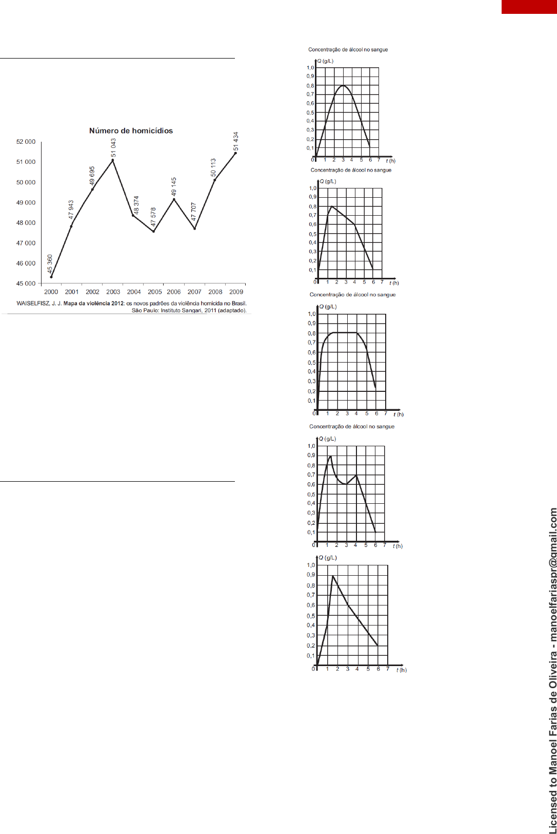 232 GRÁFICOS QUESTÃO 18 (ENEM 2016 PPL) Ano após ano, muitos brasileiros são vítimas de homicídio no Brasil. O gráfico apresenta a quantidade de homicídios registrados no Brasil, entre os anos 2000 e 2009. Se o maior crescimento anual absoluto observado nessa série se repetisse de 2009 para 2010, então o número de homicídios no Brasil ao final desse período seria igual a A) 48 839. B) 52 755. C) 53 840. D) 54 017. E) 54 103. QUESTÃO 19 (ENEM 2016 PPL) O Código de Trânsito de certo país estabelece penas para quem conduzir veículo automotor na via pública, estando com concentração de álcool no sangue igual ou superior a 0,6 grama por litro. Um pesquisador monitorou um indivíduo que ingeriu bebida alcoólica somente após o jantar. Exames realizados no sangue desse indivíduo mostraram que a concentração Q de álcool no sangue, dada em grama por litro, aumentou durante 1 hora e meia. Depois disso, começou a diminuir e atingiu a concentração permitida para dirigir, três horas após a ingestão de álcool. Um gráfico que pode representar a relação entre o tempo após a ingestão e a concentração de álcool no sangue desse indivíduo é A) B) C) D) E) L ic en se d t o M an o el F ar ia s d e O liv ei ra - m an o el fa ri as p r@ g m ai l.c o m