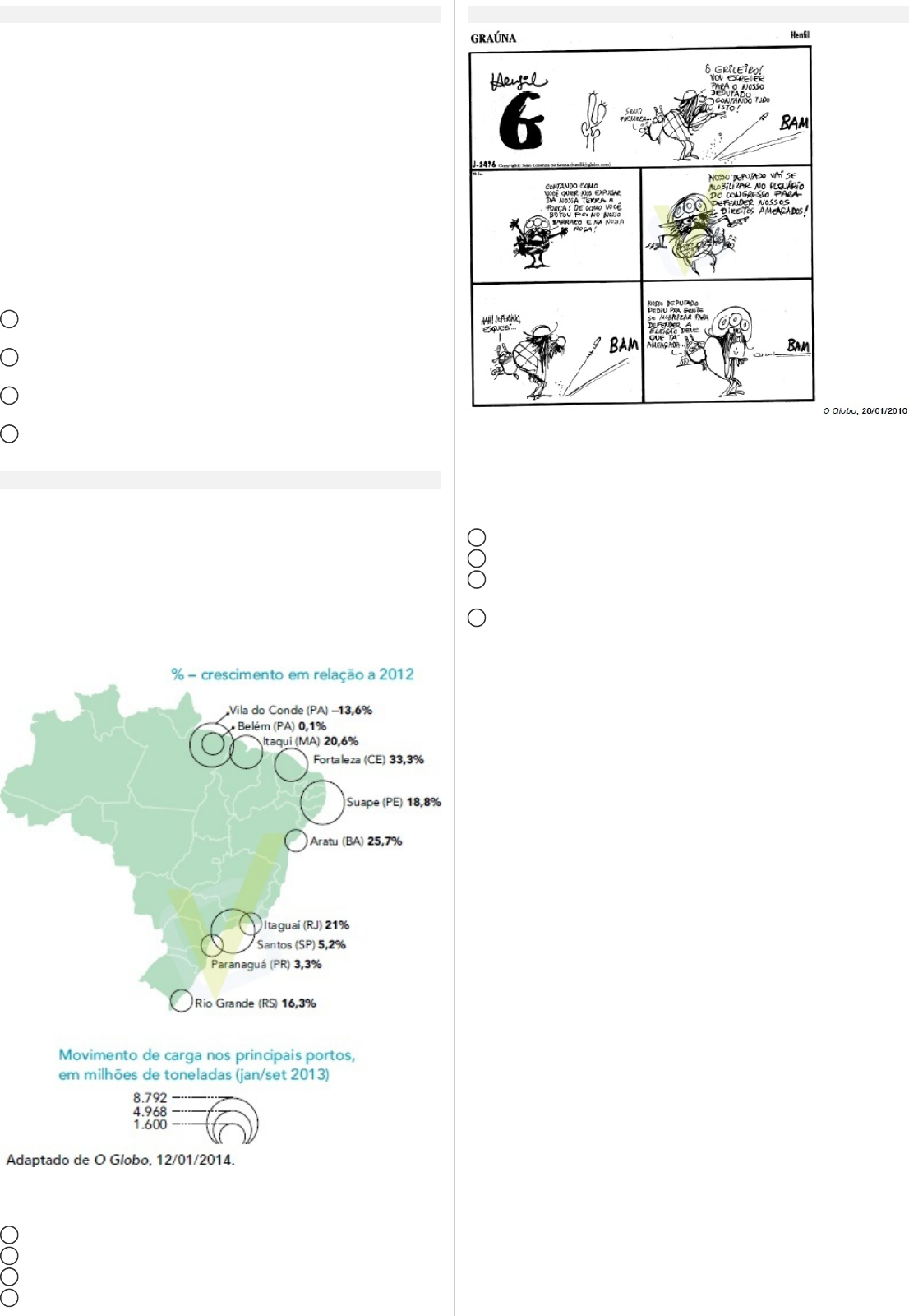 (UERJ) a b c d (UERJ) a b c d (UERJ) c d a b Questão 79 A estrutura desse sistema internacional de circulação alcançou tal grau de complexidade que ultrapassa a compreensão da maioria das pessoas. As fronteiras entre funções diferentes como as de bancos, corretoras, serviços financeiros, financiamento habitacional, crédito ao consumidor etc. tornaram-se cada vez mais porosas, ao mesmo tempo que novas transações futuras de mercadorias, de ações, de moedas ou de dívidas surgiram em toda parte, introduzindo o tempo futuro no tempo presente de maneiras estarrecedoras. DAVID HARVEY Adaptado de Condição pós-moderna. São Paulo: Edições Loyola, 1992. O texto faz referência a características de um dos mais importantes aspectos do atual estágio do capitalismo. Dois fatores que contribuem para o fenômeno destacado pelo autor do fragmento estão apontados em: aumento da especulação financeira – maior eficiência das redes de transportes controle do Banco Mundial sobre o sistema financeiro – formação da União Monetária Mundial desregulamentação dos mercados financeiros – disseminação das tecnologias da informação padronização dos horários de funcionamento dos centros financeiros – surgimento dos bancos globais Questão 80 Novos caminhos pelo mar Mesmo com a economia brasileira crescendo pouco, um setor se expande de forma vigorosa, com taxas “chinesas”: a cabotagem, ou o transporte interno de cargas pelo mar, que avançou 7,7% só nos primeiros nove meses de 2013, frente ao mesmo período de 2012. O incremento é mais sentido na área nobre do setor de cargas, os produtos transportados por contêineres, nos quais está o maior valor agregado. No período, a taxa de expansão desse segmento foi de 28%. Com base nos dados apresentados, o ritmo do crescimento da cabotagem pode ser explicado pela característica da organização socioespacial brasileira indicada em: portos separados por distância reduzida estradas presentes ao longo do território cultivos direcionados ao mercado mundial populações concentradas em faixa litorânea Questão 81 Os conflitos relacionados à propriedade fundiária no Brasil possuem raízes históricas profundas e uma multiplicidade de agentes sociais envolvidos. Na situação referida nos quadrinhos, um desses agentes sociais, o grileiro, é mais especificamente definido por: apoderar-se de terras de forma ilegal promover a segurança pessoal dos latifundiários pressionar os pequenos fazendeiros para a venda dos imóveis ocupar uma pequena área desprovida de título de propriedade