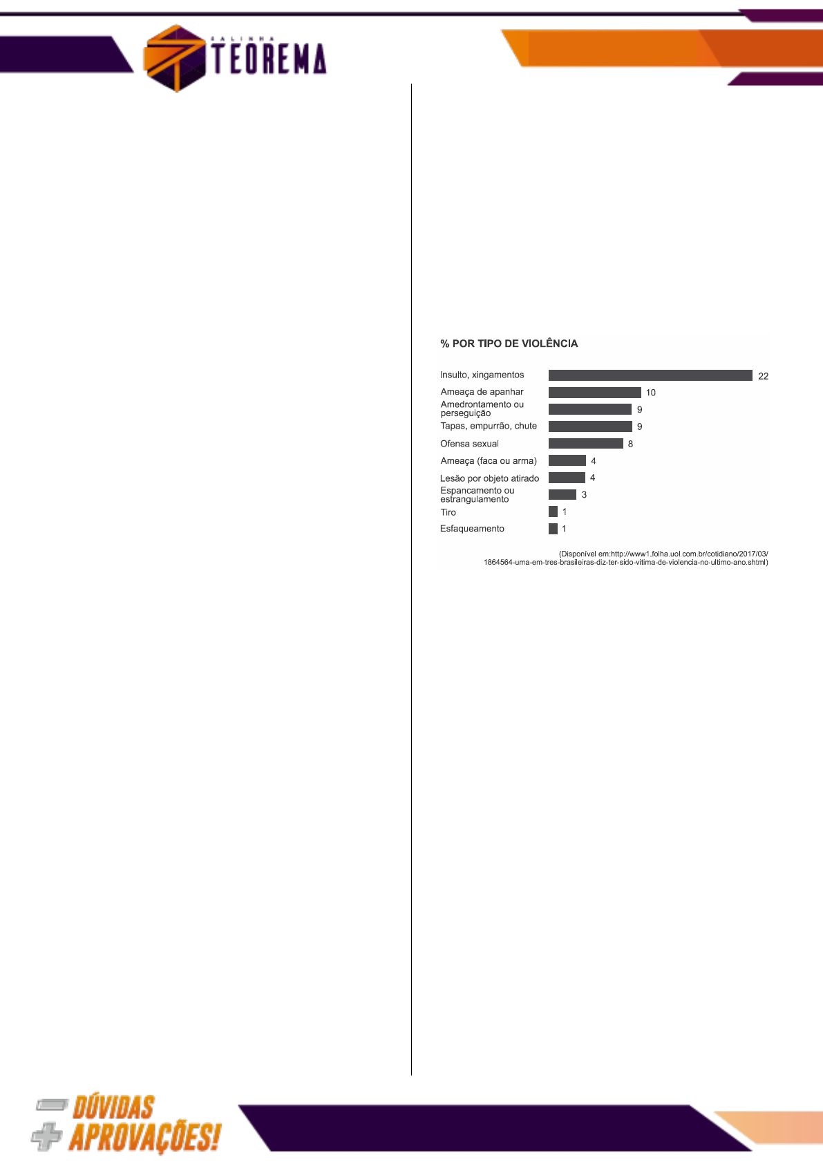 PORCENTAGEM 09. No início de 2016, 90% da população econo- micamente ativa de uma cidade estava empregada. Ao fim do primeiro semestre desse ano, 30% dos empregados deixaram seus empregos e 10% dos que estavam desempregados conseguiram emprego. Durante o segundo semestre desse ano, 20% dos trabalhadores foram demitidos ou pediram demissão, enquanto 50% dos desempregados foram admitidos no mercado de trabalho. Podemos concluir que, no fim de 2016, a porcentagem de desempregados dessa cidade era próxima de: a) 27% b) 42% c) 31% d) 47% e) 35% 10. Uma pessoa, que perdeu um objeto pessoal quando visitou uma cidade, pretende divulgar nos meios de comunicação informações a respeito da perda desse objeto e de seu contato para eventual devolução. No entanto, ela lembra que, de acordo com o Art. 1.234 do Código Civil, poderá ter que pagar pelas despesas do transporte desse objeto até sua cidade e poderá ter que recompensar a pessoa que lhe restituir o objeto em, pelo menos, 5% do valor do objeto. Ela sabe que o custo com transporte será de um quinto do valor atual do objeto e, como ela tem muito interesse em reavê-lo, pretende ofertar o maior percentual possível de recompensa, desde que o gasto total com as despesas não ultrapasse o valor atual do objeto. Nessas condições, o percentual sobre o valor do objeto, dado como recompensa, que ela deverá ofertar é igual a a) 20% b) 25% c) 40% d) 60% e) 80% 11. Sabe-se que, para preparar uma determinada suplementação alimentar, a quantidade de suplemento a ser diluída deve ser de 3% do volume de leite. Se for utilizado meio litro de leite e se a medida usada para o suplemento for uma colher que tem 33 cm , então, o número de colheres do suplemento que será necessário, nessa preparação, é igual a a) 5. b) 6. c) 7. d) 8. e) 11. 12. Em agosto de 2017 completaram-se 11 anos da promulgação da Lei Maria da Penha, lei criada para coibir a violência doméstica e familiar contra a mulher. A pesquisa Visível e Invisível: a Vitimização de Mulheres no Brasil, realizada em março de 2017 pelo Datafolha, a pedido do Fórum Brasileiro de Segurança Pública, revelou que 29% das mulheres brasileiras sofreram violência física, verbal ou psicológica em 2016. Dados desta pesquisa podem ser acompanhados pelo gráfico abaixo. A partir das 2.073 mulheres ouvidas, em 130 municípios brasileiros, o estudo projetou que 503 mulheres foram vítimas de agressões físicas a cada hora no Brasil e que dois a cada três brasileiros (66%) presenciaram uma mulher sendo agredida física ou verbalmente no mesmo período. Os resultados da pesquisa sinalizaram, também, que a violência é algo socialmente tolerado e que, entre 2015 e 2017, foi registrado no país um aumento de 18% para 29% no número de mulheres que se declararam vítimas de violência, índice que se mantinha estável, entre 15% e 19%, desde 2005. Considerando-se as mulheres ouvidas na pesquisa, quantas, aproximadamente, sofreram agressões por ofensa sexual? a) 40 b) 146 c) 166 d) 601 e) 765