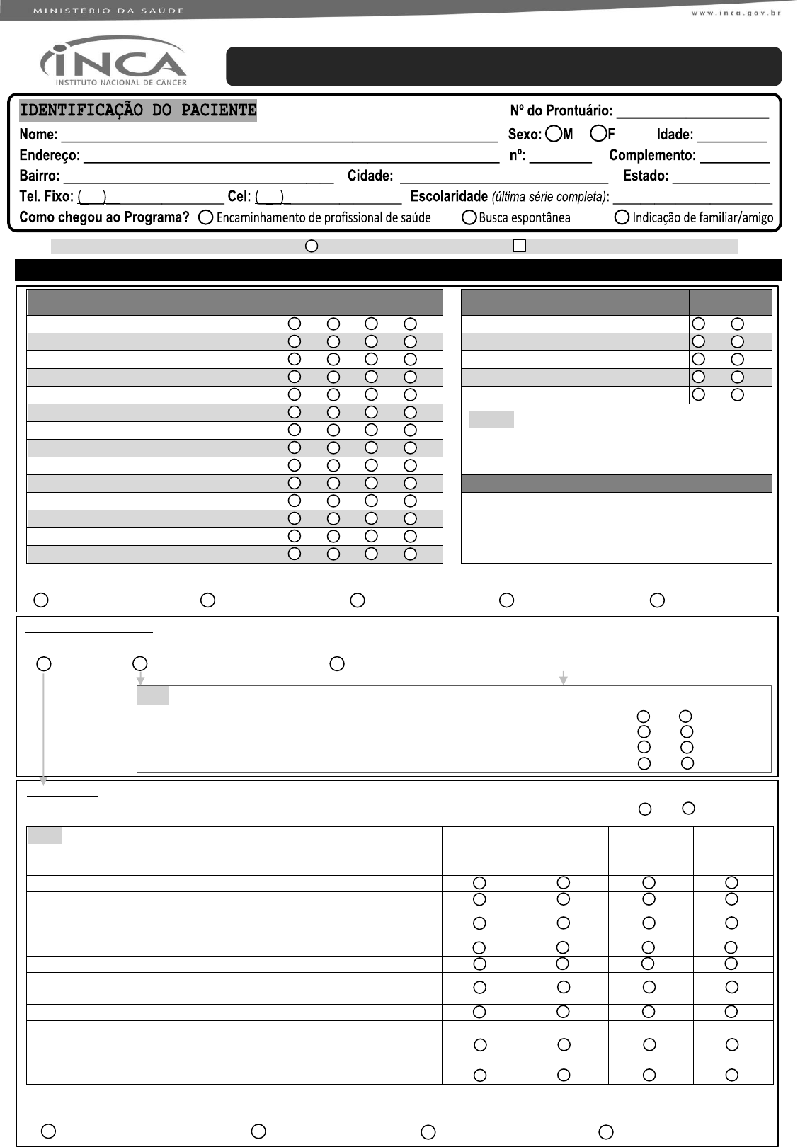 https://www.inca.gov.br/programa-nacional-de-controle-do-tabagismo/tratamento Instrução geral para preenchimento deste formulário: marcar apenas uma opção de resposta pode marcar mais de uma opção de resposta HISTÓRICO PATOLÓGICO Doenças / Fatores de risco Tem/teve? Em tratamento? Fatores de risco Atualmente 1. Diabetes mellitus S N S N 15. Prótese dentária móvel (atual)*** S N 2. Hipertensão arterial S N S N 16. Gravidez (atual)**** S N 3. Problema cardíaco S N S N 17. Amamentação (atual)**** S N 4. Problema pulmonar S N S N 18. Menores de 18 anos (atual)**** S N 5. Alergia respiratória S N S N 19. Convive com fumantes em casa? S N 6. Crises de depressão e/ou ansiedade S N S N Atenção! Medicação de tratamento à cessação a restringir: *bupropiona ** adesivo *** goma ****total 7. Tratamento psicológico ou psiquiátrico S N S N 8. Anorexia nervosa ou bulimia* S N S N 9. Crise convulsiva ou epilepsia* S N S N 10. Lesão ou tumor maligno* S N S N 20. Medicamentos diversos em uso atualmente 11. Alergia cutânea** S N S N ___________________________________________ ___________________________________________ 12. Aftas, lesões ou sangramento na boca*** S N S N 13. Dor no estômago, úlcera ou gastrite*** S N S N 14. Outra. Qual? ____________________ S N S N 21. Em geral, como você avalia sua saúde? 1.Muito boa 2.Boa 3.Regular 4.Ruim 5.Muito ruim Consumo de álcool atual 22. Com que frequência você costuma consumir alguma bebida alcoólica? 1. Nunca 2. Menos de uma vez por mês 3. Uma vez ou mais por mês 22.1. Quantos dias por semana? ______ CAGE: Três ou quatro respostas positivas no CAGE mostram uma tendência importante para alcoolismo. 23. Alguma vez você sentiu que deveria diminuir a quantidade de bebida ou parar de beber? .... Sim Não 24. As pessoas o aborrecem porque criticam o seu modo de beber? ............................................. Sim Não 25. Você se sente culpado ou chateado consigo mesmo pela maneira como costuma beber? ..... Sim Não 26. Você costuma beber pela manhã para diminuir o nervosismo ou ressaca? ............................. Sim Não Saúde mental 27. Já fez uso de alguma medicação para dormir ou se acalmar, mesmo não prescrita por médico? ............................... Sim Não PHQ-9: Se soma dos pontos for ≥9, indivíduo em maior risco de episódio depressivo maior (rastreio) 28. Nas últimas duas semanas, em quantos dias o(a) sr.(a): Nenhum dia [0] Menos de uma semana [1] Uma semana ou mais [2] Quase todos os dias [3] 1) teve pouco interesse ou pouco prazer em fazer as coisas? 2) se sentiu para baixo, deprimido(a) ou sem perspectiva? 3) teve dificuldade para pegar no sono ou permanecer dormindo ou dormiu mais do que de costume? 4) se sentiu cansado(a) ou com pouca energia? 5) teve falta de apetite ou comeu demais? 6) se sentiu mal consigo mesmo(a) ou achou que é um fracasso ou que decepcionou sua família ou a você mesmo(a)? 7) teve dificuldade para se concentrar nas coisas (como ler jornal ou ver tv)? 8) teve lentidão para se movimentar ou falar (a ponto das pessoas perceberem), ou ao contrário, esteve tão agitado(a) que você ficava andando de um lado para o outro mais do que de costume? 9) pensou em se ferir de alguma maneira ou que seria melhor estar morto(a)? 29. Considerando as últimas duas semanas, os sintomas anteriores lhe causaram algum tipo de dificuldade para trabalhar ou estudar ou tomar conta das coisas em casa ou para se relacionar com as pessoas? 1.Nenhuma dificuldade 2.Pouca dificuldade 3.Muita dificuldade 4.Extrema dificuldade ANAMNESE CLÍNICA PARA O TRATAMENTO DO TABAGISMO HISTÓRIA TABAGÍSTICA 30. Com que idade você começou a fumar? _________________ 31. O cigarro está associado ao seu dia a dia em quais situações? 1.Ao falar ao telefone 3.Com café 5.No trabalho 7.Ansiedade 9.Nenhum 2.Com bebidas alcoólicas 4.Após refeições 6.Alegria 8.Tristeza 10.Outros:_________________ 32. Sobre o cigarro que você fuma: A. Qual a marca? B. Quanto custa o maço? C. Nº cigarros por dia D. Valor por dia (B/20 x C) E. Valor por mês (D x 30) F. Valor por ano (E x 12) ______________ R$ ___________ nº _________ R$ ___________ R$ ___________ R$ ___________ 33. Usa cigarro com sabor? ..... Não Sim 33.1 Se sim, qual sabor? _______________________ 33.2. Desde que idade? ________ 34. Você convive com fumantes em casa? ..................... Não Sim 34.1 Se sim, qual o parentesco? ___________________________ 35. Quantas vezes já tentou parar de fumar? _______ 35.1. Se já tentou parar de fumar, quais recursos já utilizou? 1.Nenhum 3.Medicação. Qual? ________________________ 2.Profissional de saúde 4.Outro. Qual? ____________________________ 35.2. Por que voltou a fumar? _____________________________________________ 35.3. Teve sintoma de abstinência? Qual? ____________________________________ 36. Quando você pensa em parar de fumar? 1.Sem planos para parar 2.Indeciso 3.Nos próximos 30 dias 4.Nos próximos 6 meses 5.No próximo ano 37. Qual(is) o(s) motivo(s) para você parar de fumar? 1. Tratamento médico atual 2. Está afetando a saúde atualmente 3. Preocupação com saúde futura 4. Gasto financeiro 5. Exemplo para filhos/crianças 6. Restrição de fumar nos ambientes 7. Pressão da família/amigos 8. Bem-estar da família 9. Outro. Qual? ________________________ 38. Qual(is) o(s) seu(s) medo(s) em parar de fumar? 1.Passar mal 2.Não conseguir 3.Ganho de peso 4.Perder meu prazer 5.Outro: ________________________ 39. AVALIAÇÃO DO GRAU DE DEPENDÊNCIA À NICOTINA: TESTE DE FAGERSTROM 1) Quanto tempo após acordar você fuma seu primeiro cigarro? Dentro de 5 minutos = [ 3 ] Entre 31-60 minutos = [ 1 ] Entre 6-30 minutos = [ 2 ] Após 60 minutos = [ 0 ] 2) Você acha difícil não fumar em lugares proibidos, como igrejas, bibliotecas, cinemas, ônibus e etc.? Sim = [ 1 ] Não = [ 0 ] 3) Qual cigarro do dia traz mais satisfação? O primeiro da manhã = [ 1 ] Outros = [ 0 ] 4) Quantos ciga