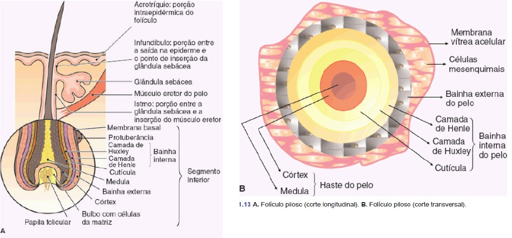 ALOPECIA ANATOMIA E FASES DE PRODUÇÃO DO PELO · Medula, córtex e cutícula do pelo são as 3 linhagens centrais que formam a haste do pelo (função primaria da fase anagena). Ao redor da haste, há 3 camadas concêntricas que compõem a bainha radicular interna (cutícula de BRI, camada de Huxley e camada de Henle) e por fora há a bainha radicular externa do pelo, entre a camada interna e externa, há a camada de companion, que permite o deslizamento da camada interna sobre a externa durante o crescimento do pelo na fase anagena) · Basicamente o folículo piloso é composto por três fases (fase anágena- crescimento efetivo, catágena-regressão, telógena-descanso), que se da pelas modificações em sua porção inferior (bulbo), que sofre retração e expansão, enquanto isso a porção superior do folículo é chamada de permanente pois permanece inalterada. O ciclo dos folículos é dessincronizado e obedece um padrão mosaico.t · Fase anágena Periodo de produção ativa dos fios. O bulbo e papila foliculares bem desenvolvidas, com sua extremidade situada na hipoderme. A matriz se encontra em plena atividade mitótica, dando origem a uma haste de pelo terminal, grossa e pigmentada. · É dividida em 6 estagios e seu inicio se da pelo ↑ do numero de células da papila dérmica devido ao influxo de células da bainha dérmica vizinha, acompanhado de um ↑ da matriz extracelular · Conforme ocorre diferenciação das células da matriz, diferentes células percursoras das diferentes partes do folículo são geradas, de modo que, a medida que ascendem pelo folículo, há formação das sete camadas concêntricas do folículo, sendo a bainha folicular externa a camada mais externa · Fase catágena quando as células da matriz e da bainha interna iniciam um processo de apoptose e interrompem suas mitoses, provocando retração inferior do folículo, ate o nível da inserção do ms eretor, ou seja, o bulbo sobe ate esse nível. · Os melanócitos da bainha dérmica ↓ a melanogenese, há ↓ de volume de 50% da papila dérmica.ha cessação da atv mitótica das células da matriz do bulbo e as células restantes se diferenciam e formam a base da haste do pelo, recebendo o nome de clava. · Essa clava migra em direção ascendente dentro do folículo ate o nível do ms piloeretor. Conforme essa migração ocorre, a papila dérmica se separa da matriz por uma fina camada epitelial · Fase telógena fase de repouso. As células da papila, agora bastante diminuídas, emitem sinais capazes de ↑ a atv mitótica fazendo surgir de novo a fase anágena e surgindo um novo ciclo. OBS: há ainda 2 estágios fora os 3 principais: 1. Exógeno é o quarto estagio do ciclo do pelo, onde há sua queda. Ocorre o desprendimento da clava de seu saco epitelial. É um processo ativo, não apenas feito por estímulos mecanicos 2. Quenógeno ocorre quando o folículo telogeno já se desprendeu da haste, mas ainda não foi feito a transição para a fase anágena. A alopecia androgenetica é caracterizada por uma grande quantidade de folículos quenógenos · O ambiente vizinho ao folículo também exerce influencia no seu ciclo : · Proteínas morfogeneticas osseas (BMPs) na gordura subcutânea mantem os folículos em estagio telogeno refratário, a cessação da inibição das BMPs permite que o folículo progrida para o estagio telogeno competente, podendo responder aos estímulos para iniciar a fase a nagena · O couro cabeludo possui 100.000 foliculos pilosos, que crescem 0,3 mm/dia. A duração de cada fase do ciclo é: anagena (3-6 anos), catagena (2 semanas) e telógena (3 meses) EFLÚVIO TELÓGENO · Introdução ocorre em ambos os sexos, porem mais prevalente em mulheres. A principal queixa é a queda de cabelo com perda de 25-35% dos cabelos · Etiopatogenia Envolve a sincronização dos ciclos foliculares em fase de queda (telogena). Isso se da pela interrupção da fase de crescimento folicular (anagena), dai os pelos entram em fase telogena juntos e caem em 2-3 meses após algum fator desencadeante · Podem ter uma serie de causas como: uso de medicamentos, parto, estresse, adm de feparina, distúrbios endocrinológicos · Pode ser dividido em 2 grupos: · Fisiológico ocorre em RN, e no eflúvio pos parto. A queda ocorre, muito comumente, com a ajuda do atrito no travesseiro, evidenciando alopecia occipital · Eflúvio por estresse é um processo que acelera a fase telogena. Alguns exemplos são procedimentos cirúrgicos ou alguns medicamentos. Alguns medicamentos que causam eflúvio anágeno (quimioterápicos) podem causar ET em baixas dosagens. Na pratica qualquer medicamento pode produzir ET, se observando a queda 2-3 meses após seu uso · CLÍNICA a densidade do cabelo pode estar reduzida em 50% · Tricodinia sensação dolorosa descrita como picadas de agulha no couro cabeludo. Pode ocorrer em 30% dos pacientes · Pode ser dividido em: (mas as duas formas podem se sobrepor aos estágios iniciais de AAG, dificultando o diagnóstico) · ET agudo duração de 2-6 meses, sendo autolimitado com recuperação completa, sem necessidade de intervenção. São mais associados aos casos de ET fisiológico · ET crônico meses ou ano., em mulheres menopausaas pode levar mais tempo. Pode ter cursos de maior queda · A anamnese deve ser bem feita, investigando: · Calvice familiar, inicio da queda, doenças recentes e traumas · Historia de drogas deve ser avaliada, tanto as em uso quanto as que foram interrompidas · Historia menstrual anemia severa deficiência de ferro · Uso de aco, história de aborto recente ou parto · Excluir doenças da tireoide e deficiência de ferro · Teste de tração do cabelo puxa um grupo de cerca de 50 fios da base ate a extremidade, normalmente o desprendimento dos fios énecessita de intervenção pois é autolimitado. O apoio psicológico é fundamental para que haja ↓ da queda ativa · ET crônico se justifica uma terapêutica · O ideal é que o pa
