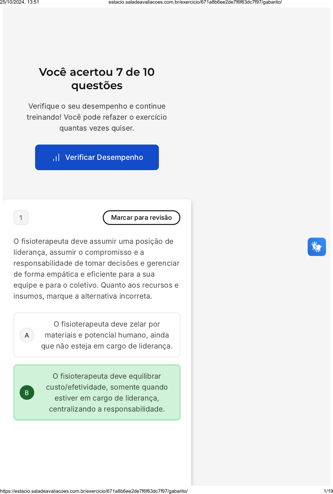 Você acertou 7 de 10 questões Verifique o seu desempenho e continue treinando! Você pode refazer o exercício quantas vezes quiser. Verificar Desempenho A B 1 Marcar para revisão O fisioterapeuta deve assumir uma posição de liderança, assumir o compromisso e a responsabilidade de tomar decisões e gerenciar de forma empática e eficiente para a sua equipe e para o coletivo. Quanto aos recursos e insumos, marque a alternativa incorreta. O fisioterapeuta deve zelar por materiais e potencial humano, ainda que não esteja em cargo de liderança. O fisioterapeuta deve equilibrar custo/efetividade, somente quando estiver em cargo de liderança, centralizando a responsabilidade. 25/10/2024, 13:51 estacio.saladeavaliacoes.com.br/exercicio/671a8b6ee2de7f6f63dc7f97/gabarito/ https://estacio.saladeavaliacoes.com.br/exercicio/671a8b6ee2de7f6f63dc7f97/gabarito/ 1/19 C D E O fisioterapeuta deve se basear em evidências científicas e estudos de comportamento para uso e consumo adequados. O fisioterapeuta deve evitar desperdícios e mau uso da força de trabalho. O fisioterapeuta deve estimular, através de atualizações e educação continuada, a mobilização de conhecimentos acadêmicos e profissionais, que otimizem o uso. Resposta correta Parabéns, você selecionou a alternativa correta. Confira o gabarito comentado! Gabarito Comentado A alternativa B é a incorreta. O fisioterapeuta, independentemente de estar em um cargo de liderança ou não, deve sempre buscar equilibrar custo e efetividade. A responsabilidade de gerir recursos de maneira eficiente e eficaz não deve ser centralizada apenas na figura do líder, mas deve ser compartilhada por todos os profissionais da equipe. Portanto, a ideia de que o equilíbrio entre custo e efetividade deve ser uma preocupação apenas quando o fisioterapeuta ocupa um cargo de liderança é equivocada. As demais alternativas estão corretas, pois destacam a importância do zelo pelos materiais e pelo potencial humano, da base em evidências científicas e estudos de comportamento para o uso e consumo 25/10/2024, 13:51 estacio.saladeavaliacoes.com.br/exercicio/671a8b6ee2de7f6f63dc7f97/gabarito/ https://estacio.saladeavaliacoes.com.br/exercicio/671a8b6ee2de7f6f63dc7f97/gabarito/ 2/19 A B C D E adequados, da prevenção de desperdícios e mau uso da força de trabalho e da promoção de atualizações e educação continuada para a mobilização de conhecimentos acadêmicos e profissionais. 2 Marcar para revisão A Fisioterapia exige do profissional uma qualidade fundamental para ser capaz de decidir e traçar condutas otimizadas de forma coerente, apropriada e eficaz, em todos os âmbitos de intervenção. No que diz respeito a essa qualidade, marque a alternativa correta. Capacidade de se comunicar somente com as chefias de equipe. Capacidade de se submeter aos tratamentos prescritos pelo médico. Capacidade de organizar eventos científicos. Capacidade de tomada de decisão em todos os campos e níveis de atuação. Capacidade de manter postura superior aos seus colegas. Resposta correta Parabéns, você selecionou a alternativa correta. Confira o gabarito comentado! 25/10/2024, 13:51 estacio.saladeavaliacoes.com.br/exercicio/671a8b6ee2de7f6f63dc7f97/gabarito/ https://estacio.saladeavaliacoes.com.br/exercicio/671a8b6ee2de7f6f63dc7f97/gabarito/ 3/19 Gabarito Comentado A qualidade fundamental para um profissional de Fisioterapia é a capacidade de tomada de decisão em todos os campos e níveis de atuação. Isso permite que ele realize avaliações e trace condutas adequadas à realidade do paciente, assumindo a responsabilidade por todas as etapas do tratamento. Além disso, é importante que o profissional desenvolva habilidades como uma boa comunicação com todos os membros das equipes, mantendo sempre uma postura horizontalizada e humilde nas relações interpessoais. No entanto, isso não significa que ele deva se submeter aos tratamentos prescritos por qualquer outra categoria profissional. Portanto, a alternativa D é a correta. 3 Marcar para revisão O Ensino Híbrido, que é basicamente um método, tornou a coexistência das atividades online e presenciais um modo de aprendizado dinâmico, flexível e de liberdade. De um lado, o presencial estimula a interação entre alunos, com debates de ideias e trabalhos em grupo de experimentos e vivências em laboratórios e salas. De outro lado, o ensino a distância oferta autonomia e responsabilização do aluno por gerir o tempo e priorizar as atividades em ritmo e local que julgar mais apropriado. Dadas as sentenças abaixo, marque a alternativa que correspondem a afirmativas corretas. I � Modelos sustentados - trazem o conforto de se ter uma maior familiaridade e proximidade com o ensino EAD. 25/10/2024, 13:51 estacio.saladeavaliacoes.com.br/exercicio/671a8b6ee2de7f6f63dc7f97/gabarito/ https://estacio.saladeavaliacoes.com.br/exercicio/671a8b6ee2de7f6f63dc7f97/gabarito/ 4/19 A B C D E II � Modelo de Rotações por Estações - objetiva dividir a aula em estações de trabalhos independentes e fixas, cada qual destinadas a cuidar de uma parte da aula, e o aluno circula pelas estações. III � Modelos Disruptivos - acontecem quase que na sua totalidade por iniciativa do aluno e sem a presença do professor. O aluno é praticamente emancipado. IV � Modelo Flex - permite a construção de objetivos de aprendizagem individual de acordo com interesses e aptidões do aluno, sem mediação de um professor, e não há possibilidade de auxílio, pois não existe a figura do tutor. I, II, III estão certas. I e II estão corretas. II e III estão corretas. III e IV estão corretas. Somente IV está correta. Resposta correta Parabéns, você selecionou a alternativa correta. Confira o gabarito comentado! Gabarito Comentado As afirmativas II e III estão corretas. O Modelo de Rotações por Estações tem como objetivo dividir a aula em estações de trabalhos independentes e fixas, cada 25/10/2024, 