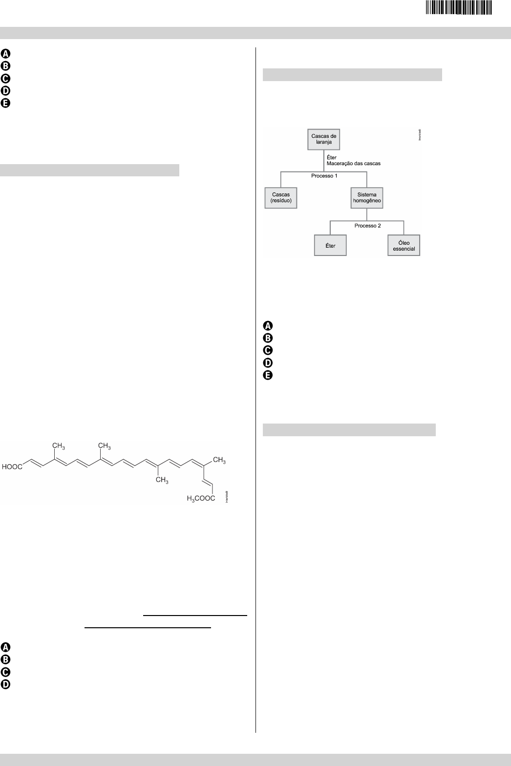 enem2021 /////////////////////////////////////////////////////////////////////////////////////////////////////////////////////////////////////////////////////////////////////////// /////////////////////////////////////////////////////////////////////////////////////////////////////////////////////////////////////////////////////////////////////////// I8020 – Help Educacional | Caderno de questões – Página 2 Trituração e evaporação Filtração e destilação Filtração e flotação Decantação e trituração Flotação e decantação Questão 3 //////////////////////////////////////////////////////////// No trecho a seguir, é apresentado o relato de um integrante da tribo Xavante sobre o processo de obtenção do corante de urucum, muito utilizado pelos povos indígenas e pela indústria alimentícia: "... as sementes são colocadas sobre um pedaço de couro de veado para serem socadas com o auxílio de pedras. Esse processo ajuda a retirar, a desgrudar, a extrair o pigmento do urucum." VilianesTsere’u’awaTsuwaté e Marcelo Franco Leão. Revista Destaques Acadêmicos, v. 9, nº 4, 2017. A substância responsável pelas tonalidades que vão do amarelo ao vermelho no urucum chama-se bixina, que apresenta a fórmula molecular 25 30 4C H O e fórmula estrutural representada a seguir: Estrutura da bixina: Durante a extração do urucum, são realizados alguns processos de separação de misturas, como: destilação, filtração e decantação. Para poder realizar esses e outros métodos de separação, é necessário ter conhecimento de algumas propriedades das substâncias que se pretende separar. Indique, dentre as alternativas abaixo, a que relaciona corretamente o método de separação com a respectiva propriedade da substância. Evaporação - ponto de fusão Decantação - solubilidade Separação magnética - densidade Destilação - ponto de ebulição Questão 4 //////////////////////////////////////////////////////////// O esquema a seguir representa o processo de extração do óleo essencial de cascas de laranja. Os números 1 e 2 correspondem a processos de separação de misturas denominados, respectivamente dissolução fracionada e filtração. decantação e centrifugação. centrifugação e filtração. destilação e decantação. filtração e destilação. Questão 5 ////////////////////////////////////////////////////////// O tratamento de água Quando pensamos em água tratada, normalmente nos vem à cabeça o tratamento de uma água que estava poluída, como o esgoto, para uma que volte a ser limpa. Cabe aqui fazer uma distinção entre tratamento de água e tratamento de esgoto: o tratamento de água é feito a partir da água doce encontrada na natureza que contém resíduos orgânicos, sais dissolvidos, metais pesados, partículas em suspensão e microrganismos. Por essa razão, a água é levada do manancial para a Estação de Tratamento de Água (ETA). Já o tratamento de esgoto é feito a partir de esgotos residenciais ou industriais para, após o tratamento, a água poder ser reintroduzida no rio, minimizando seu impacto ao ambiente. (Disponível em: http://www.usp.br/qambiental/tratamentoAgua.html#tratamento. Acessado em 18/09/18.)
