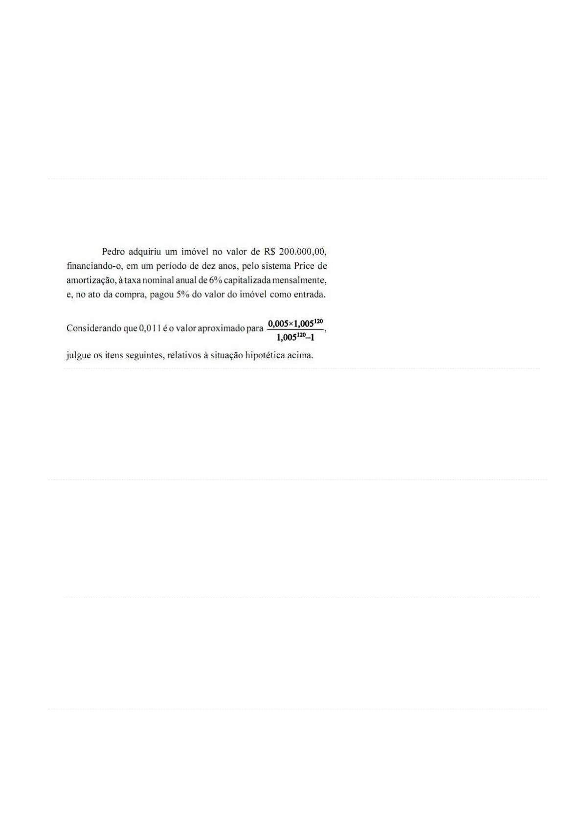09/12/2017 Questões de Concursos e Perguntas de Concursos Públicos- Aprova Concursos https://www.aprovaconcursos.com.br/questoes-de-concurso/questoes/disciplina/Matem%25C3%25A1tica/banca/CESPE/filtro/2/pagina/29/quantid… 2/6 Tomando 1,0873 e 24,8609 como valores aproximados para 1,007 e (1,007 - 1)/0,007, respectivamente, e desconsiderando os efeitos in�acionários e os impostos incidentes sobre a renda, julgue os itens seguintes, com base nessas informações. Sob o ponto de vista �nanceiro, será mais vantajoso para Marcos, a partir do momento em que ele tiver acumulado os R$ 25.000,00, continuar no emprego e receber os rendimentos da aplicação do que abrir o negócio que ele deseja, ainda que suas expectativas de ganho fossem con�rmadas. 12 23 Certo Errado 424) Q140444 (/questoes-de-concurso/questao/140444) (/questoes-de-concurso/questao/140444#imprimir) Provas: CESPE - 2012 - TRE-RJ - Analista Judiciário - Contabilidade (/questoes-de-concurso/prova/cespe-2012-tre-rj-analista-judiciario-contabilidade) Disciplina: Matemática (/questoes-de-concurso/disciplina/matematica) - Assuntos: 9. Sistemas de amortizações (/questoes-de-concurso/questoes/assunto/9.+Sistemas+de+amortiza%C3%A7%C3%B5es) Ocultar texto associado à questão A taxa mensal efetivamente paga por Pedro no citado �nanciamento foi de 0,5%. Certo Errado 425) Q144035 (/questoes-de-concurso/questao/144035) (/questoes-de-concurso/questao/144035#imprimir) Provas: CESPE - 2012 - TRE-RJ - Técnico Judiciário - Operação de Computador (/questoes-de-concurso/prova/cespe-2012-tre-rj-tecnico-judiciario-operacao-de-computador) Disciplina: Matemática (/questoes-de-concurso/disciplina/matematica) - Assuntos: 25. Análise combinatória ou princípio da contagem (/questoes-de-concurso/questoes/assunto/25.+An%C3%A1lise+combinat%C3%B3ria+ou+princ%C3%ADpio+da+contagem) Ocultar texto associado à questão Nas eleições municipais de uma pequena cidade, 30 candidatos disputam 9 vagas para a câmara de vereadores. Na sessão de posse, os nove eleitos escolhem a mesa diretora, que será composta por presidente, primeiro e segundo secretários, sendo proibido a um mesmo parlamentar ocupar mais de um desses cargos. Acerca dessa situação hipotética, julgue os itens seguintes. A quantidade de maneiras distintas para se formar a câmara de vereadores dessa cidade é igual a 30!/(9! × 21!). Certo Errado 426) Q144042 (/questoes-de-concurso/questao/144042) (/questoes-de-concurso/questao/144042#imprimir) Provas: CESPE - 2012 - TRE-RJ - Técnico Judiciário - Operação de Computador (/questoes-de-concurso/prova/cespe-2012-tre-rj-tecnico-judiciario-operacao-de-computador) Disciplina: Matemática (/questoes-de-concurso/disciplina/matematica) - Assuntos: 4.4. Porcentagem (/questoes-de-concurso/questoes/assunto/4.4.+Porcentagem) Ocultar texto associado à questão Ao iniciar uma sessão plenária na câmara municipal de uma pequena cidade, apenas 1/4 dos assentos destinados aos vereadores foram ocupados. Com a chegada do vereador Veron, 1/3 dos https://www.aprovaconcursos.com.br/questoes-de-concurso/questoes/assunto/25.+An%C3%A1lise+combinat%C3%B3ria+ou+princ%C3%ADpio+da+contagem https://www.aprovaconcursos.com.br/questoes-de-concurso/questao/144035#imprimir https://www.aprovaconcursos.com.br/questoes-de-concurso/prova/cespe-2012-tre-rj-tecnico-judiciario-operacao-de-computador https://www.aprovaconcursos.com.br/questoes-de-concurso/questao/144042#imprimir https://www.aprovaconcursos.com.br/questoes-de-concurso/questao/144035 https://www.aprovaconcursos.com.br/questoes-de-concurso/questoes/assunto/4.4.+Porcentagem https://www.aprovaconcursos.com.br/questoes-de-concurso/prova/cespe-2012-tre-rj-analista-judiciario-contabilidade https://www.aprovaconcursos.com.br/questoes-de-concurso/questao/140444#imprimir https://www.aprovaconcursos.com.br/questoes-de-concurso/questoes/assunto/9.+Sistemas+de+amortiza%C3%A7%C3%B5es https://www.aprovaconcursos.com.br/questoes-de-concurso/disciplina/matematica https://www.aprovaconcursos.com.br/questoes-de-concurso/disciplina/matematica https://www.aprovaconcursos.com.br/questoes-de-concurso/questao/144042 https://www.aprovaconcursos.com.br/questoes-de-concurso/disciplina/matematica https://www.aprovaconcursos.com.br/questoes-de-concurso/prova/cespe-2012-tre-rj-tecnico-judiciario-operacao-de-computador https://www.aprovaconcursos.com.br/questoes-de-concurso/questao/140444