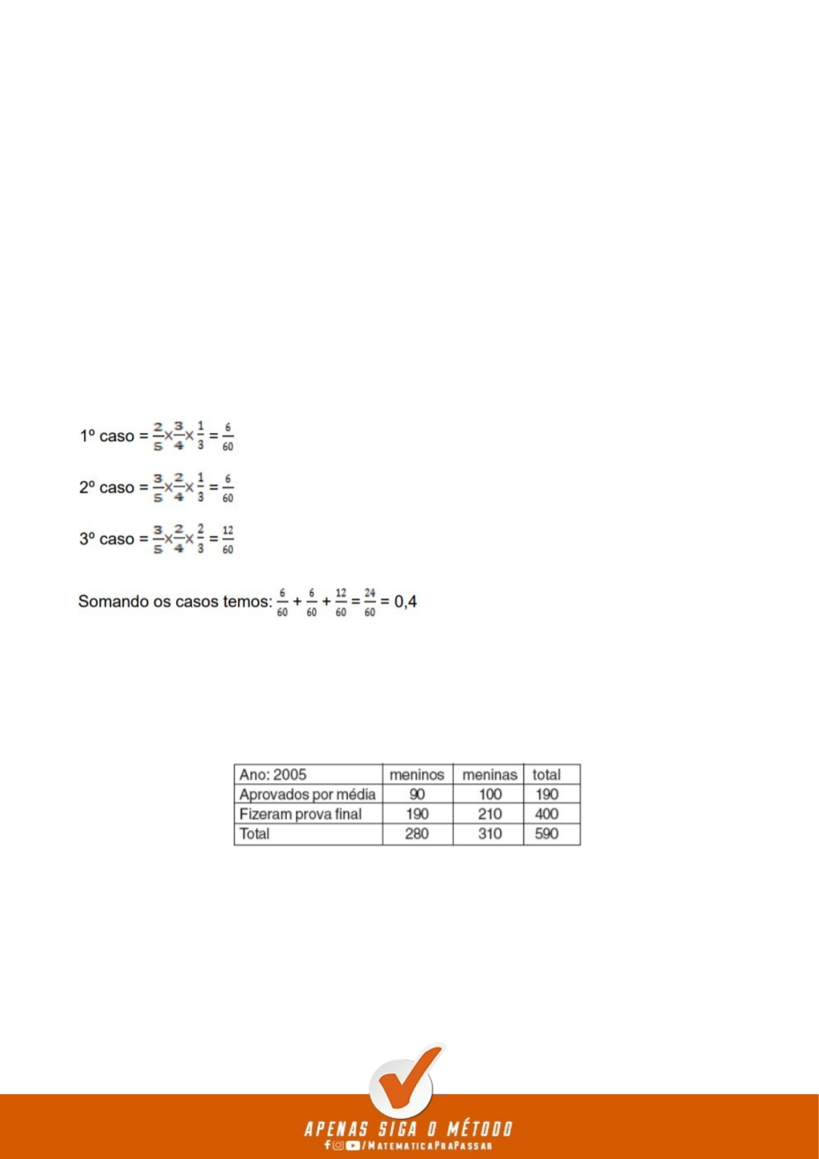Página 520 16 - Uma urna contém 2 bolas brancas e 3 bolas amarelas distinguíveis apenas pela cor. Aleatoriamente, duas bolas serão escolhidas, sucessivamente e sem reposição, e colocadas em uma segunda urna, na qual há apenas uma bola preta também distinta das demais apenas pela cor. Após a transferência das duas bolas para a segunda urna, escolher-se-á, aleatoriamente, uma única bola dessa urna. Qual a probabilidade de que, nesse último sorteio, a bola escolhida seja amarela? (A) 0,12 (B) 0,30 (C) 0,40 (D) 0,65 (E) 0,90 Resolução da questão Gabarito C 17 - A direção de certa escola decidiu sortear duas bolsas de estudo para 2006 entre os alunos que foram aprovados por média, em 2005. A situação dos alunos dessa escola é apresentada no quadro abaixo. Considere que todos os alunos que foram aprovados direto tenham a mesma chance de ser sorteados. A probabilidade de que ambas as bolsas de estudo sejam sorteadas para meninos é de: (A) 81 / 361 (B) 100 / 361 (C) 89 / 399 (D) 110 / 399 (E) 120 / 399 Resolução da questão