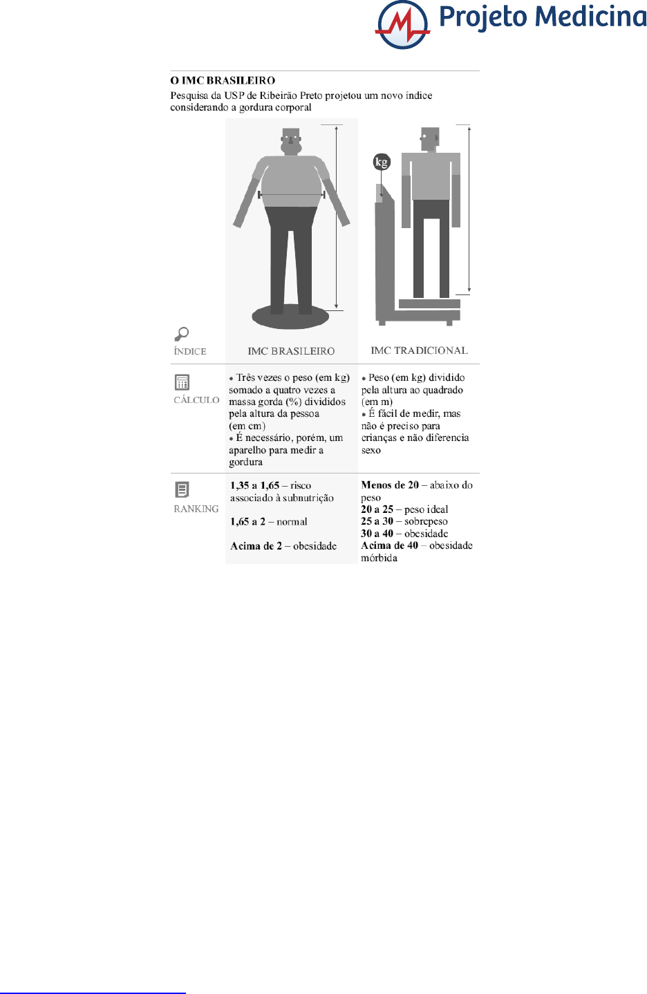 87 www.projetomedicina.com.br (www.folha.uol.com.br. Adaptado.) Suponha que uma pessoa de 1,75 m de altura e com 36% de massa gorda utilize o IMC brasileiro e obtenha o valor de 2,04, caracterizando obesidade. Se essa pessoa utilizasse o IMC tradicional, ela seria classificada como a) obesidade. b) sobrepeso. c) obesidade mórbida. d) abaixo do peso. e) peso ideal.