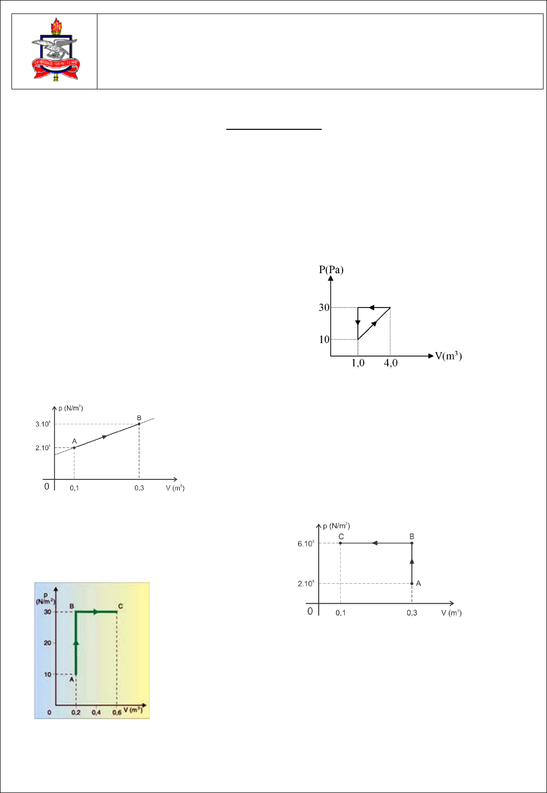 Lista de exercícios 6 1. Numa transformação sob pressão constante de 800 N/m2, o volume de um gás ideal se altera de 0,020 m3 para 0,060 m3. Determine o trabalho realizado durante a expansão do gás. 2. Um gás ideal, sob pressão constante de 2.105 N/m2, tem seu volume reduzido de 12.10-3 m3 para 8.10-3 m3. Determine o trabalho realizado no processo. 3. Sob pressão constante de 50 N/m2, o volume de um gás varia de 0,07 m3 a 0,09 m3. a) O trabalho foi realizado pelo gás ou sobre o gás pelo meio exterior? b) Quanto vale o trabalho realizado? 4. Um gás sofre uma transformação A => B conforme indica o diagrama p x V. Calcule o trabalho que o gás troca com o meio exterior. 5. Uma amostra de gás sofre a transformação ABC representada no gráfico. Durante esse processo, é transferida para o gás uma quantidade de energia, na forma de calor, igual a 10 calorias. a) Nomeie as transformações AB e BC sofrida pelo gás b) Determine o trabalho realizado pelo gás na transformação; c) Determine a variação de energia interna sofrida pelo gás na transformação. (Adote 1,0 cal ~ 4,0 J.) 6. (UDESC/2011) Um gás em uma câmara fechada passa pelo ciclo termodinâmico representado no diagrama p x V da Figura 4. Figura 4 O trabalho, em joules, realizado durante um ciclo é: a) + 30 J b) – 90 J c) + 90 J d) – 60 J e) – 30 J 7. Um gás sofre uma transformação A => B => C conforme indica o diagrama p x V. Calcule o trabalho que o gás troca com o meio exterior nas etapas A => B e B => C. 8. (FGV/2010) Ao realizar um trabalho de 80 mil calorias, um sistema termodinâmico recebeu 60 mil calorias. Pode-se afirmar que, nesse processo, a energia interna desse sistema a) se conservou. b) aumentou 60 mil calorias. c) diminuiu 80 mil calorias. d) aumentou 20 mil calorias. UNIVERSIDADE FEDERAL DO PARÁ CAMPUS: ___________________________ CURSO: ___________________________ ALUNO:________________________________________________________________ DISCIPLINA: FÍSICA I Lista de Exercícios 6 2 e) diminuiu 20 mil calorias. 9. (UNIMONTES MG/2006) Uma amostra de gás perfeito é comprimida por um agente externo, ao mesmo tempo em que recebe 350 J de calor de uma fonte térmica. Sabendo−se que o trabalho do agente externo foi de 650 J, a variação da energia interna do gás foi de: a) −1000 J b) 300 J c) 1000 J d) −300 J 10. Numa transformação isocórica, uma determinada massa de gás recebe a quantidade de calor igual a 1000 J. Determine o trabalho que o gás troca com o meio exterior e a correspondente variação de energia interna. 11. Numa transformação isotérmica, uma determinada massa de gás recebe a quantidade de calor igual a 1000 J. Determine o trabalho que o gás troca com o meio exterior e a correspondente variação de energia interna. 12. (UFAM/2008) Analise as seguintes afirmativas a respeito dos tipos de transformações ou mudanças de estado de um gás. I. em uma transformação isocórica o volume do gás permanece constante. II. em uma transformação isobárica a pressão do gás permanece constante. III. em uma transformação isotérmica a temperatura do gás permanece constante. IV. em uma transformação adiabática variam o volume, a pressão e a temperatura. Com a relação as quatro afirmativas acima, podemos dizer que: a) só I e III são verdadeiras. b) só II e III são verdadeiras. c) I, II, III e IV são verdadeiras. d) só I é verdadeira. e) todas são falsas. 13. (Vunesp) A primeira lei da termodinâmica diz respeito à: a) dilatação térmica. b) conservação da massa. c) conservação da quantidade de movimento. d) conservação de energia. e) irreversibilidade do tempo. 14. (UEPG PR/2008) A equação matemática que representa a 1ª lei da termodinâmica é dada por −= QE , onde E é a variação da energia interna do sistema, Q é a quantidade de calor trocado, e é o trabalho realizado. A respeito deste assunto, assinale o que for correto. 01. A 1ª lei da termodinâmica é uma afirmação do princípio da conservação da energia. 02. Em uma transformação cíclica, a variação da energia interna do sistema é nula. 04. Em uma compressão adiabática, o sistema recebe trabalho sem fornecer calor. 08. A energia interna de um gás perfeito se conserva durante uma transformação isotérmica. 15. (UNINOVE SP/2009) Certa massa de gás ocupa, inicialmente, 0,5 litro de um recipiente, sob pressão de 1,0 atm. O gás recebe certa quantidade de calor e aumenta sua energia interna em 12,5 cal, passando a ocupar um volume de 1,2 litro, sob pressão de 1,8 atm, como mostra o gráfico da pressão (p) em função do volume (V). Considerando-se Pa 10atm1 5= e J 4cal1 = , determine: a) o trabalho realizado pelo gás. b) a quantidade de calor que o gás absorve nessa transformação. 16. (UFRN/2008) A Figura 1, ao lado, representa o martelo de massa M, de um bate-estaca, suspenso por um cabo a uma altura h, em relação à superfície superior do êmbolo de um pistão. Em determinado instante, o cabo é cortado, e o martelo cai livremente sobre o pistão. Com o impacto, o êmbolo do pistão comprime adiabaticamente 2 moles de um gás ideal contidos no interior do pistão, conforme Figura 2, também ao lado. Lista de Exercícios 6 3 Dados: • expressão da Primeira Lei da Termodinâmica: U = Q – W; • expressão da Variação da Energia Interna: U = (3/2) n.R. T . Considere: • aceleração da gravidade: g = 10 m/s2; • massa do martelo do bate-estaca: M = 5,0 kg; • altura à qual está suspenso o martelo: h = 6,0 m; • Constante Universal dos Gases Ideais: R = 8,0 Joule/mol.K; • o pistão e o respectivo êmbolo são constituídos de material isolante térmico. A partir dessas informações, a) descreva as transformações de energia que ocorreram no sistema, considerando a evolução deste, desde o momento em que o martelo é solto até o instante em que o êmbolo atinge a sua posição final de equilíbrio; b) calcule a variação de tempera