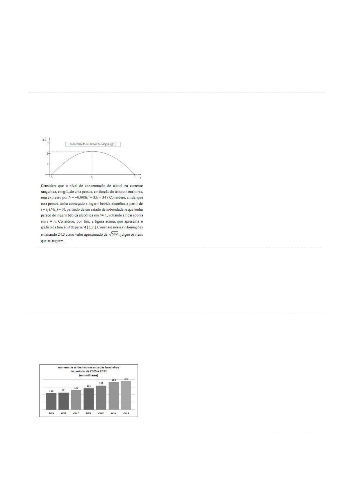 09/12/2017 Questões de Concursos e Perguntas de Concursos Públicos- Aprova Concursos https://www.aprovaconcursos.com.br/questoes-de-concurso/questoes/disciplina/Matem%25C3%25A1tica/banca/CESPE/filtro/2/pagina/13/quantid… 3/5 Com relação às funcionalidades do brinquedo descrito acima, julgue os itens a seguir. Se T = 5, então, quando o mostrador Tempo indicar 64 segundos, a bola II estará mais próxima de C do que de AII Certo Errado 188) Q201131 (/questoes-de-concurso/questao/201131) (/questoes-de-concurso/questao/201131#imprimir) Provas: CESPE - 2013 - PRF - Policial Rodoviário Federal (/questoes-de-concurso/prova/cespe-2013-prf-policial-rodoviario-federal) Disciplina: Matemática (/questoes-de-concurso/disciplina/matematica) - Assuntos: 8. Função do 2º grau ou quadrática (/questoes-de-concurso/questoes/assunto/8.+Fun%C3%A7%C3%A3o+do+2%C2%BA+grau+ou+quadr%C3%A1tica) Ocultar texto associado à questão O nível de concentração de álcool na corrente sanguínea da pessoa em questão foi superior a 1 g/L por pelo menos 23 horas. Certo Errado 189) Q201136 (/questoes-de-concurso/questao/201136) (/questoes-de-concurso/questao/201136#imprimir) Provas: CESPE - 2013 - PRF - Policial Rodoviário Federal (/questoes-de-concurso/prova/cespe-2013-prf-policial-rodoviario-federal) Disciplina: Matemática (/questoes-de-concurso/disciplina/matematica) - Assuntos: 22. Progressão aritmética (/questoes-de-concurso/questoes/assunto/22.+Progress%C3%A3o+aritm%C3%A9tica) Ocultar texto associado à questão Grá�co para os itens de 18 a 22 Considerando os dados apresentados no grá�co, julgue os itens seguintes. Os valores associados aos anos de 2008, 2009 e 2010 estão em progressão aritmética. Certo Errado https://www.aprovaconcursos.com.br/questoes-de-concurso/prova/cespe-2013-prf-policial-rodoviario-federal https://www.aprovaconcursos.com.br/questoes-de-concurso/questao/201131#imprimir https://www.aprovaconcursos.com.br/questoes-de-concurso/prova/cespe-2013-prf-policial-rodoviario-federal https://www.aprovaconcursos.com.br/questoes-de-concurso/questao/201131 https://www.aprovaconcursos.com.br/questoes-de-concurso/questoes/assunto/8.+Fun%C3%A7%C3%A3o+do+2%C2%BA+grau+ou+quadr%C3%A1tica https://www.aprovaconcursos.com.br/questoes-de-concurso/disciplina/matematica https://www.aprovaconcursos.com.br/questoes-de-concurso/disciplina/matematica https://www.aprovaconcursos.com.br/questoes-de-concurso/questoes/assunto/22.+Progress%C3%A3o+aritm%C3%A9tica https://www.aprovaconcursos.com.br/questoes-de-concurso/questao/201136#imprimir https://www.aprovaconcursos.com.br/questoes-de-concurso/questao/201136