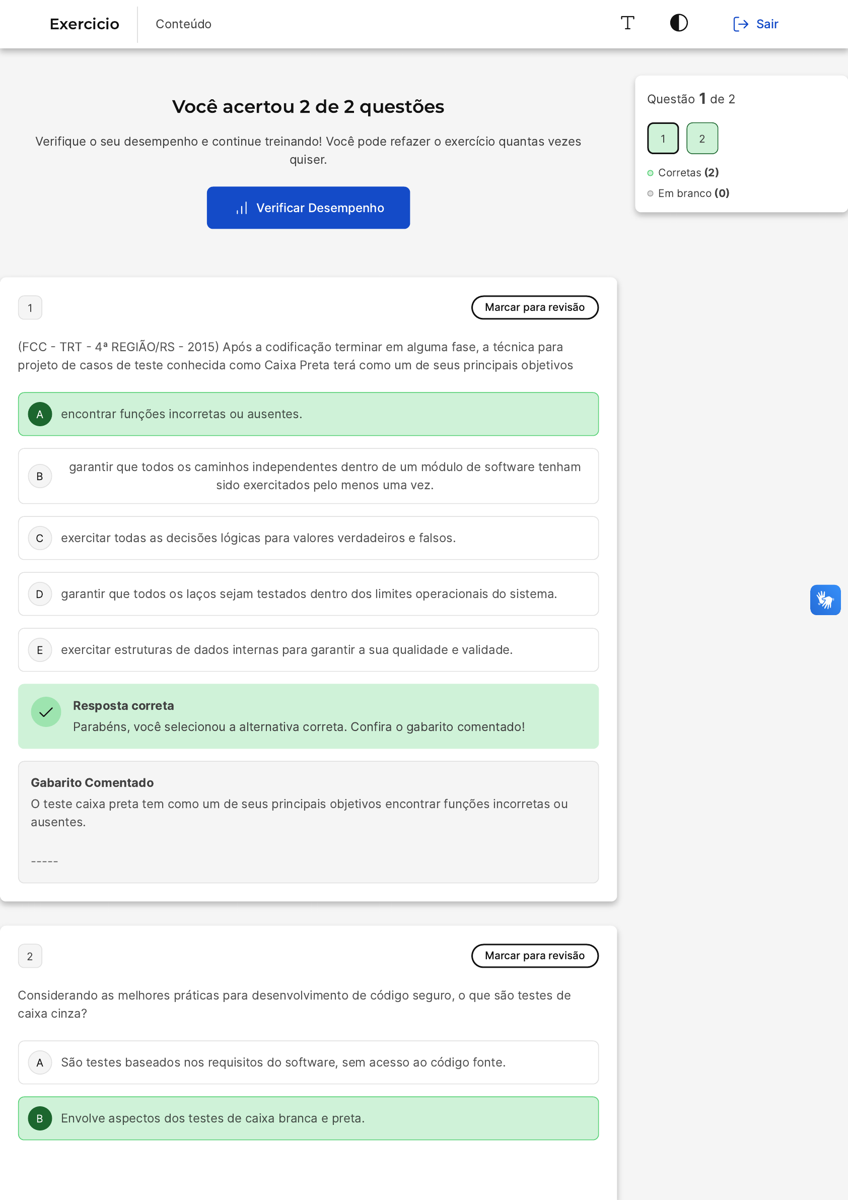 Você acertou 2 de 2 questões Verifique o seu desempenho e continue treinando! Você pode refazer o exercício quantas vezes quiser. Verificar Desempenho A B C D E A B 1 Marcar para revisão �FCC � TRT � 4ª REGIÃO/RS � 2015� Após a codificação terminar em alguma fase, a técnica para projeto de casos de teste conhecida como Caixa Preta terá como um de seus principais objetivos encontrar funções incorretas ou ausentes. garantir que todos os caminhos independentes dentro de um módulo de software tenham sido exercitados pelo menos uma vez. exercitar todas as decisões lógicas para valores verdadeiros e falsos. garantir que todos os laços sejam testados dentro dos limites operacionais do sistema. exercitar estruturas de dados internas para garantir a sua qualidade e validade. Resposta correta Parabéns, você selecionou a alternativa correta. Confira o gabarito comentado! Gabarito Comentado O teste caixa preta tem como um de seus principais objetivos encontrar funções incorretas ou ausentes. ----- 2 Marcar para revisão Considerando as melhores práticas para desenvolvimento de código seguro, o que são testes de caixa cinza? São testes baseados nos requisitos do software, sem acesso ao código fonte. Envolve aspectos dos testes de caixa branca e preta. Questão 1 de 2 Corretas �2� Em branco �0� 1 2 Exercicio Conteúdo Sair C D E São testes com acesso ao código fonte, desse modo podem ser elaborados para verificar partes específicas do sistema. São testes de engenharia social, sem nenhum acesso ao código fonte. São testes triviais feitos por usuários, não pela equipe de desenvolvimento. Resposta correta Parabéns, você selecionou a alternativa correta. Confira o gabarito comentado! Gabarito Comentado Testes de caixa cinza envolve aspectos dos testes de caixa branca e preta. Testes de caixa cinza são testes de segurança que envolvem aspectos dos testes de caixa branca e preta. Testes de caixa branca são testes que são realizados com acesso ao código fonte do software, enquanto testes de caixa preta são testes que são realizados sem acesso ao código fonte do software. Testes de caixa cinza são uma combinação dos dois tipos de testes, pois eles envolvem acesso ao código fonte do software, mas não permitem que o testador altere o código fonte. Isso permite que os testadores verifiquem se o software está funcionando corretamente, sem ter que alterar o código fonte.