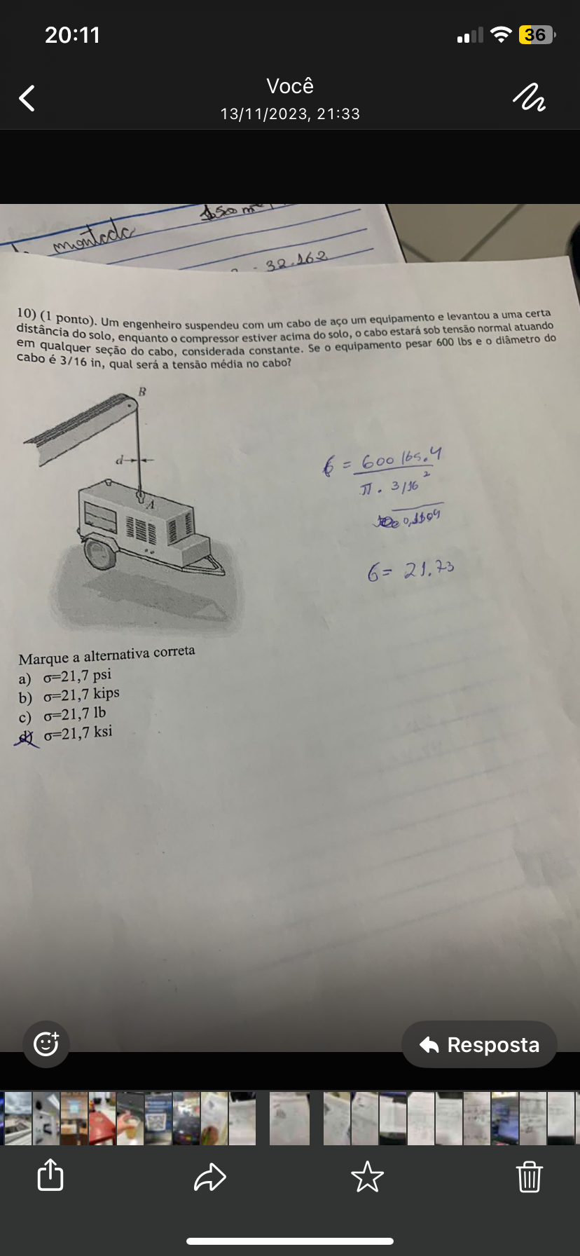 Uma viga rígida AB está apoiada nos dois postes curtos, mostrados na figura a seguir. As hastes AD e BC são feitas de aço e tem diâmetro de 50,0mm....