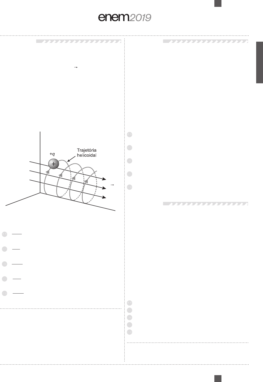 CN - 2º dia | Caderno 7 - AZUL - Página 9 Questão 113 O espectrômetro de massa de tempo de voo é um dispositivo utilizado para medir a massa de íons. Nele, um íon de carga elétrica q é lançado em uma região de campo magnético constante B, descrevendo uma trajetória helicoidal, conforme a figura. Essa trajetória é formada pela composição de um movimento circular uniforme no plano yz e uma translação ao longo do eixo x. A vantagem desse dispositivo é que a velocidade angular do movimento helicoidal do íon é independente de sua velocidade inicial. O dispositivo então mede o tempo t de voo para N voltas do íon. Logo, com base nos valores q, B, N e t, pode-se determinar a massa do íon. y z x B A massa do íon medida por esse dispositivo será A qBt N2� B qBt N� C 2qBt N� D qBt N E 2qBt N Questão 114 Na família Retroviridae encontram-se diversos vírus que infectam aves e mamíferos, sendo caracterizada pela produção de DNA a partir de uma molécula de RNA. Alguns retrovírus infectam exclusivamente humanos, não necessitando de outros hospedeiros, reservatórios ou vetores biológicos. As infecções ocasionadas por esses vírus vêm causando mortes e grandes prejuízos ao desenvolvimento social e econômico. Nesse contexto, pesquisadores têm produzido medicamentos que contribuem para o tratamento dessas doenças. Que avanços tecnológicos têm contribuído para o tratamento dessas infecções virais? A Melhoria dos métodos de controle dos vetores desses vírus. B Fabricação de soros mutagênicos para combate desses vírus. C Investimento da indústria em equipamentos de proteção individual. D Produção de vacinas que evitam a infecção das células hospedeiras. E Desenvolvimento de antirretrovirais que dificultam a reprodução desses vírus. Questão 115 O concreto utilizado na construção civil é um material formado por cimento misturado a areia, a brita e a água. A areia é normalmente extraída de leitos de rios e a brita, oriunda da fragmentação de rochas. Impactos ambientais gerados no uso do concreto estão associados à extração de recursos minerais e ao descarte indiscriminado desse material. Na tentativa de reverter esse quadro, foi proposta a utilização de concreto reciclado moído em substituição ao particulado rochoso graúdo na fabricação de novo concreto, obtendo um material com as mesmas propriedades que o anterior. O benefício ambiental gerado nessa proposta é a redução do(a) A extração da brita. B extração de areia. C consumo de água. D consumo de concreto. E fabricação de cimento. *DO0725AZ9*