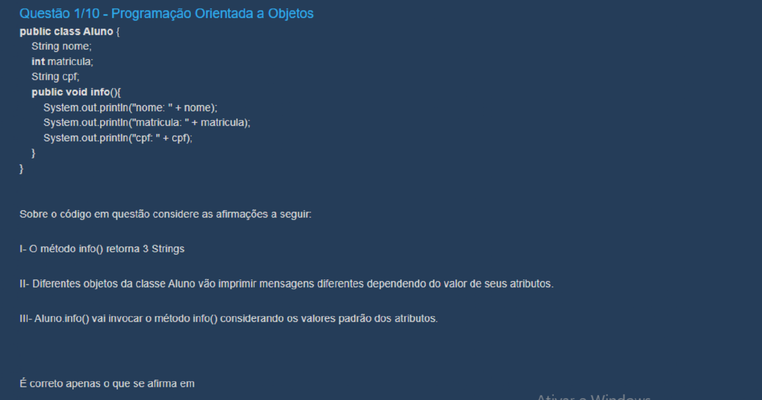(CORRETO) II. Cada método não estático é executado considerando o estado dos atributos do objeto àb! sal ta AudEHasvS
