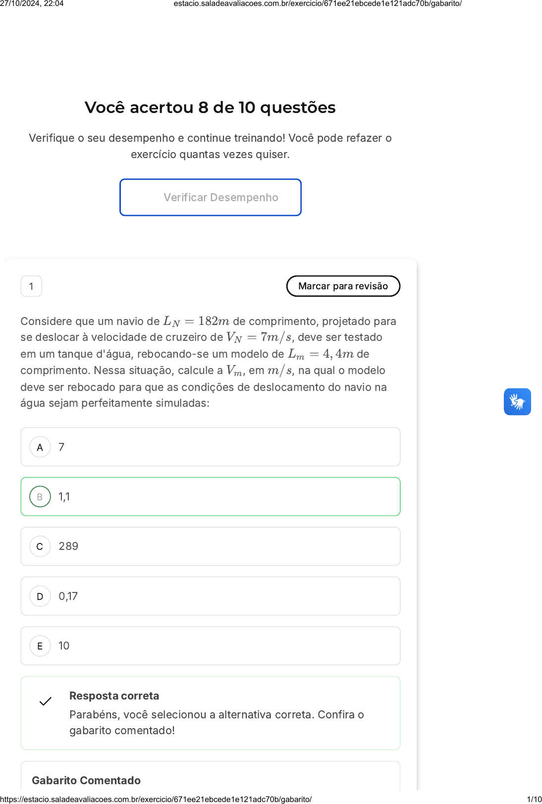 Você acertou 8 de 10 questões Verifique o seu desempenho e continue treinando! Você pode refazer o exercício quantas vezes quiser. Verificar Desempenho A B C D E 1 Marcar para revisão Considere que um navio de de comprimento, projetado para se deslocar à velocidade de cruzeiro de , deve ser testado em um tanque d'água, rebocando-se um modelo de de comprimento. Nessa situação, calcule a , em , na qual o modelo deve ser rebocado para que as condições de deslocamento do navio na água sejam perfeitamente simuladas: LN = 182m VN = 7m/s Lm = 4, 4m Vm m/s 7 1,1 289 0,17 10 Resposta correta Parabéns, você selecionou a alternativa correta. Confira o gabarito comentado! Gabarito Comentado 27/10/2024, 22:04 estacio.saladeavaliacoes.com.br/exercicio/671ee21ebcede1e121adc70b/gabarito/ https://estacio.saladeavaliacoes.com.br/exercicio/671ee21ebcede1e121adc70b/gabarito/ 1/10 A B C D E A resposta correta é: 1,1. A velocidade de um navio é proporcional ao seu comprimento. Portanto, para que as condições de deslocamento do navio na água sejam perfeitamente simuladas, o modelo deve ser rebocado a uma velocidade de 1,1 m/s. 2 Marcar para revisão Se a massa específica do gelo é e da água do mar é , qual é a porcentagem do volume de um iceberg que fica emersa (acima do nível d'água)? 920kg/m3 1025kg/m3 10,2% 89,8% 11,4% 1,0% 20,4% Resposta incorreta Opa! A alternativa correta é a letra A. Confira o gabarito comentado! Gabarito Comentado A resposta correta é: 10,2%. A porcentagem do volume de um iceberg que fica emersa é dada pela razão entre a massa específica do gelo e a massa específica da água do mar. 10,2% � 920 kg/m^3 / 1025 kg/m^3 27/10/2024, 22:04 estacio.saladeavaliacoes.com.br/exercicio/671ee21ebcede1e121adc70b/gabarito/ https://estacio.saladeavaliacoes.com.br/exercicio/671ee21ebcede1e121adc70b/gabarito/ 2/10 A B C D E 3 Marcar para revisão Cada unidade, seja ela para densidade, pressão, viscosidade ou valores adimensionais, tem um papel crucial na precisão e clareza dos cálculos e análises técnicas em ciência e engenharia. Qual é a unidade de densidade? kg/m3 kN/m2 Pa Pa.s Adimensional Resposta correta Parabéns, você selecionou a alternativa correta. Confira o gabarito comentado! Gabarito Comentado A unidade de densidade é tipicamente expressa em quilogramas por metro cúbico kg/m . Isso representa a massa de substância por unidade de volume. 3 4 Marcar para revisão Entre os corpos da Figura a seguir, qual corresponde a uma situação estável, instável e indiferente, respectivamente? 27/10/2024, 22:04 estacio.saladeavaliacoes.com.br/exercicio/671ee21ebcede1e121adc70b/gabarito/ https://estacio.saladeavaliacoes.com.br/exercicio/671ee21ebcede1e121adc70b/gabarito/ 3/10 A B C D E A B A, B e C B, C e A C, A e B C, B e A A, C e B Resposta correta Parabéns, você selecionou a alternativa correta. Confira o gabarito comentado! Gabarito Comentado A resposta correta é: A, C e B 5 Marcar para revisão Um líquido de massa específica igual a 1 kg/m³ escoa por uma calha de comprimento 1,5 m, com velocidade de 7 m/s. Se o número de Reynolds é igual a 2.200, a viscosidade dinâmica é igual a: 4,8x10−3kgm s 4,5x10−3kgm s 27/10/2024, 22:04 estacio.saladeavaliacoes.com.br/exercicio/671ee21ebcede1e121adc70b/gabarito/ https://estacio.saladeavaliacoes.com.br/exercicio/671ee21ebcede1e121adc70b/gabarito/ 4/10 C D E A B C 4,3x10−3kgm s 4,1x10−3kgm s 3,9x10−3kgm s Resposta correta Parabéns, você selecionou a alternativa correta. Confira o gabarito comentado! Gabarito Comentado O número de Reynolds é dado por: Onde: é o número de Reynolds; é a velocidade do fluido; é o comprimento do tubo; é a massa específica do fluido; é a viscosidade dinâmica do fluido. Substituindo os valores dados no enunciado, temos: Portanto, a viscosidade dinâmica é igual a: Re = ρvL μ Re v L ρ μ Re = 1kg/m3∗7m/s∗1,5m 4,8x10−3kgm/s Re = 2200 μ = ρvL Re μ = 1kg/m3∗7m/s∗1,5m 2200 μ = 4, 8x10−3kgm/s 6 Marcar para revisão Para determinado fluido com peso específico de , uma diferença de pressão de corresponde a uma altura de carga, em metros, de: 12.000N/m3 4.800Pa 0,4 2,5 5,8 27/10/2024, 22:04 estacio.saladeavaliacoes.com.br/exercicio/671ee21ebcede1e121adc70b/gabarito/ https://estacio.saladeavaliacoes.com.br/exercicio/671ee21ebcede1e121adc70b/gabarito/ 5/10 D E A B C D E 8,2 12,0 Resposta incorreta Opa! A alternativa correta é a letra A. Confira o gabarito comentado! Gabarito Comentado A resposta correta é: 0,4 7 Marcar para revisão Fora d'água, a massa de um objeto é de e, dentro d'água, . Qual é a massa específica desse material? 50, 0kg 30, 0kg 0, 02kg/m3 0, 01kg/m3 0, 03kg/m3 0, 05kg/m3 0, 08kg/m3 Resposta correta Parabéns, você selecionou a alternativa correta. Confira o gabarito comentado! Gabarito Comentado 27/10/2024, 22:04 estacio.saladeavaliacoes.com.br/exercicio/671ee21ebcede1e121adc70b/gabarito/ https://estacio.saladeavaliacoes.com.br/exercicio/671ee21ebcede1e121adc70b/gabarito/ 6/10 A B C D E A massa específica é a razão entre a massa e o volume. No caso, a massa é de e o volume é de . Portanto, a massa específica é de . 50, 0kg 50, 0 − 30, 0 = 20, 0kg 0, 02kg/m3 8 Marcar para revisão Na produção de petróleo obtido do pré-sal, é comum a instalação de equipamentos em profundidades de . Considerando que a massa específica da água do mar é , calcule a pressão absoluta que esses equipamentos devem suportar: 2000m ρ = 1025kg/m3 20, 11MPa 101, 3kPa 20, 21MPa 2, 15MPa 2, 05MPa Resposta correta Parabéns, você selecionou a alternativa correta. Confira o gabarito comentado! Gabarito Comentado A fórmula da pressão hidrostática é: onde: - é a pressão absoluta. - é a densidade da água do mar �1025 kg/m³). - g é a aceleração da gravidade (aproximadamente 9,81 m/s ). - h é a profundidade �2000m�. - é a pressão atmosférica ao nível do mar (aproximadamente 101,3kPa ou 0,1013MPa). P = ρ ⋅ g ⋅ h