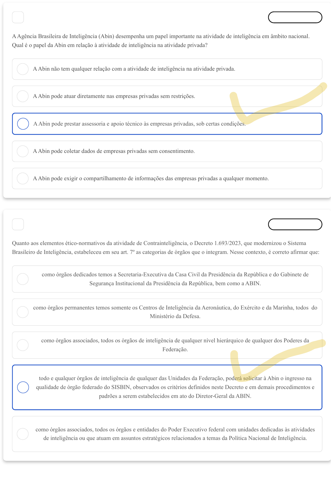 A B C D E A B C D E 1 Marcar para revisão A Agência Brasileira de Inteligência (Abin) desempenha um papel importante na atividade de inteligência em âmbito nacional. Qual é o papel da Abin em relação à atividade de inteligência na atividade privada? A Abin não tem qualquer relação com a atividade de inteligência na atividade privada. A Abin pode atuar diretamente nas empresas privadas sem restrições. A Abin pode prestar assessoria e apoio técnico às empresas privadas, sob certas condições. A Abin pode coletar dados de empresas privadas sem consentimento. A Abin pode exigir o compartilhamento de informações das empresas privadas a qualquer momento. 2 Marcar para revisão Quanto aos elementos ético-normativos da atividade de Contrainteligência, o Decreto 1.693/2023, que modernizou o Sistema Brasileiro de Inteligência, estabeleceu em seu art. 7º as categorias de órgãos que o integram. Nesse contexto, é correto afirmar que: como órgãos dedicados temos a Secretaria-Executiva da Casa Civil da Presidência da República e do Gabinete de Segurança Institucional da Presidência da República, bem como a ABIN. como órgãos permanentes temos somente os Centros de Inteligência da Aeronáutica, do Exército e da Marinha, todos do Ministério da Defesa. como órgãos associados, todos os órgãos de inteligência de qualquer nível hierárquico de qualquer dos Poderes da Federação. todo e qualquer órgãos de inteligência de qualquer das Unidades da Federação, poderá solicitar à Abin o ingresso na qualidade de órgão federado do SISBIN, observados os critérios definidos neste Decreto e em demais procedimentos e padrões a serem estabelecidos em ato do Diretor-Geral da ABIN. como órgãos associados, todos os órgãos e entidades do Poder Executivo federal com unidades dedicadas às atividades de inteligência ou que atuam em assuntos estratégicos relacionados a temas da Política Nacional de Inteligência. A B C D E A B C D E 3 Marcar para revisão No complexo campo da Contrainteligência, cuja missão é salvaguardar as operações de inteligência contra ameaças internas e externas, uma gama de técnicas operacionais é empregada para identificar, neutralizar e mitigar potenciais riscos. Dentre as principais técnicas operacionais de Contrainteligência, identificam-se: o reconhecimento de pessoas, armas, tecnologias e alvos da missão. a infiltração, por meio da identificação e recrutamento de alvos com potencial acesso a informações sensíveis. a identificação de terrenos, infraestruturas e instalações. ações evasivas, como despistar e variar identidade. o recrutamento, com ações para inserção de agentes, informantes ou recursos dentro de grupos, organizações e atividades hostis. 4 Marcar para revisão Na perspectiva da Estratégia Nacional de Inteligência (ENINT), que delineia os novos objetivos estratégicos para a Inteligência brasileira, alguns desses objetivos convergem diretamente com as metas da atividade de contrainteligência. Dentre os novos objetivos estratégicos à Inteligência brasileira, relacionam-se aos objetivos da atividade de contrainteligência: fomentar a cultura de produção do conhecimento na sociedade. terceirizar o processo de gestão de riscos. aprimorar a capacidade de desenvolver e implementar criptografia de Estado. criar protocolos específicos para atuação integrada entre agências diversas. estabelecer temas prioritários para produção de conhecimentos de Inteligência. 5 Marcar para revisão A B C D E A B C D E A técnica de propaganda dirigida representa uma estratégia essencial para lidar com a influência de mensagens adversárias. A respeito desta técnica, dentro dos ensinamentos doutrinários da contraespionagem, é possível afirmar que: consiste em ação para neutralizar ações de Desinformação realizadas por inteligências adversárias e mitigar seu impacto. visa promover uma mensagem específica de forma a influenciar a opinião pública a favor de um determinado grupo, governo ou causa. atua desafiando ou desacreditando as mensagens, narrativas e esforços de Desinformação adversária. atua desafiando ou desacreditando as mensagens, narrativas e esforços de propaganda adversária. envolve a identificação da fonte da propaganda adversária e promoção da verdade. 6 Marcar para revisão A segurança ativa desempenha um papel vital na salvaguarda de informações sensíveis e na proteção contra ameaças adversárias. Quanto à segurança ativa, assinale a alternativa correta: É princípio norteador pelo qual todas as atividades devem se pautar pelo equilíbrio entre segurança e eficácia, observando por isso a legalidade, prevenção, sigilo e controle que o caracterizam. Constitui-se em um conjunto integrado de medidas defensivas para prevenir, detectar e obstruir ameaças. Planeja e implementa normas, planos e medidas à segurança das instalações. Constitui-se em um conjunto de medidas ofensivas para neutralizar ameaças e ações de inteligências adversárias. Planeja e implementa normas, planos e medidas à segurança de recursos materiais e financeiros. 7 Marcar para revisão A vigilância pessoal é um conceito essencial dentro do campo da atividade de inteligência. Vigilância pessoal consiste na: A B C D E A B C D E A B coleta de informações por órgãos de inteligência governamentais. coleta de informações por empresas de segurança privada. coleta de informações por particulares para monitorar indivíduos. coleta de informações por organizações de direitos humanos. coleta de informações por organizações religiosas. 8 Marcar para revisão A regulação das atividades da Agência Brasileira de Inteligência (Abin) é vital para garantir que suas operações estejam em conformidade com a legislação brasileira. Qual é a principal lei que regula as atividades da Agência Brasileira de Inteligência? Lei de Segurança Nacional. Lei do Marco Civi