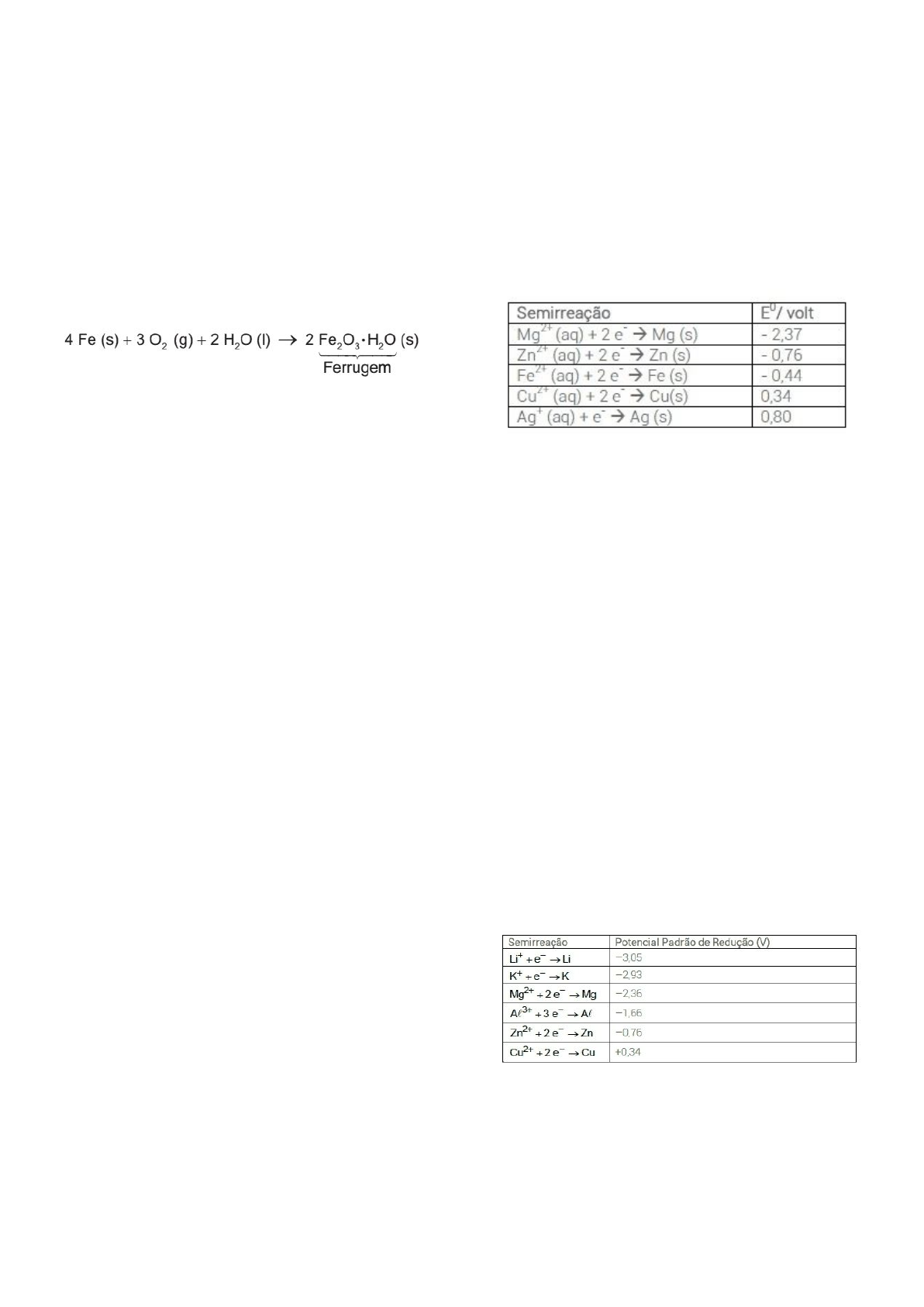 QUÍMICA Pilhas Eletroquímicas 01 - (ENEM) Utensílios de uso cotidiano e ferramentas que contêm ferro em sua liga metálica tendem a sofrer processo corrosivo e enferrujar. A corrosão é um processo eletroquímico e, no caso do ferro, ocorre a precipitação do óxido de ferro(III) hidratado, substância marrom pouco solúvel, conhecida como ferrugem. Esse processo corrosivo é, de maneira geral, representado pela equação química: Uma forma de impedir o processo corrosivo nesses utensílios é a.renovar sua superficie, polindo-a semanalmente. b.evitar o contato do utensílio com o calor, isolando-o termicamente. c.impermeabilizar a superfície, isolando-a de seu contato com o ar úmido. d.esterilizar frequentemente os utensílios, impedindo a proliferação de bactérias. e.guardar os utensílios em embalagens. isolando-os do contato com outros objetos. 02 - (ENEM) Alimentos em conserva são frequentemente armazenados em latas metálicas seladas, fabricadas com um material chamado folha de flandres, que consiste de uma chapa de aço revestida com uma fina camada de estanho, metal brilhante e de difícil oxidação. É comum que a superfície interna seja ainda revestida por uma camada de verniz à base de epóxi, embora também existam latas sem esse revestimento, apresentando uma camada de estanho mais espessa. SANTANA, V. M. S. A leitura e a química das substâncias. Cadernos PDE. Ivaiporã: Secretaria de Estado da Educação do Paraná (SEED); Universidade Estadual de Londrina, 2010 (adaptado). Comprar uma lata de conserva amassada no supermercado é desaconselhável porque o amassado pode a.alterar a pressão no interior da lata, promovendo a degradação acelerada do alimento. b.romper a camada de estanho, permitindo a corrosão do ferro e alterações do alimento. c.prejudicar o apelo visual da embalagem, apesar de não afetar as propriedades do alimento. d.romper a camada de verniz, fazendo com que o metal tóxico estanho contamine o alimento. e.desprender camadas de verniz, que se dissolverão no meio aquoso, contaminando o alimento. 03 - (FATEC) Para responder à questão, considere os seguintes dados sobre potenciais padrão de redução. Uma tubulação de ferro pode ser protegida contra a corrosão se a ela for conectada uma peça metálica constituída por a.magnésio ou prata. b.magnésio ou zinco. c.zinco ou cobre. d.zinco ou prata. e.cobre ou prata. 04 - (ENEM) O boato de que os lacres das latas de alumínio teriam um alto valor comercial levou muitas pessoas a juntarem esse material na expectativa de ganhar dinheiro com sua venda. As empresas fabricantes de alumínio esclarecem que isso não passa de uma "lenda urbana", pois ao retirar o anel da lata, dificulta-se a reciclagem do alumínio. Como a liga do qual é feito o anel contém alto teor de magnésio, se ele não estiver junto com a lata, fica mais fácil ocorrer a oxidação do alumínio no forno. A tabela apresenta as semirreações e os valores de potencial padrão de redução de alguns metais: Disponível em: www.sucatas.com. Acesso em: 28 fev. 2012 (adaptado). Com base no texto e na tabela, que metais poderiam entrar na composição do anel das latas com a mesma função do magnésio, ou seja, proteger o alumínio da oxidação nos fornos e não deixar diminuir o rendimento da sua reciclagem? a.Somente o lítio, pois ele possui o menor potencial de redução. b.Somente o cobre, pois ele possui o maior potencial de redução. c.Somente o potássio, pois ele possui potencial de redução mais próximo do magnésio. d.Somente o cobre e o zinco, pois eles sofrem oxidação mais facilmente que o alumínio. e.Somente o lítio e o potássio, pois seus potenciais de redução são menores do que o do alumínio. 05 - (ENEM) TEXTO I Biocélulas combustíveis são uma alternativa tecnológica para substituição das baterias convencionais Em uma biocélula microbiológica, bactérias catalisam reações de oxidação de substratos orgânicos. Liberam elétrons produzidos na respiração celular para um eletrodo, onde fluem por um circuito externo até o cátodo do sistema, produzindo corrente elétrica. Uma reação típica que ocorre em biocélulas microbiológicas utiliza o acetato como substrato. AQUINO NETO, S. Preparação e caracterização de bioanodos para biocélula a combustível etanol/ O2. Disponível em: www.teses.usp.br. Acesso em: jun. 2015 (adaptado) TEXTO II Em sistemas bioeletroquímicos, os potenciais padrão (E°’) apresentam valores característicos. Para as biocélulas de acetato, considere as seguintes semirreações de redução e seus respectivos potenciais: Nessas condições, qual é o número mínimo de biocélulas de acetato, ligadas em série, necessárias para se obter uma diferença de potencial de 4,4 V? a.3 b.4 c.6 d.9 e.15 06 - (FUVEST) Um método largamente aplicado para evitar a corrosão em estruturas de aço enterradas no solo, como tanques e dutos, é a proteção catódica com um metal de sacrifício. Esse método consiste em conectar a estrutura a ser protegida, por meio de um fio condutor, a uma barra de um metal diferente e mais facilmente oxidável, que, com o passar do tempo, vai sendo corroído até que seja necessária sua substituição. Um experimento para identificar quais metais podem ser utilizados como metal de sacrifício consiste na adição de um pedaço de metal a diferentes soluções contendo sais de outros metais, conforme ilustrado, e cujos resultados são mostrados na tabela. O símbolo ( + ) indica que foi observada uma reação química e o ( – ) indica que não se observou qualquer reação química. Da análise desses resultados, conclui se que pode(m) ser utilizado(s) como metal(is) de sacrifício para tanques de aço: a.Al e Zn. b.somente Sn. c.Al e Sn. d.somente Al. e.Sn e Zn. 07 - (ENEM) Para que apresente condutividade elétrica adequada a muitas aplicações, o cobre bruto obtido por métodos térmicos é purificado eletroliticamente. N