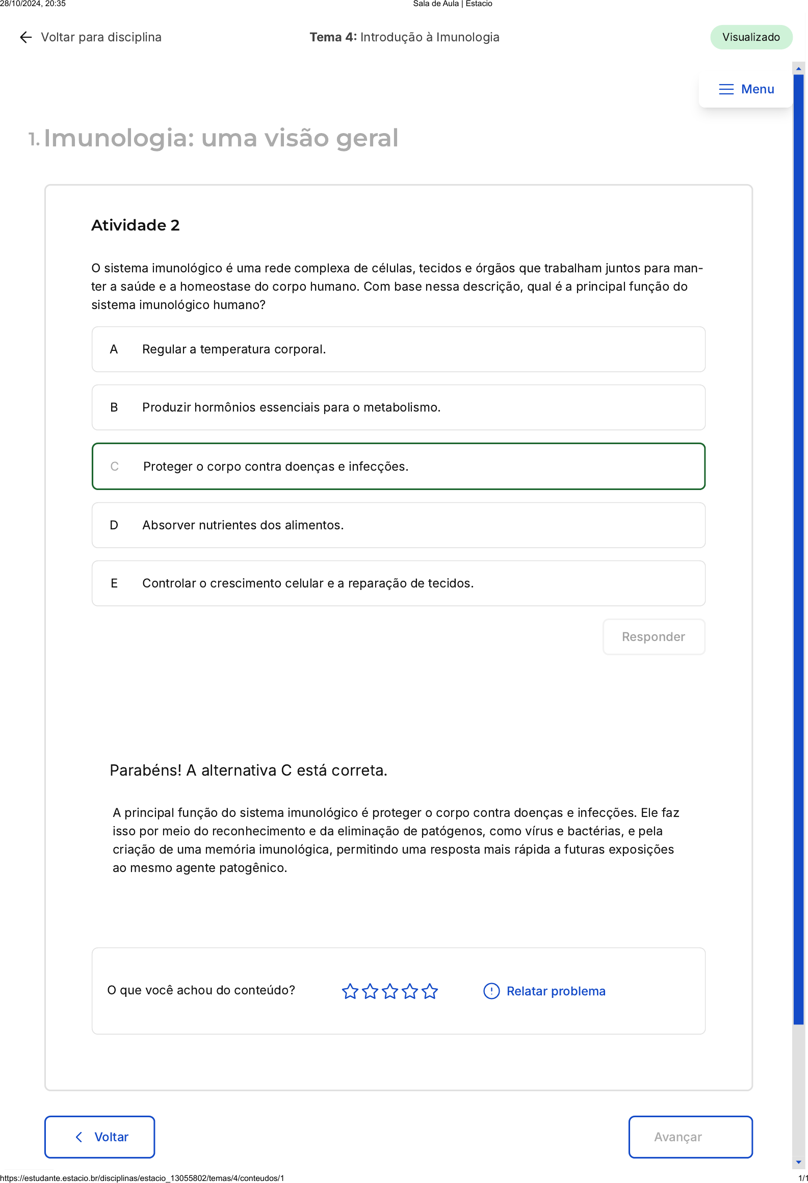 Cursando: Biomedicina A Olá ANDREA ASSIS 1. Imunologia: uma visão geral Atividade 2 O sistema imunológico é uma rede complexa de células, tecidos e órgãos que trabalham juntos para man- ter a saúde e a homeostase do corpo humano. Com base nessa descrição, qual é a principal função do sistema imunológico humano? A Regular a temperatura corporal. B Produzir hormônios essenciais para o metabolismo. C Proteger o corpo contra doenças e infecções. D Absorver nutrientes dos alimentos. E Controlar o crescimento celular e a reparação de tecidos. Parabéns! A alternativa C está correta. O que você achou do conteúdo? Responder A principal função do sistema imunológico é proteger o corpo contra doenças e infecções. Ele faz isso por meio do reconhecimento e da eliminação de patógenos, como vírus e bactérias, e pela criação de uma memória imunológica, permitindo uma resposta mais rápida a futuras exposições ao mesmo agente patogênico. Relatar problema Voltar Avançar Menu Voltar para disciplina Tema 4� Introdução à Imunologia Visualizado 28/10/2024, 20:35 Sala de Aula | Estacio https://estudante.estacio.br/disciplinas/estacio_13055802/temas/4/conteudos/1 1/1